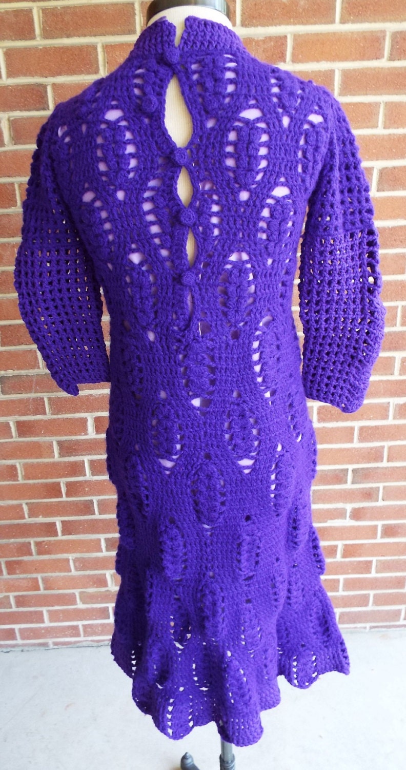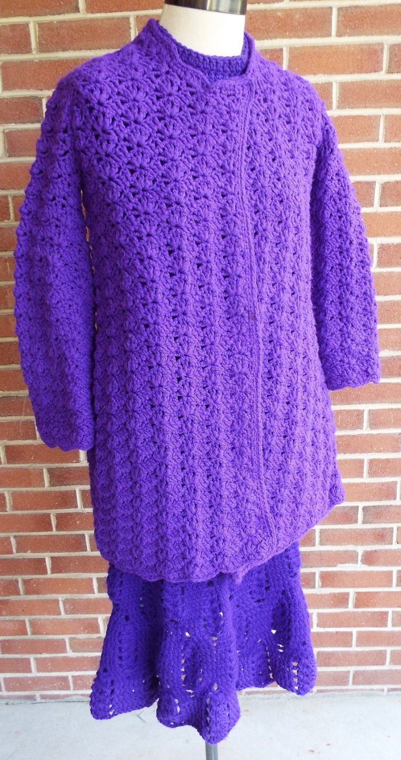 Here is an amazing knit dress and jacket set in a rich two tone purple color. No tag, and looks to be handmade. I have no idea the age, but it seems older to me. Built around a vintage looking slip. And whoever did this really knew what they were doing. The quality is top notch. Dress has a six button back. Jacket has a double snap at collar. I can't say enough about how incredible this set is!! Here are the exact measurements. (be sure to reference the last photo to see how I measure dresses) Here are the measurements of the dress: