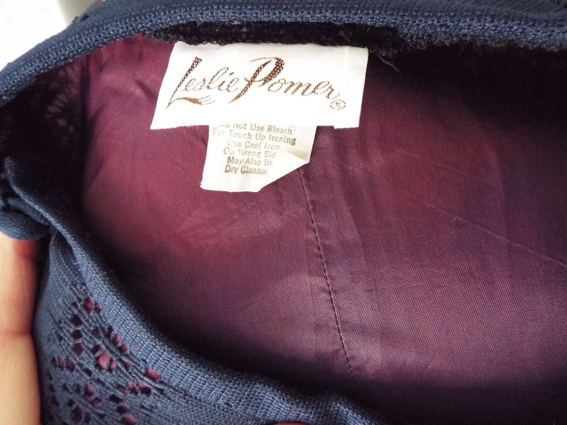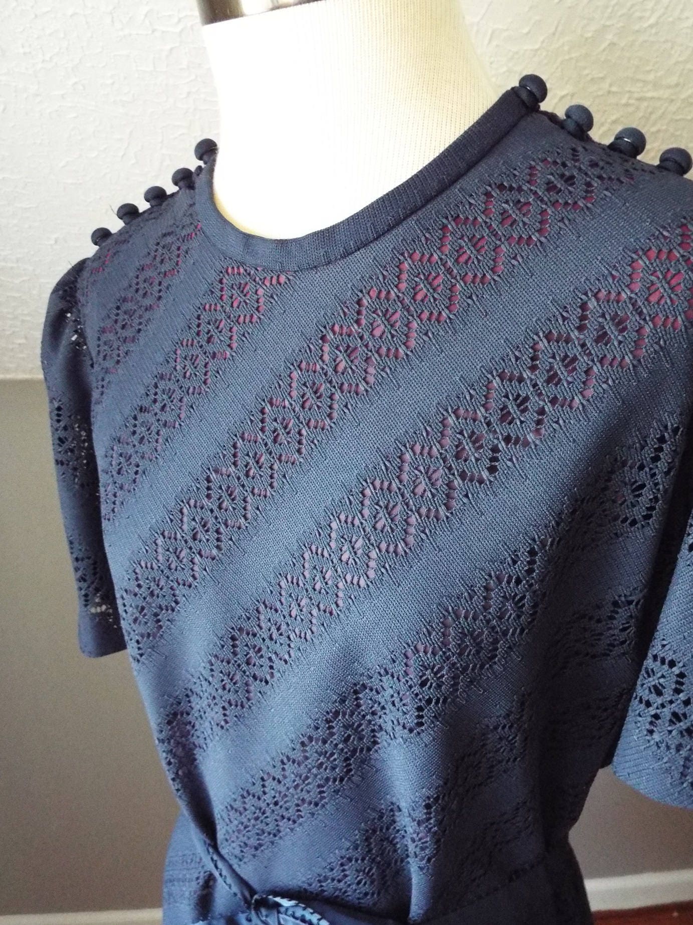 Here is a gorgeous short sleeve dress by Leslie Pomer. Made in the USA. Feels like a poly blend. Dark blue lacy fabric with a purple slip layer underneath. Five buttons on each shoulder, blue ribbon belt. Like, it's literally blue ribbon. Not, it's an award winning belt. Timeless and adorable, in amazing shape, and years of life left! Here are the exact measurements. (be sure to reference the last photo to see how I measure dresses) Here are the measurements: