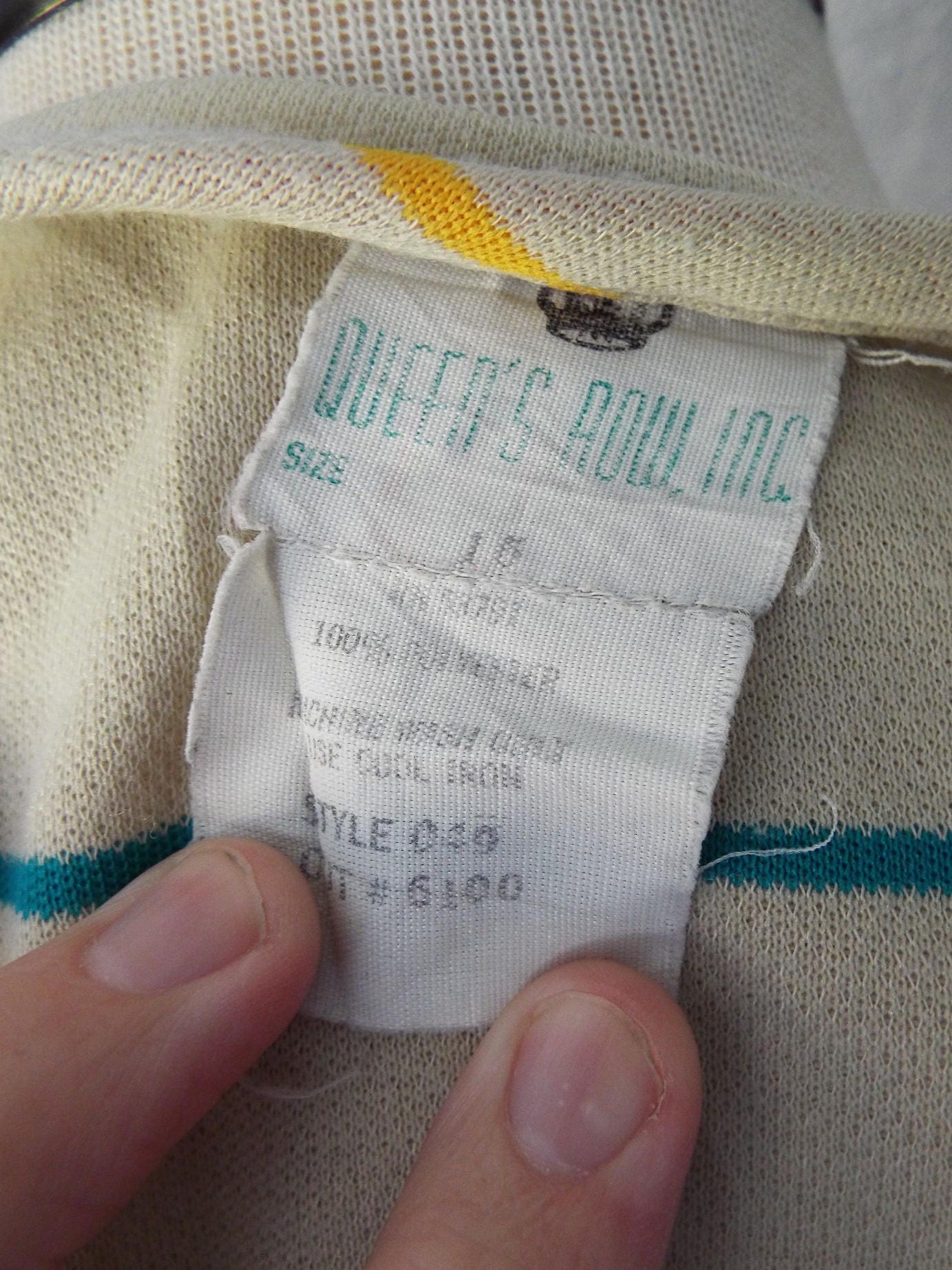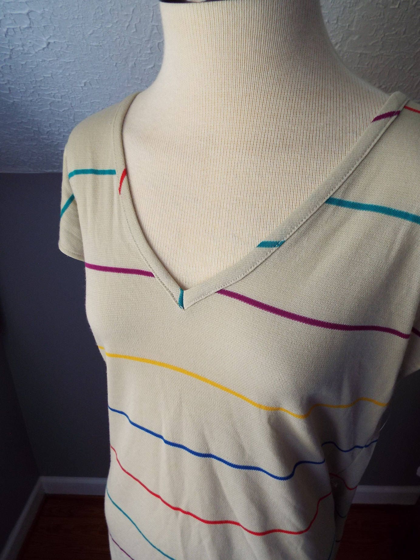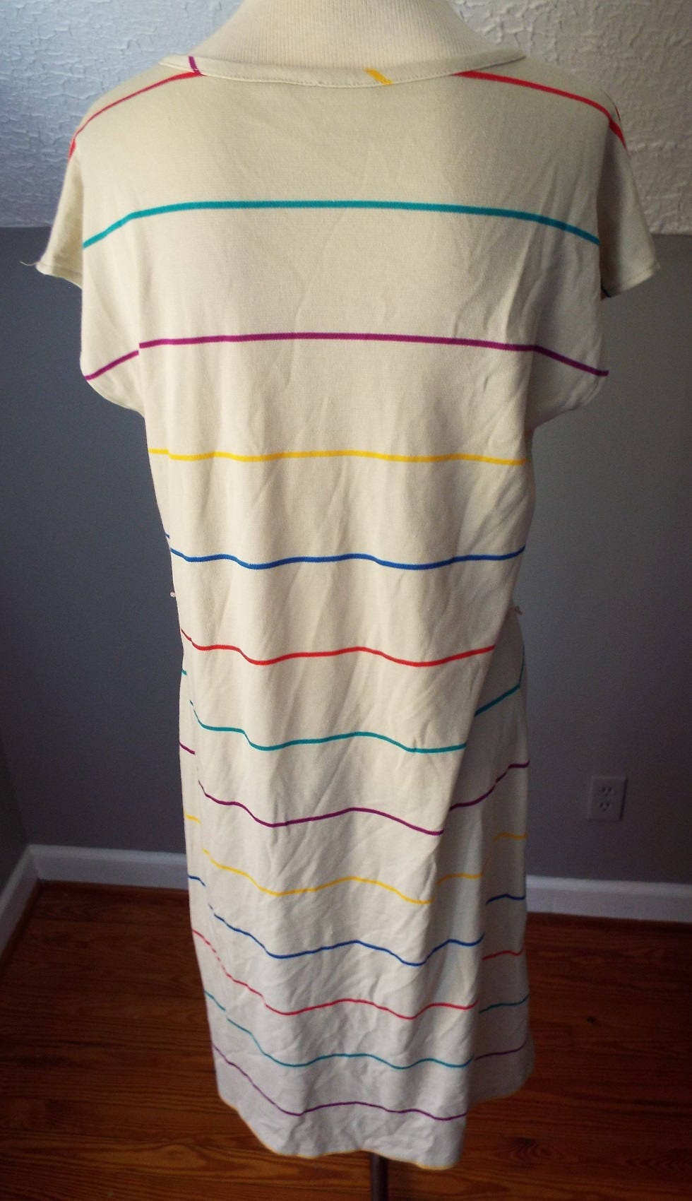 Here is an adorable little sleeveless dress by Queen's Row INC. 100% polyester. Sandy beige color with horizontal striping of red, green, purple, yellow, and blue. Light weight, fairly sheer, and amazingly soft and comfy. Slightly pilly near the top, but otherwise this one is in excellent shape with tons of life left. The tag says either size 15 or 16, kinda hard to make out. Here are the measurements. (please refer to the last photo above to see how I measure dresses)