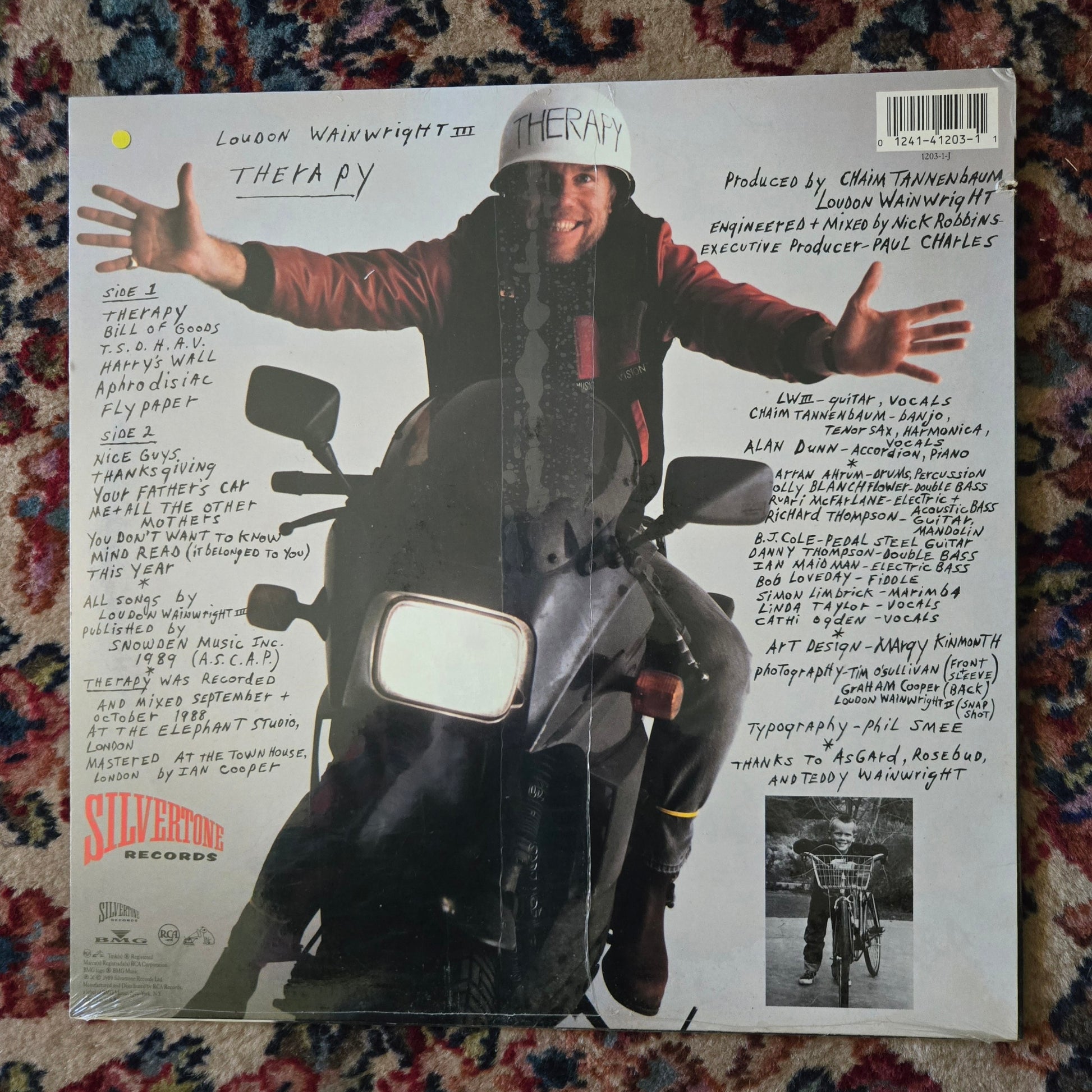 Here is a brand new, never opened, new old stock copy of "Therapy" by Loudon Wainwright. Catalog number 1203-1-J from 1989. Still in original shrink wrap. The jacket is in excellent condition with a notch cut out in the upper left. I'm assuming the album to be mint. If you have any questions, please get in touch.