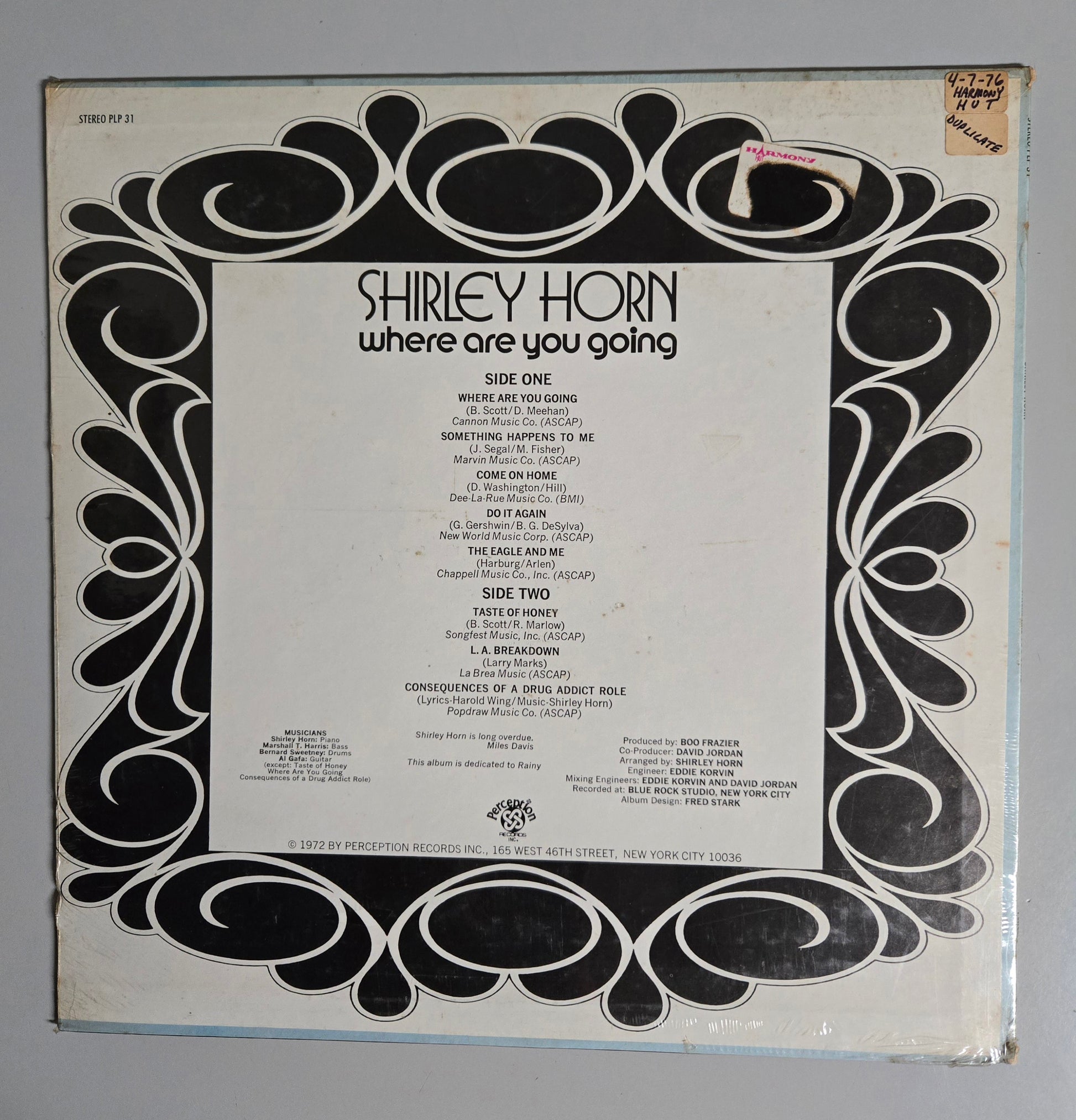 I am selling some titles from my father's amazing jazz collection. Here is a copy of "Where Are You Going" by Shirley Horn. Perception Stereo pressing, PLP31. Copyright says 1972, he purchased it in 1976. It's never been opened, still in it's original shrink! There are a few minor dents on the jacket, but no notches or cutouts. Album is assumed Mint. If you have any questions, please let me know. Check out my other listings for more great jazz LPs!
