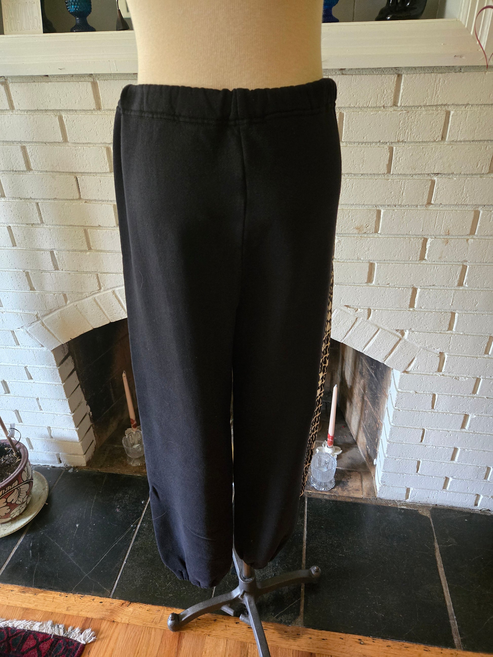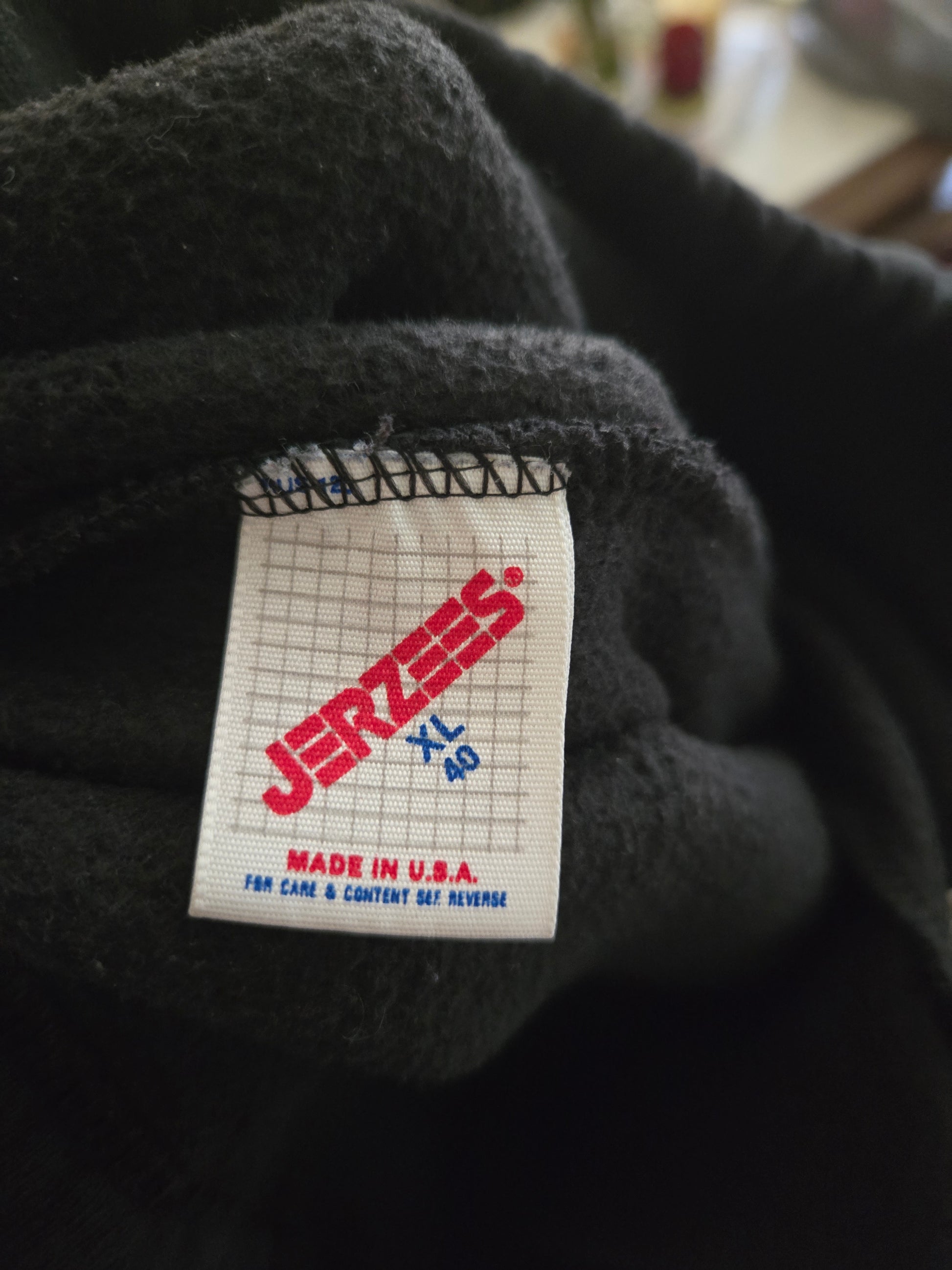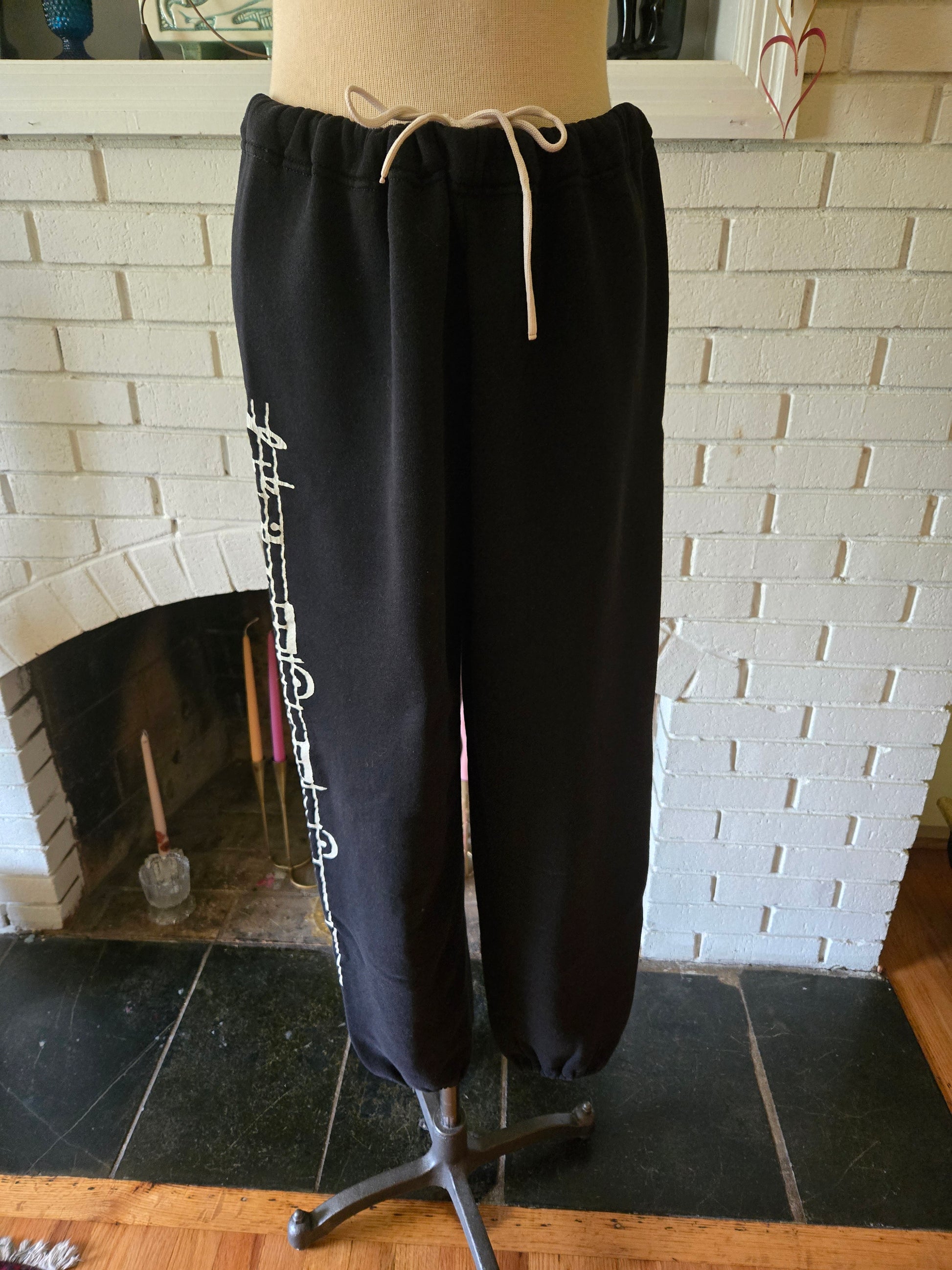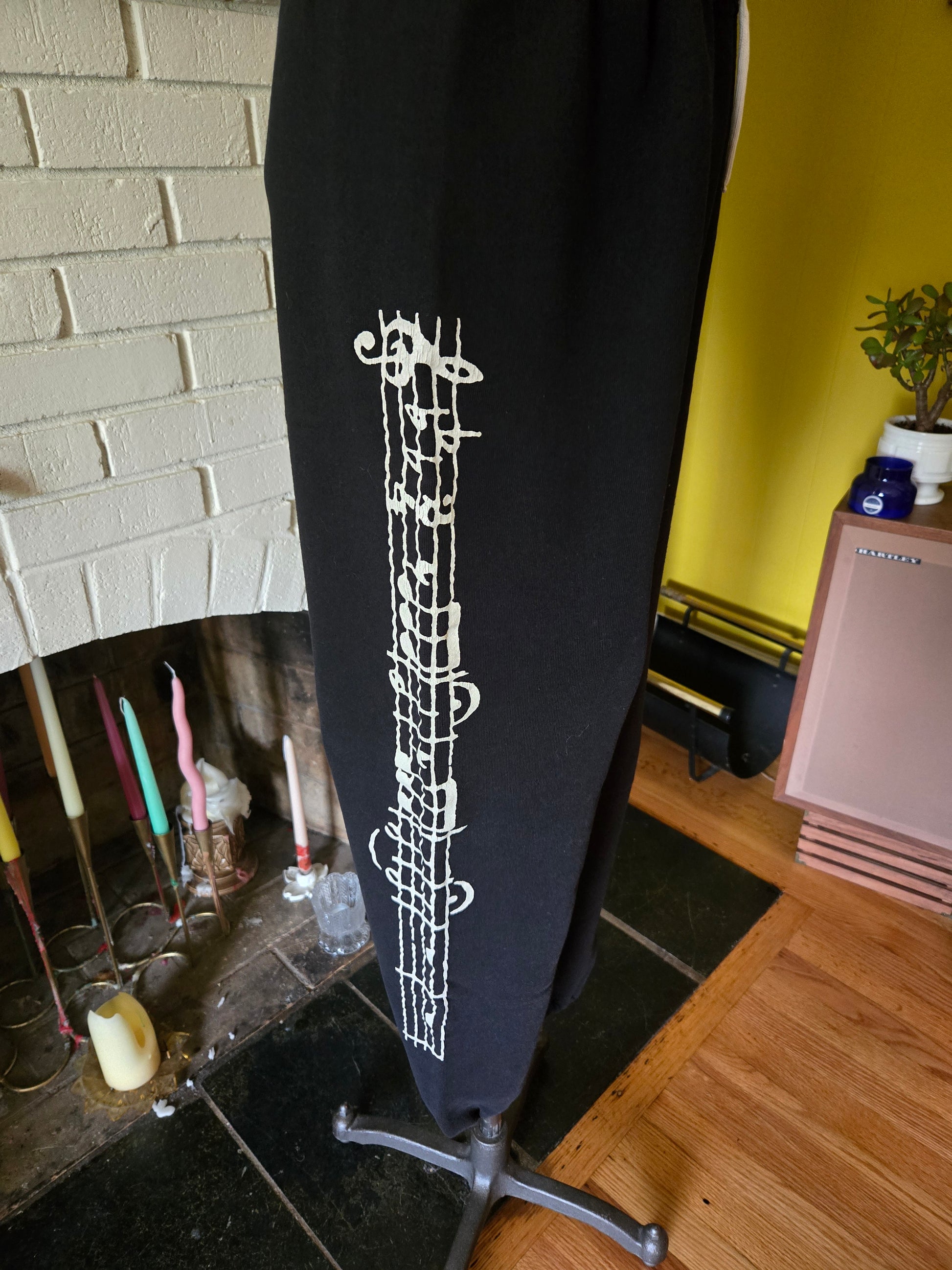 Here is an amazing pair of vintage sweatpants from the 1980s/90s by Jerzees. 50/50 cotton and polyester blend, and made in USA. Jet black pants with Beethoven's Fifth Symphony music down the right leg in white. Drawstring waist and elastic at the cuffs. Medium weight, soft and comfy. They are in excellent condition with years of life left! The tag says XL, but here are the measurements taken laying flat: