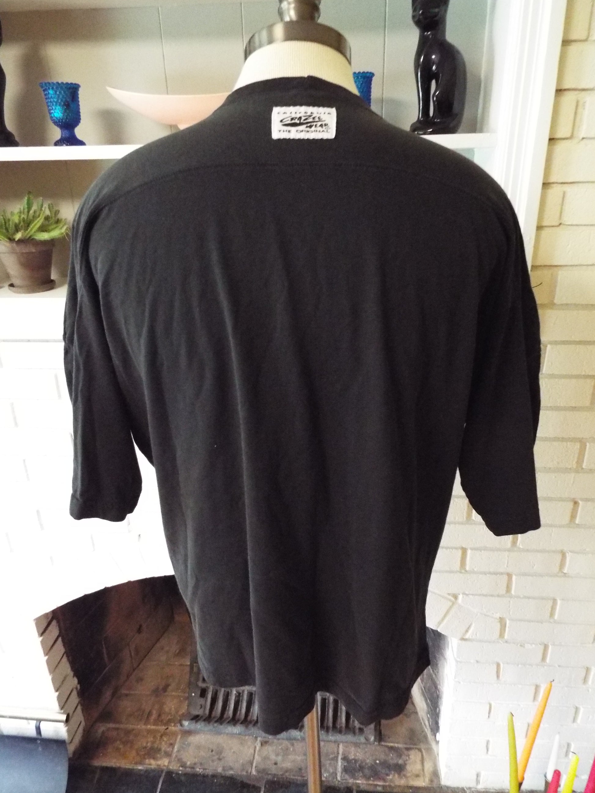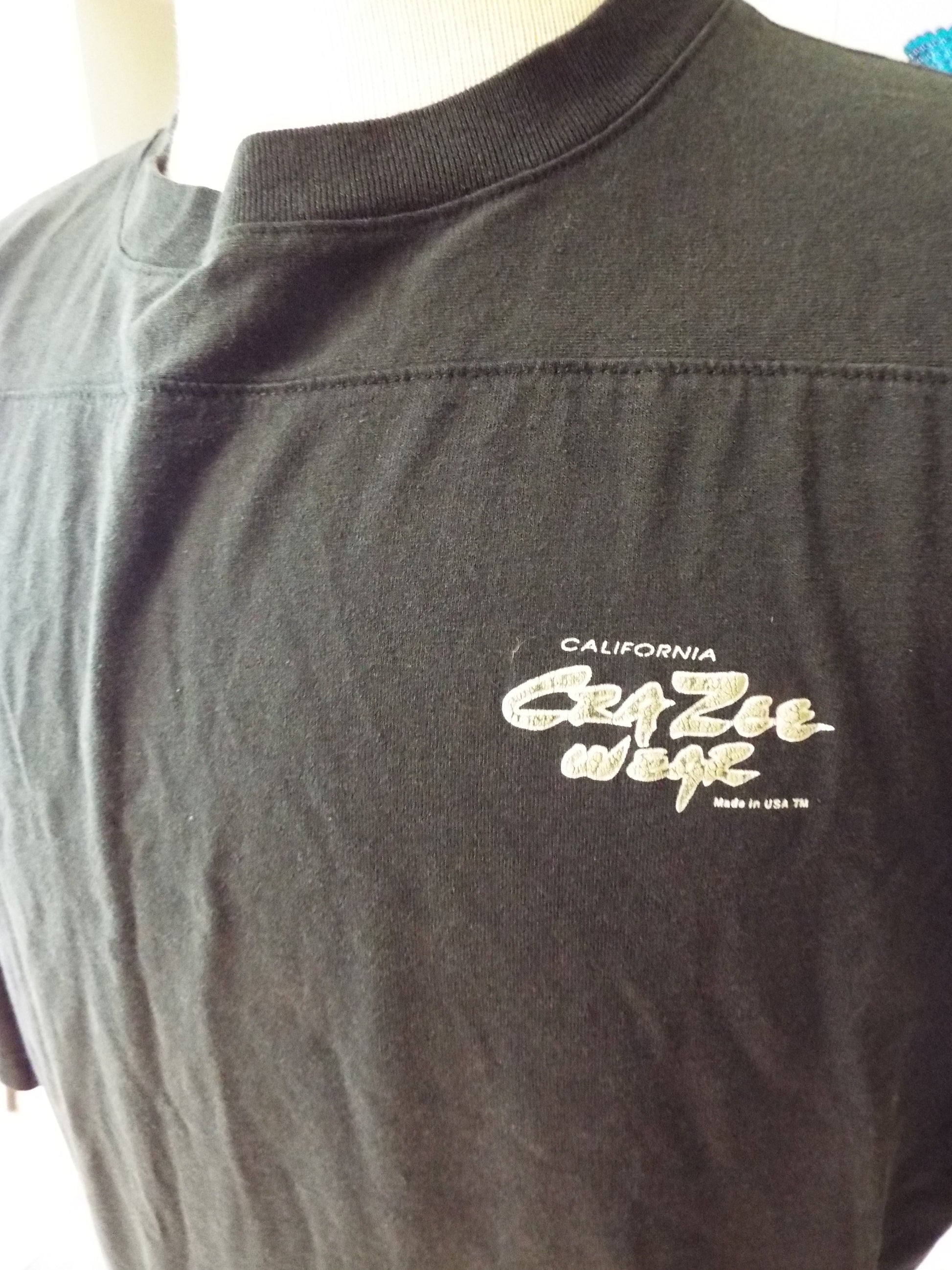 Here is an awesome vintage t-shirt by California Crazee Wear. 100% cotton and made in the USA. Jet black shirt with logo on the left breast in white and gray, and tag in the middle back just under the collar. Medium weight, soft, and comfy. It's in great condition with tons of life left! The tag says Medium, but here are the measurements taken laying flat. (refer to the last pic above to see how I measure shirts)