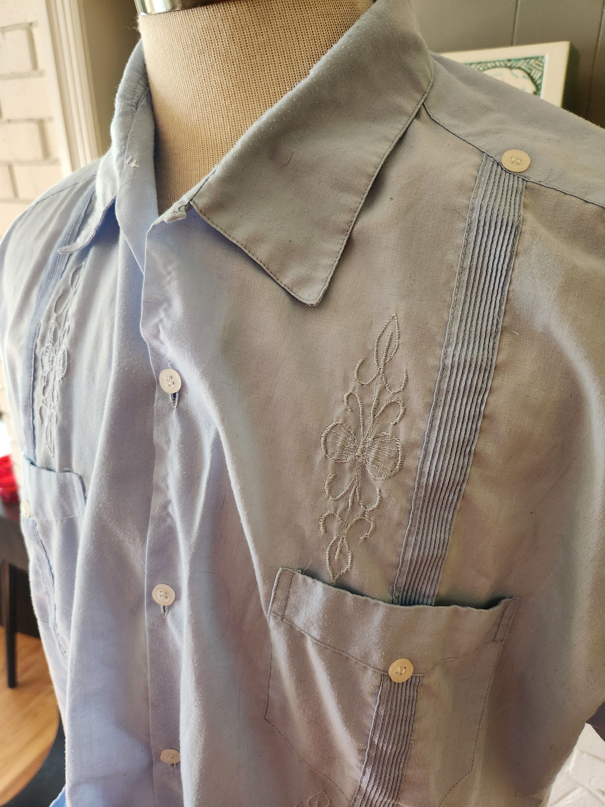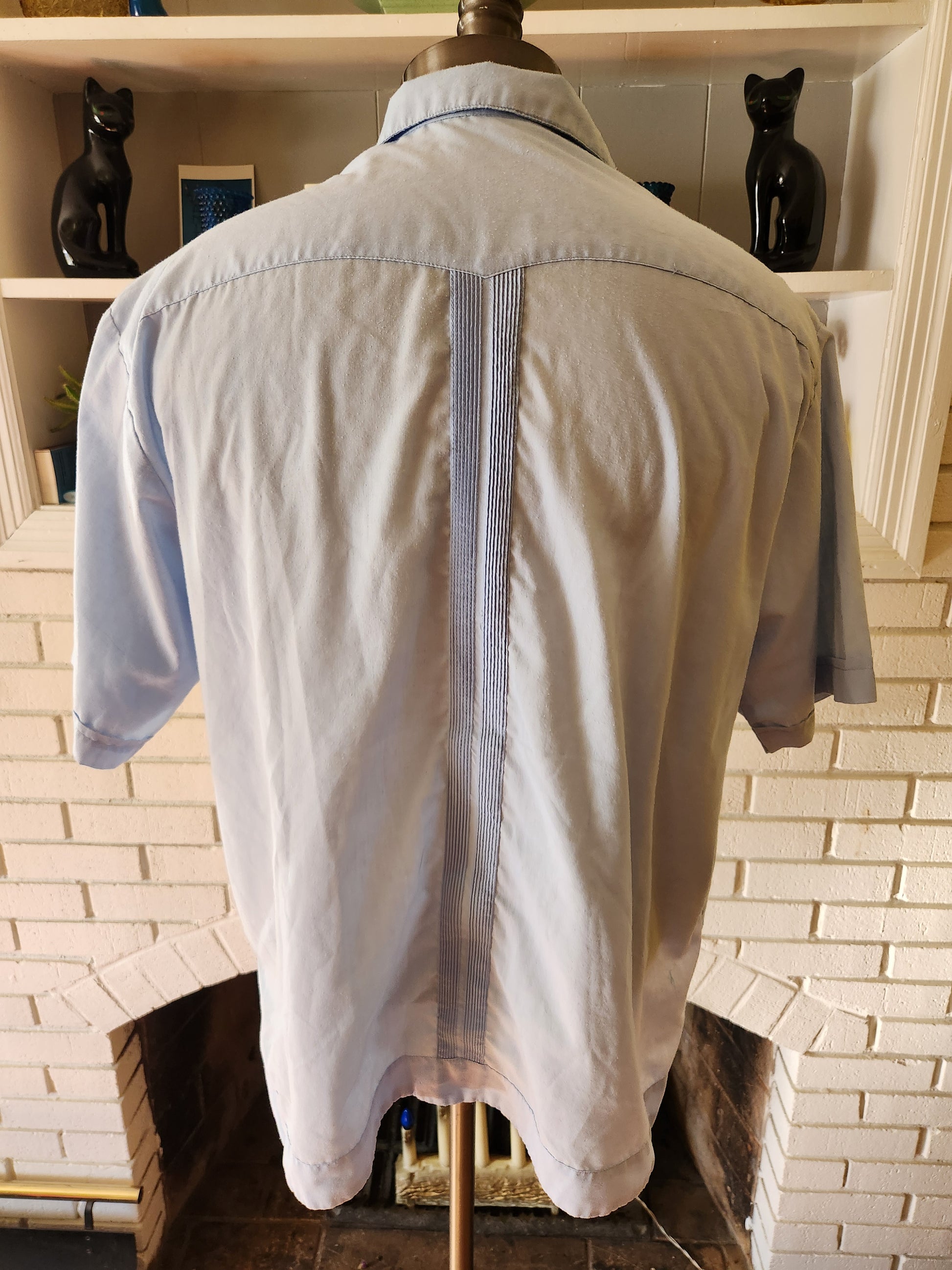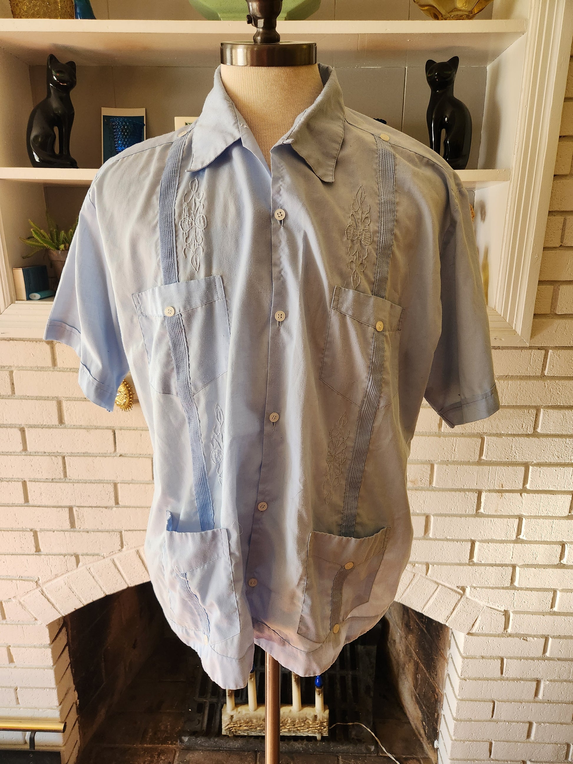 Here is a super handsome vintage shirt by Maya Real. Feels like a blend of cotton and poly, and made in Mexico. Light blue shirt with lighter blue stitching, and darker blue striping. Six button front, with a decorative buttoned pocket on each breast and each hip. The button at the top of the right hip pocket is missing. I'd remove the button at the very top of the collar and use it on the pocket. Slightly pilly around the collar, but in otherwise excellent condition with tons of life left. Fairly light weight, soft, and comfy. The tag says T-8, but here are the measurements taken laying flat.