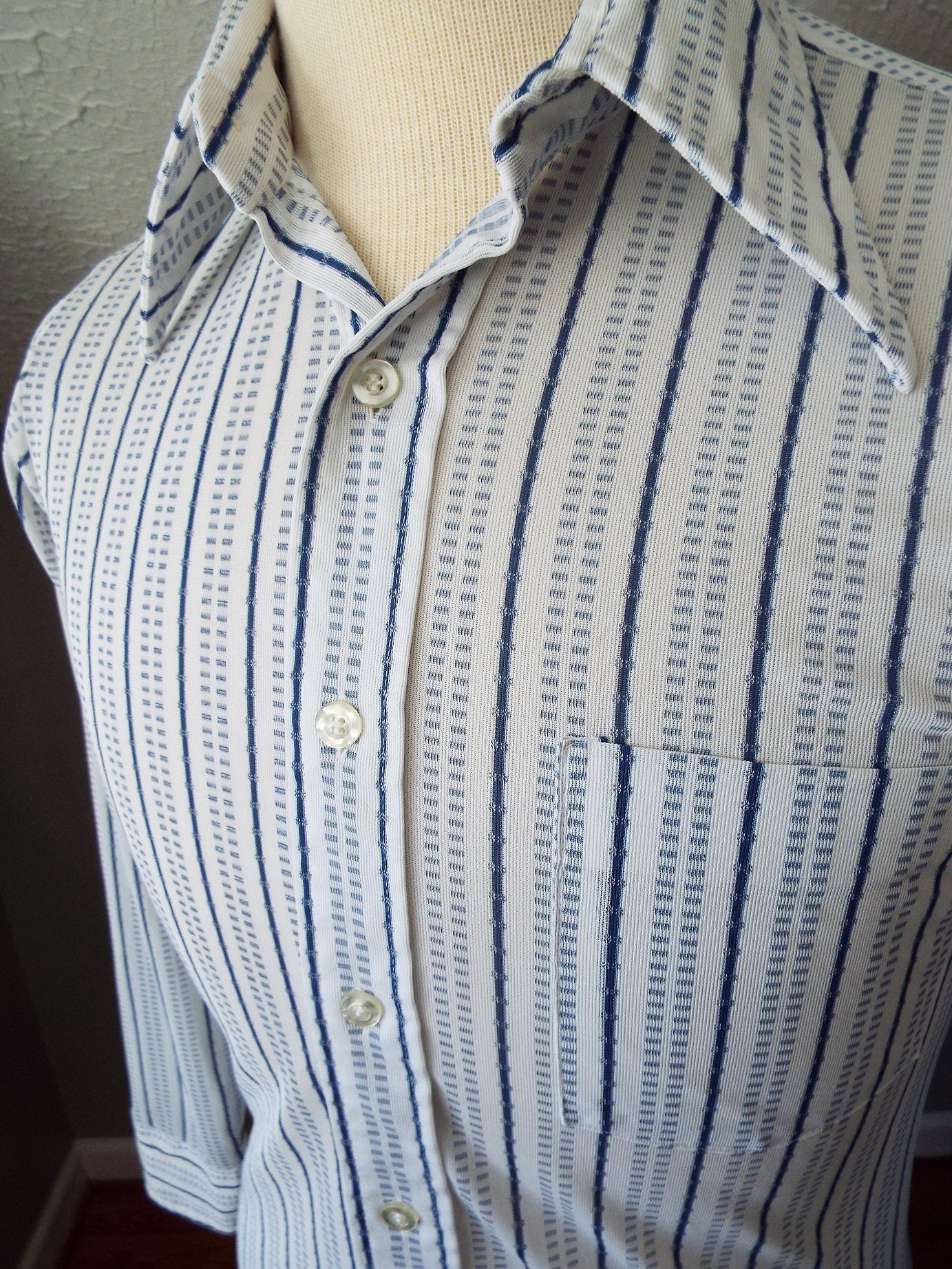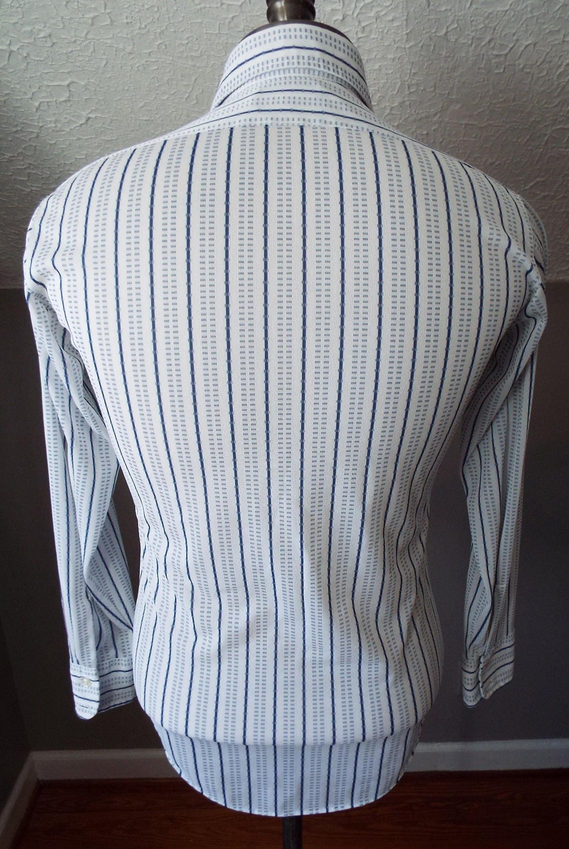 Here is a handsome long sleeve button down shirt by JC Penney Towncraft. Feels like all polyester. Wonderful striped pattern of dark blue on white. Seven button front, two on each cuff, pocket on the left breast. Fairly sheer and lightweight. This shirt is in amazing shape with years of life left! Tag says 14 1/2 - 32, but here are the measurements. (please refer to last photo to see how I measure men's shirts)