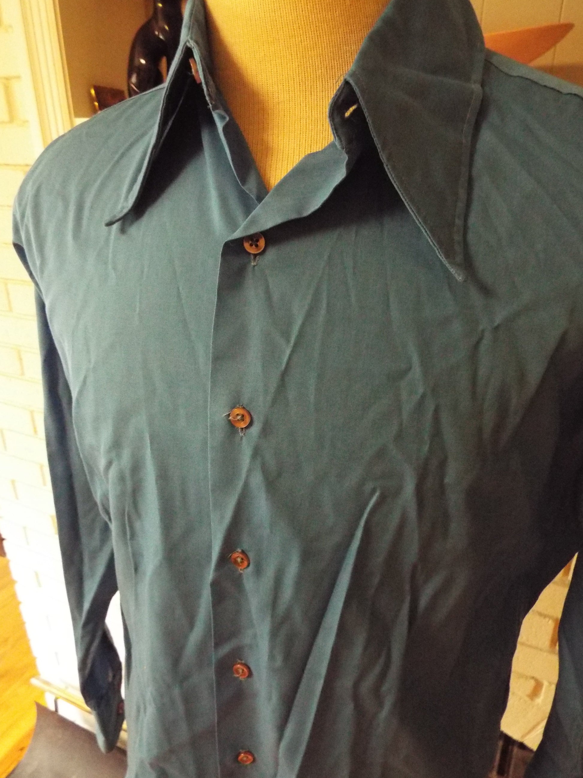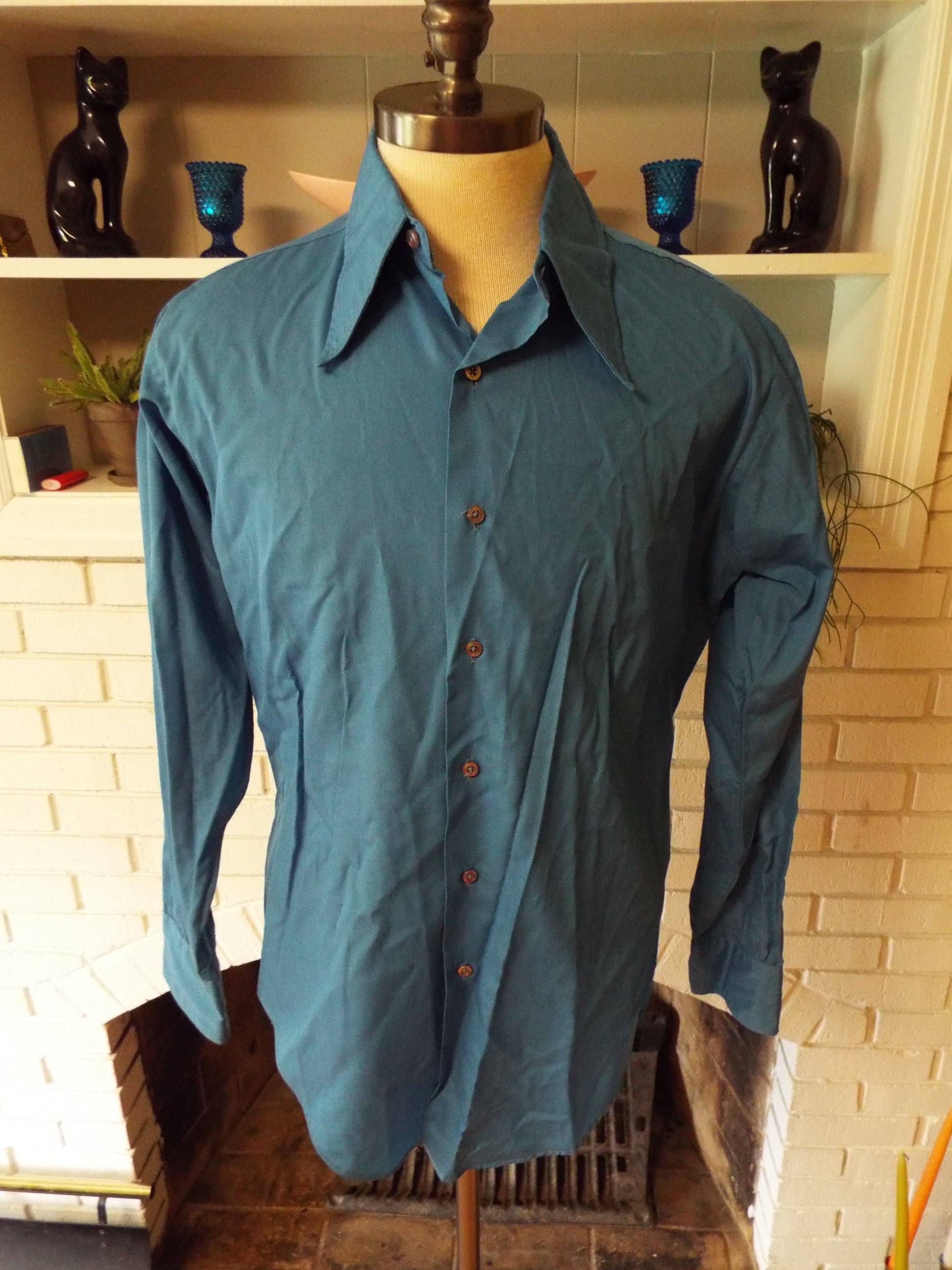 Here is a handsome long sleeve button down shirt by Jean Jack. 65% poly, 35% cotton. Great light steel blue fabric. Seven button front with two buttons on each cuff. Fairly thin, soft, and comfy. This shirt is in amazing shape with years of life left! The tag says large, but here are the measurements taken laying flat. (please refer to last photo to see how I measure men's shirts)