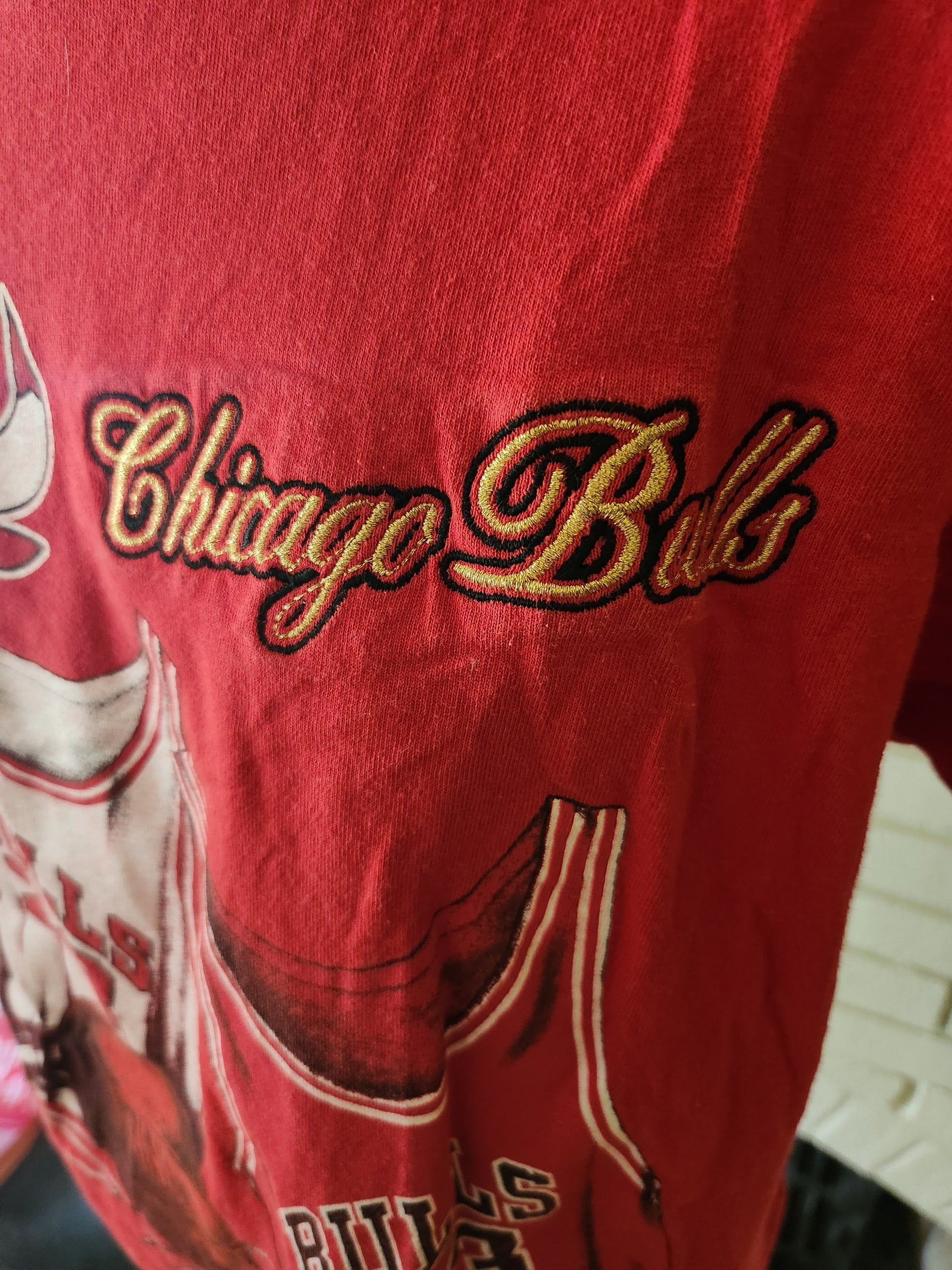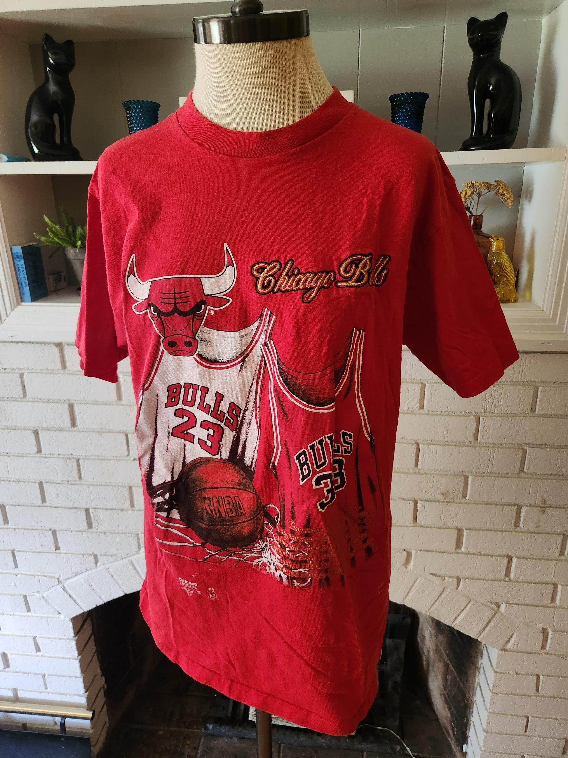 Here is an amazing vintage Chicago Bulls T-shirt by Nutmeg Mills. 100% cotton and made in the USA. Red shirt with bold graphic, facts about the team, and team name embroidered in striking gold thread. It's most likely from 1992 or early 1993, since the facts section references the 91-92 back to back championships. I can't find another one like this on the internet, which doesn't happen very often. It is in amazing condition with tons of life left! The tag says Large, but here are the measurements taken laying flat (please refer to the last pic to see how I measure shirts)