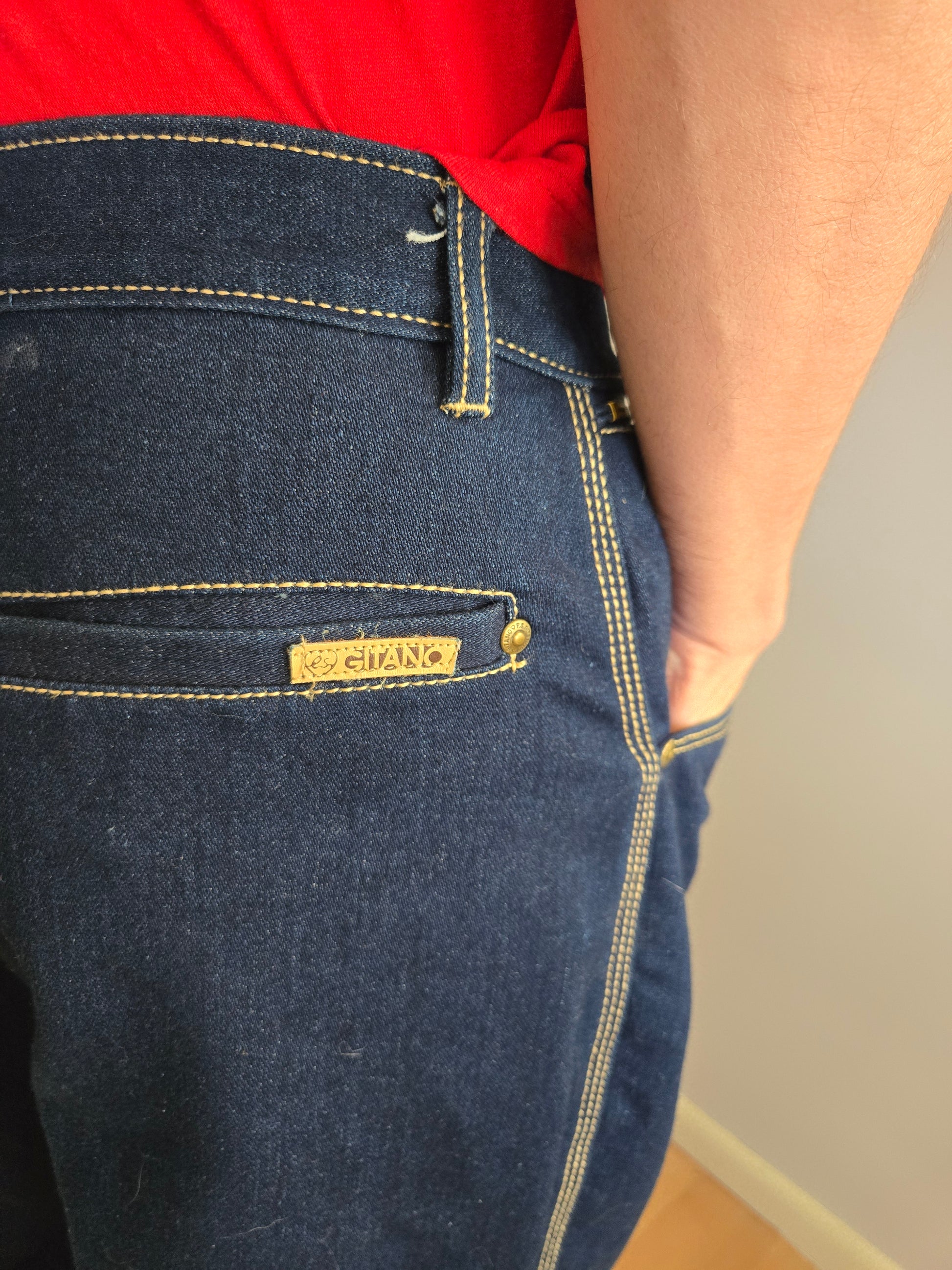 Here is an awesome pair of blue jeans from the 80s by Gitano. 45% cotton, 31% rayon, 24% polyester. These read more feminine to me, but they fit me really well (33"-ish waist, 6'4" tall). Perfect dark blue with tan stitching. Button and zipper front, two pockets on the front...with a bonus zippered pocket on the right side, two pockets on the back. These feel almost unworn. Medium weight, comfy, and in excellent condition with years of life left! The tag says 34 Regular, but here are the measurements taken laying flat: