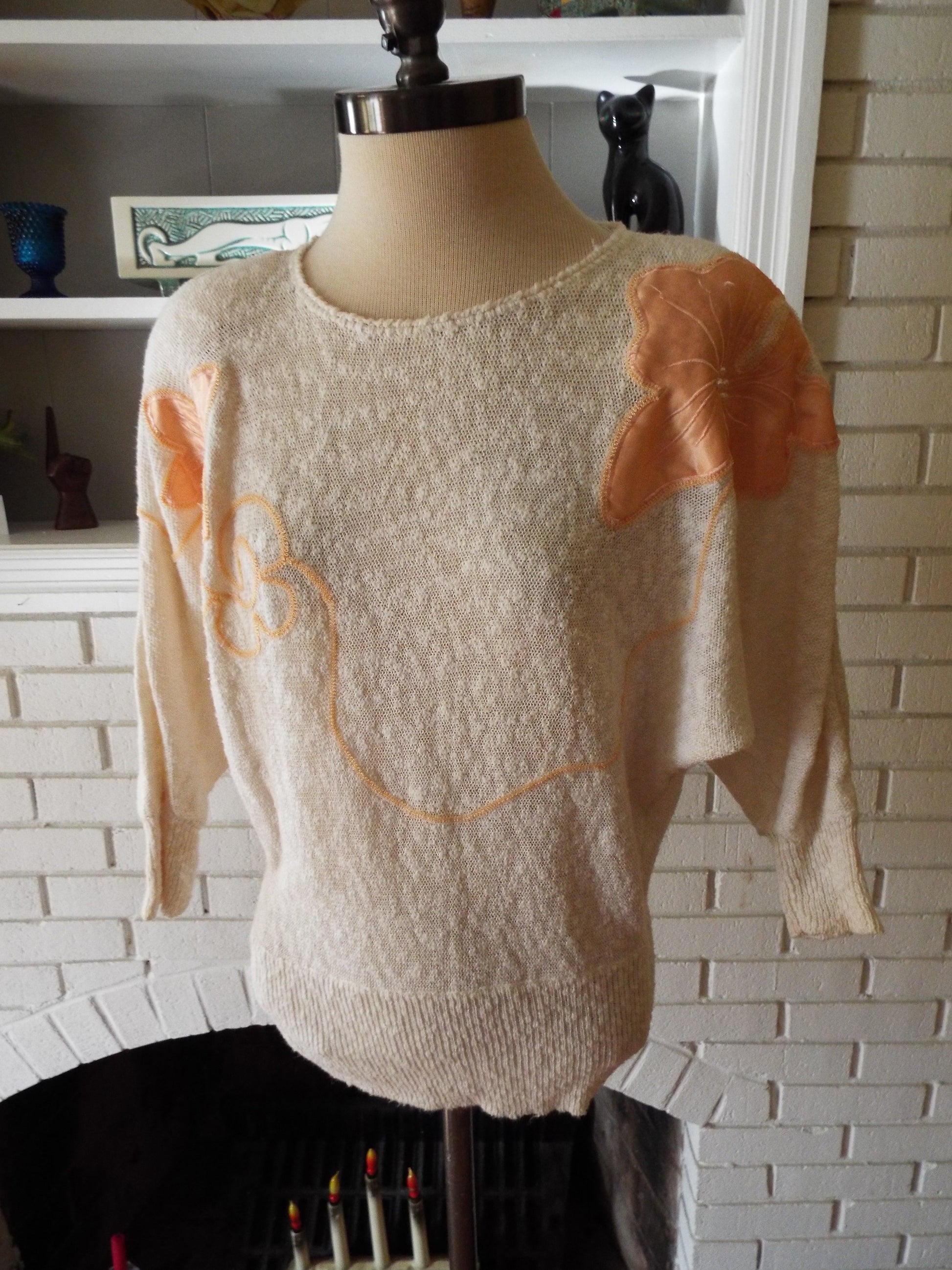 Here is an awesome vintage sweater by Cloudburst Collection. 55% linen, 45%. Beautiful soft white knit with gorgeous pink bejeweled flowers. Large shoulder pads are present. Fairly light weight, super soft and comfy. It's in amazing condition, and has years of life left. The tag says Medium, but here are the measurements taken laying flat. (refer to the last pic above to see how I measure shirts)