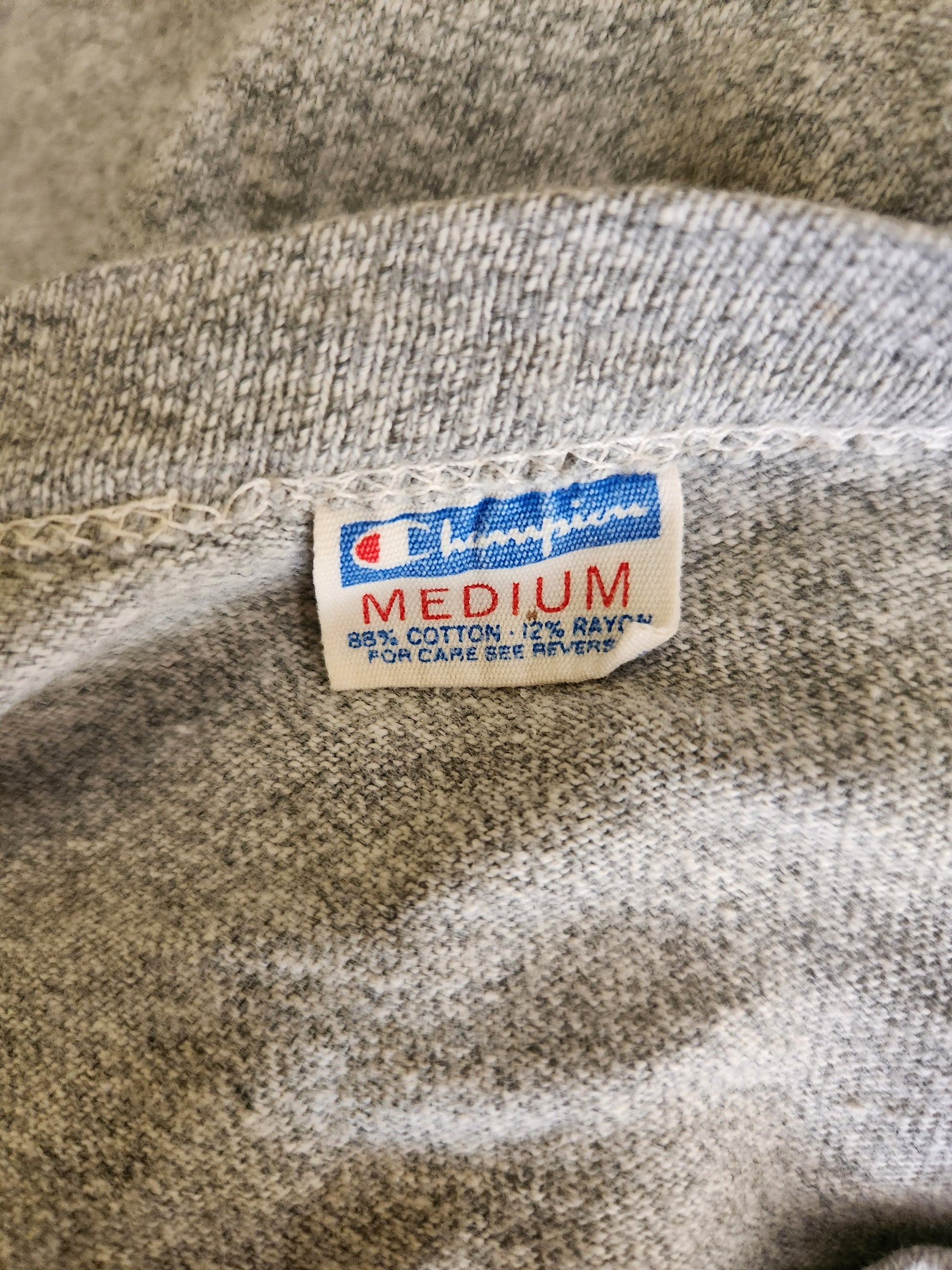 Here is a great vintage T-shirt by Champion. 88% cotton, 12% rayon, and made in the USA. I think this is from the mid to late 70s. Heather gray shirt with great ironed on Bultaco motorcycles graphic on the front in black. This one is fairly light, soft, and comfy. There is one small hole on the front, and a few very small, light stains. Honestly though, they are super hard to see against the color of the fabric. It's in otherwise amazing condition with tons of life left. The tag says Medium, but here are the measurements taken laying flat (please refer to the last pic to see how I measure shirts)