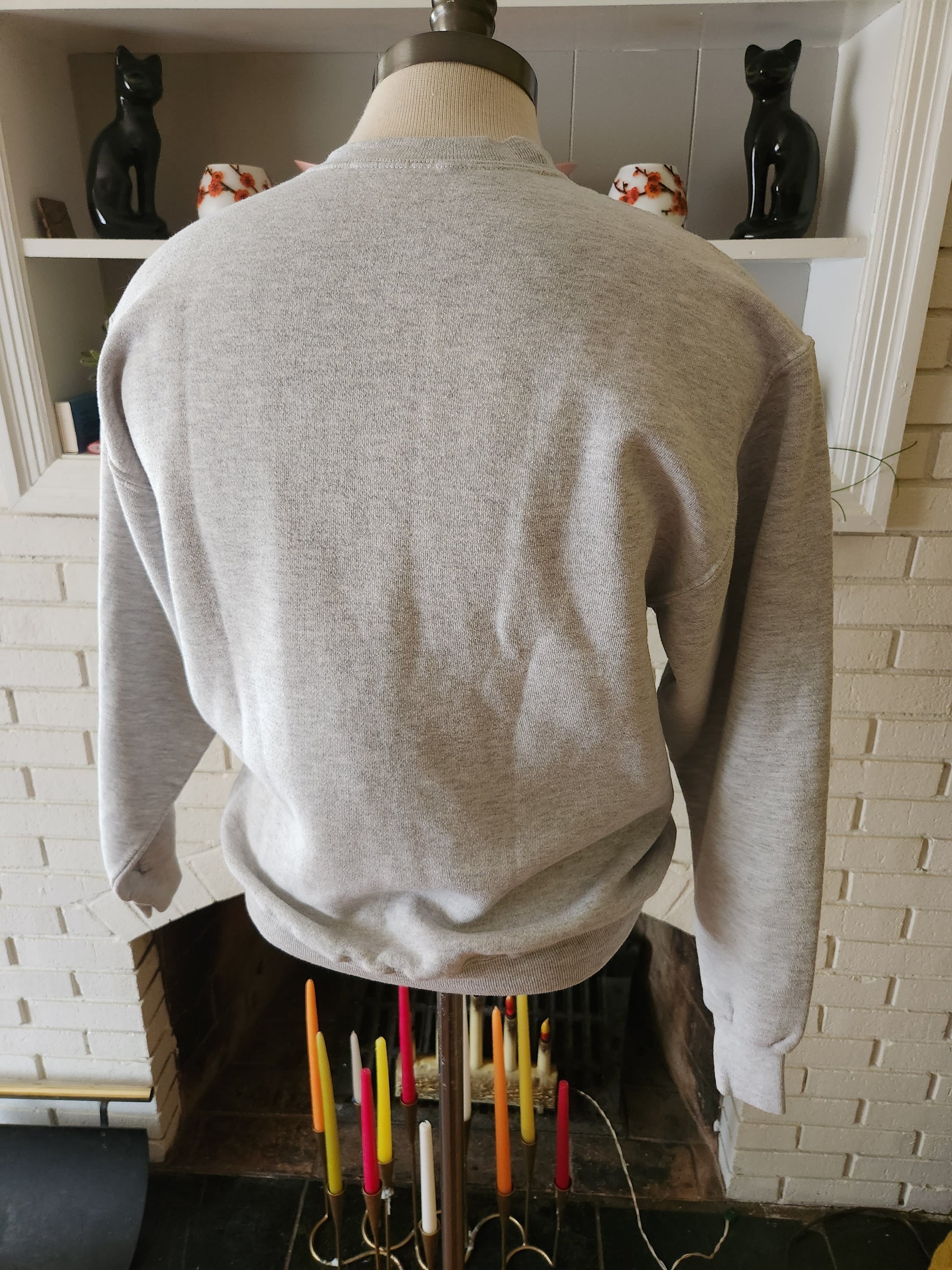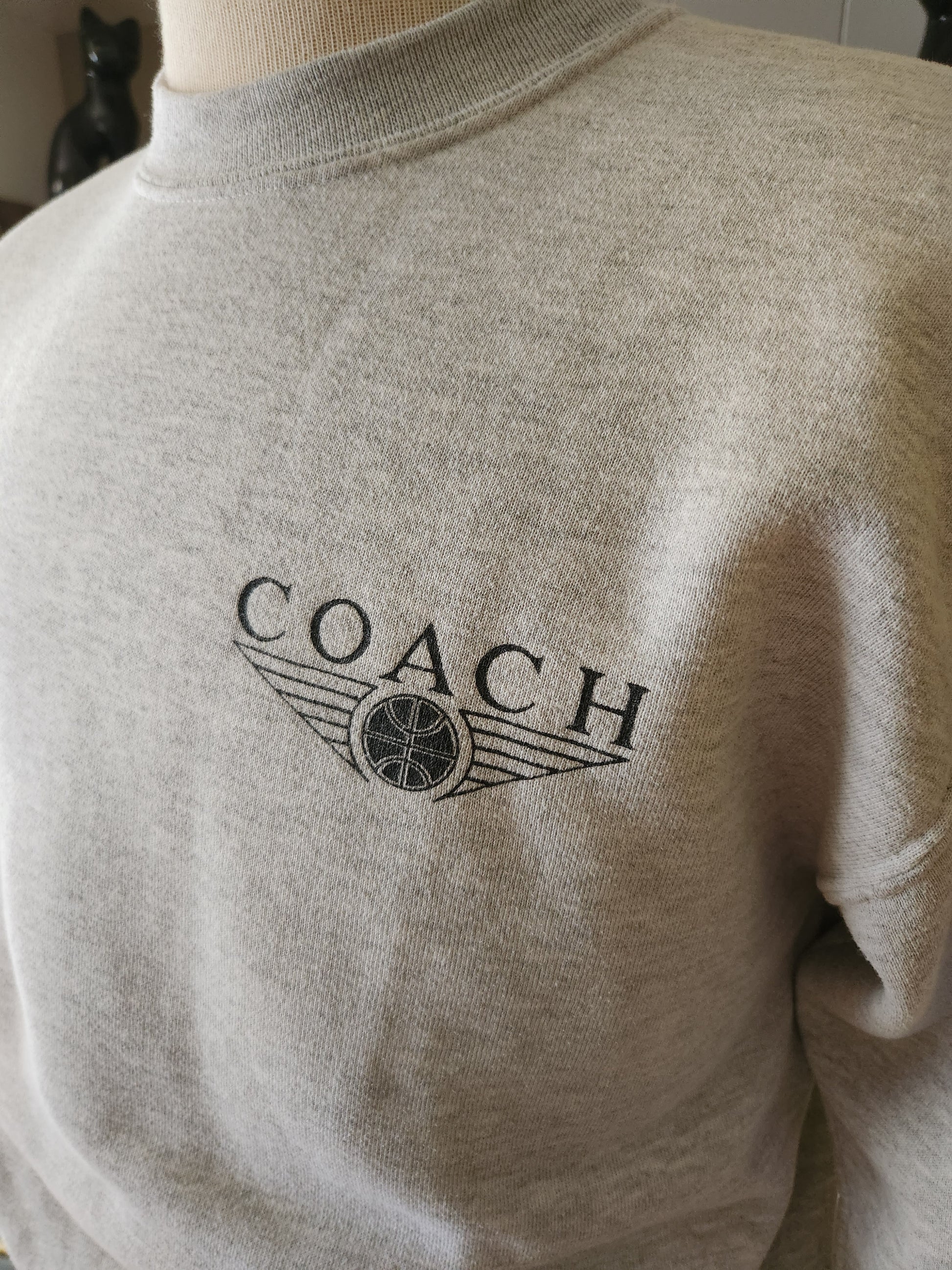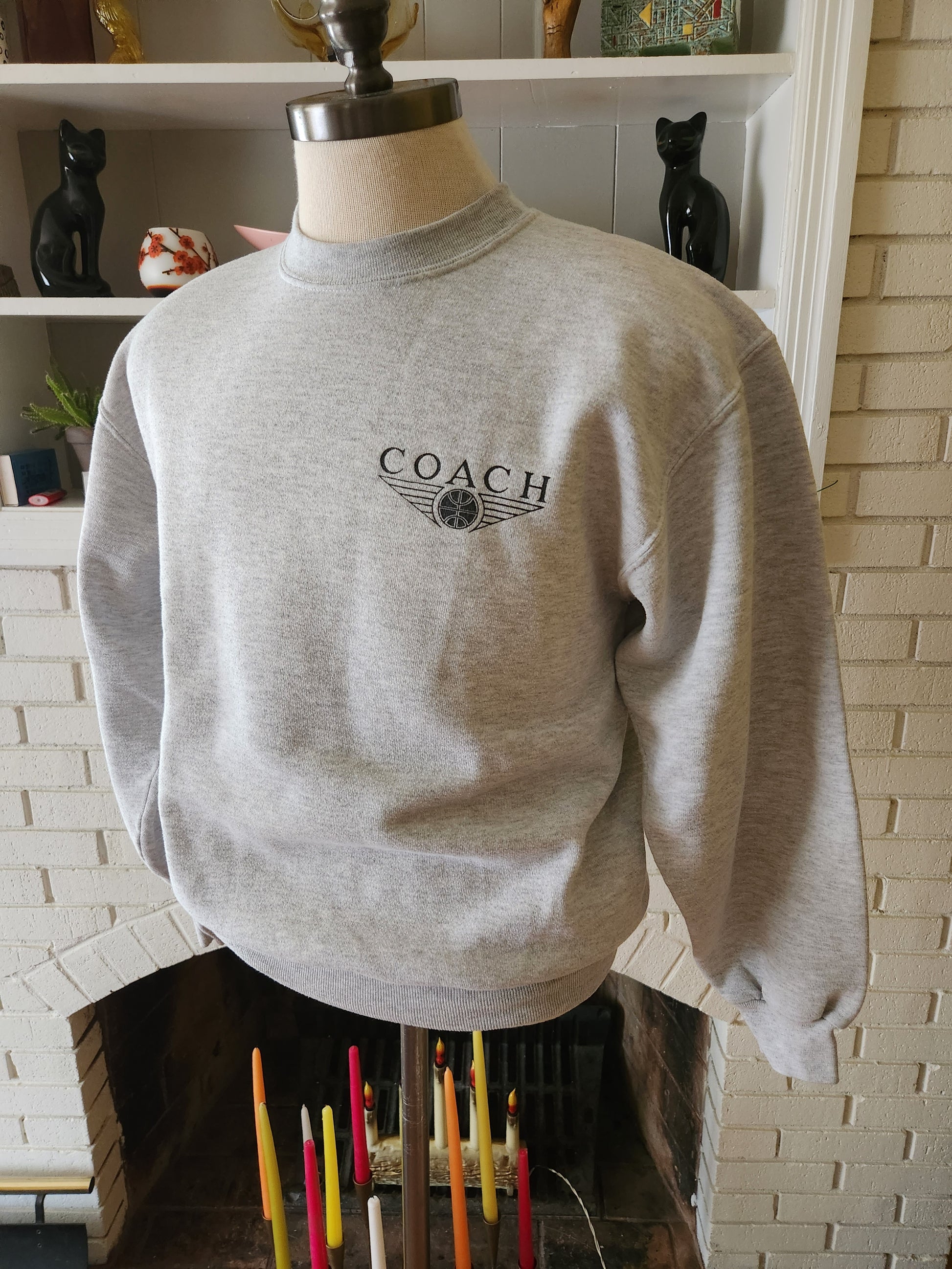 Here is a super cool sweatshirt. Most likely a 50/50 poly and cotton blend. Light gray shirt with cool Coach graphic on the front. Super soft, and comfy. It's in amazing condition with tons of life left! Here are the measurements. (refer to the last pic above to see how I measure shirts)