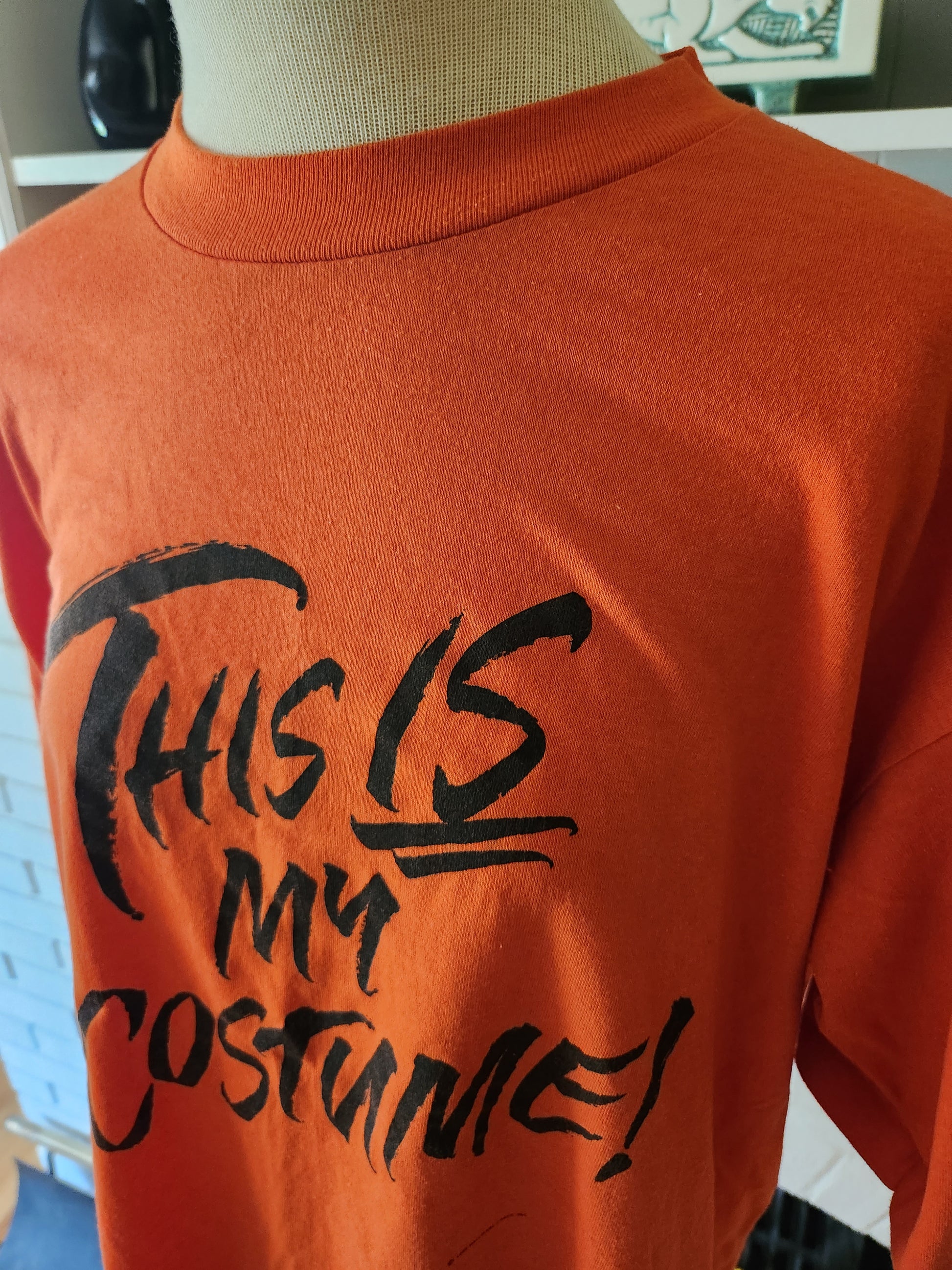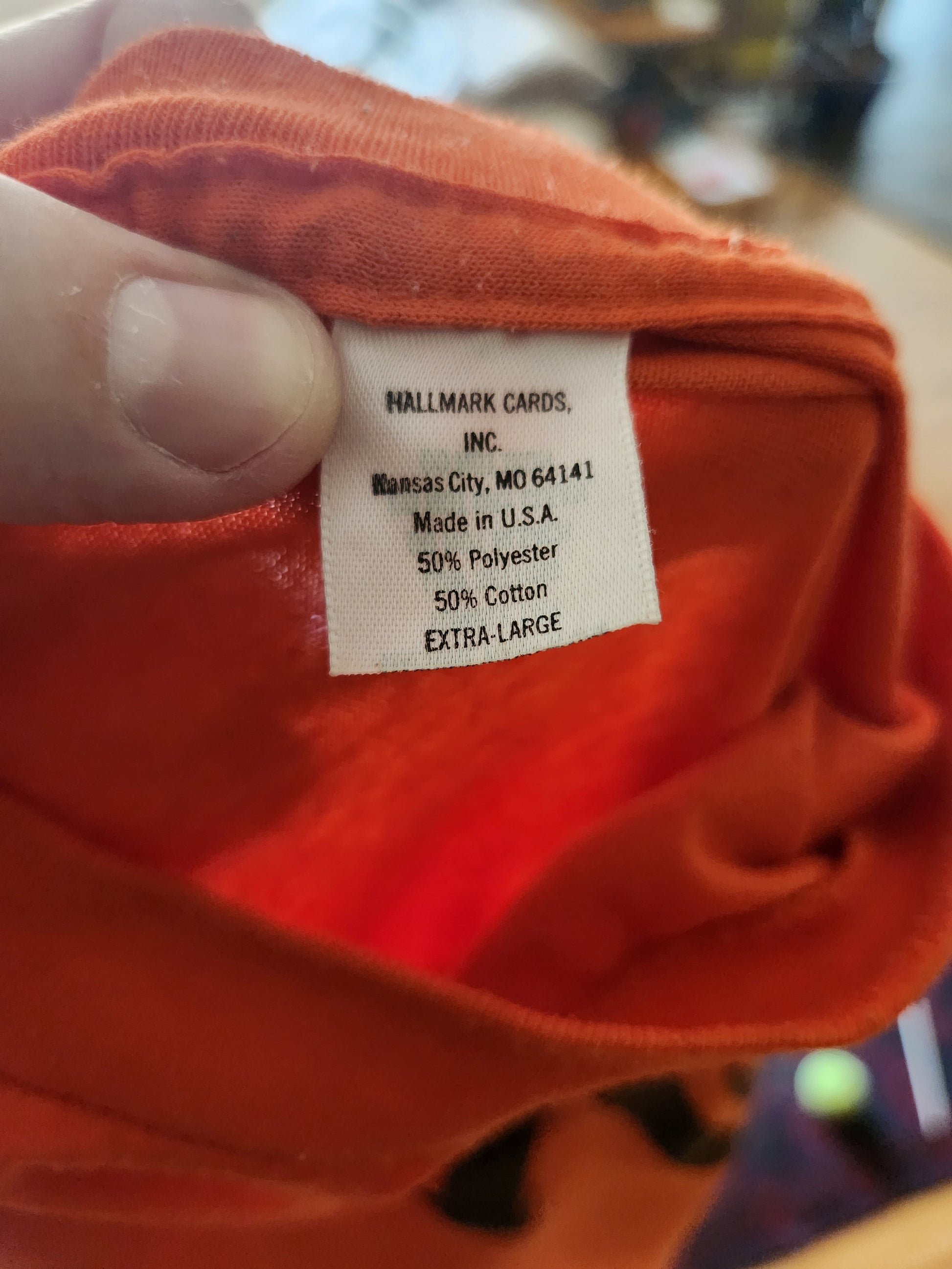 Here is a great vintage T-shirt by Hallmark. 50/50 poly and cotton blend, and made in the USA. Copyright says 1989. Orange shirt with perfectly good reasoning on the front. Also, mind your own GD business why don't ya. Light weight, soft, and super comfy. It's in incredible condition with tons of life left. The tag says XL, but here are the measurements taken laying flat (please refer to the last pic to see how I measure shirts)
