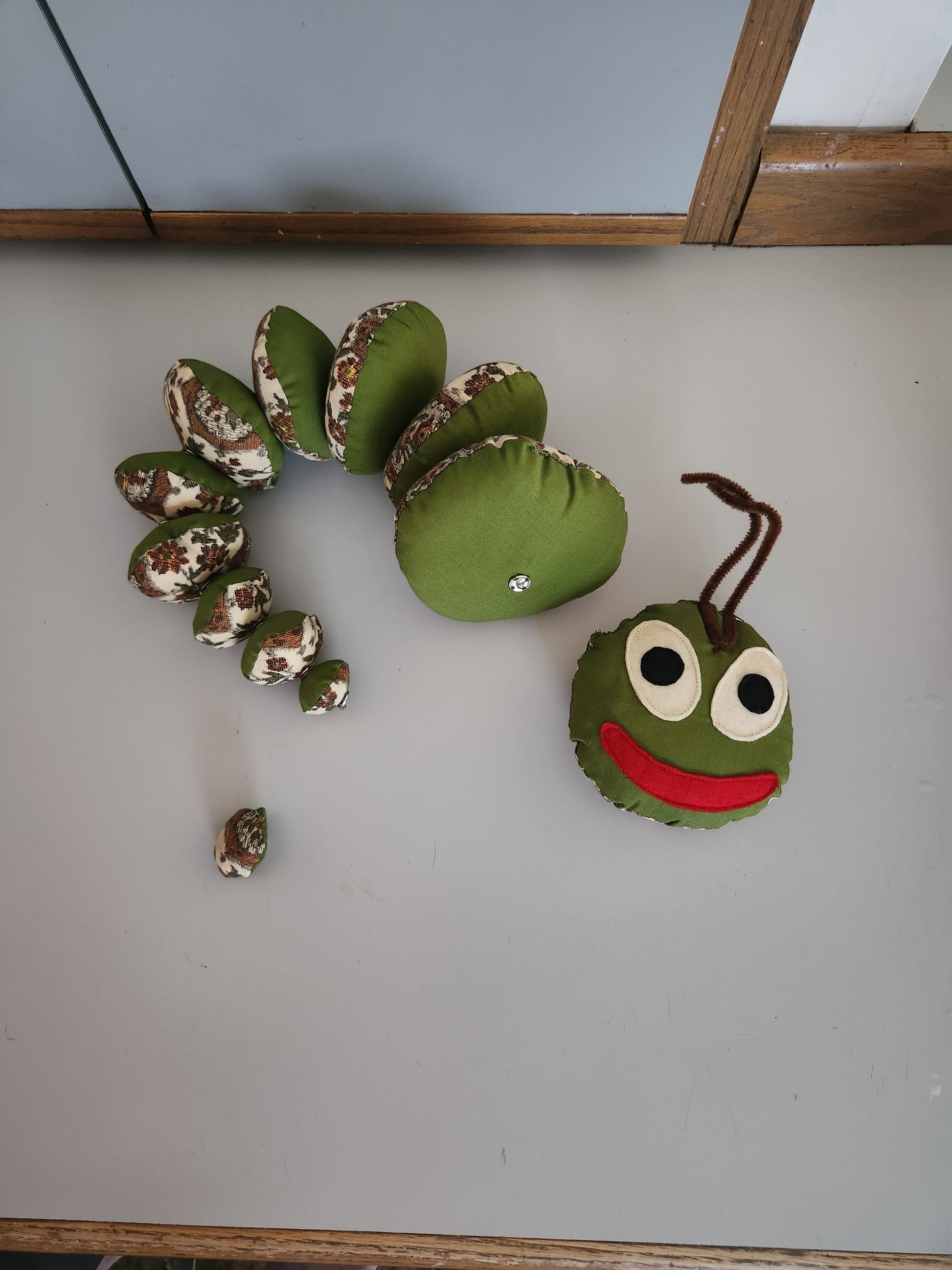 Here is an amazing hand made plush toy, most likely from the 1970s. This adorable caterpillar has 12 segments, each one button snaps to the next. Each section has a green front and a lovely floral patterned back. Help your child learn to count, or just have this thing around cause it's awesome. The total length stretched out is about 24" from head to tail. It's in excellent condition.