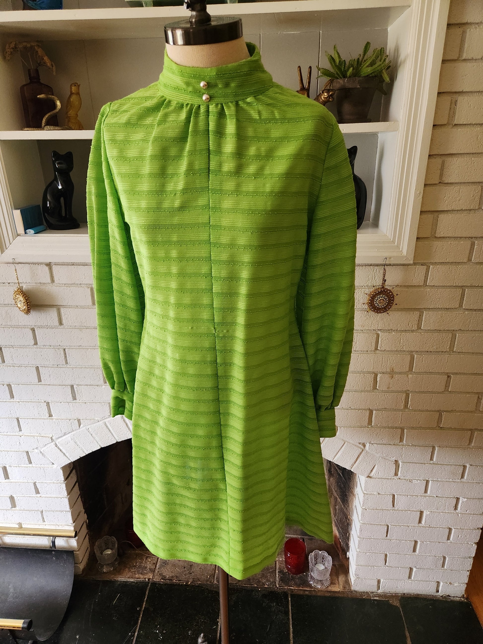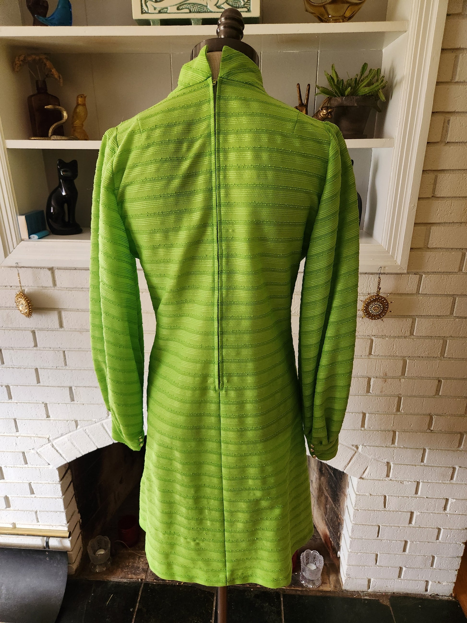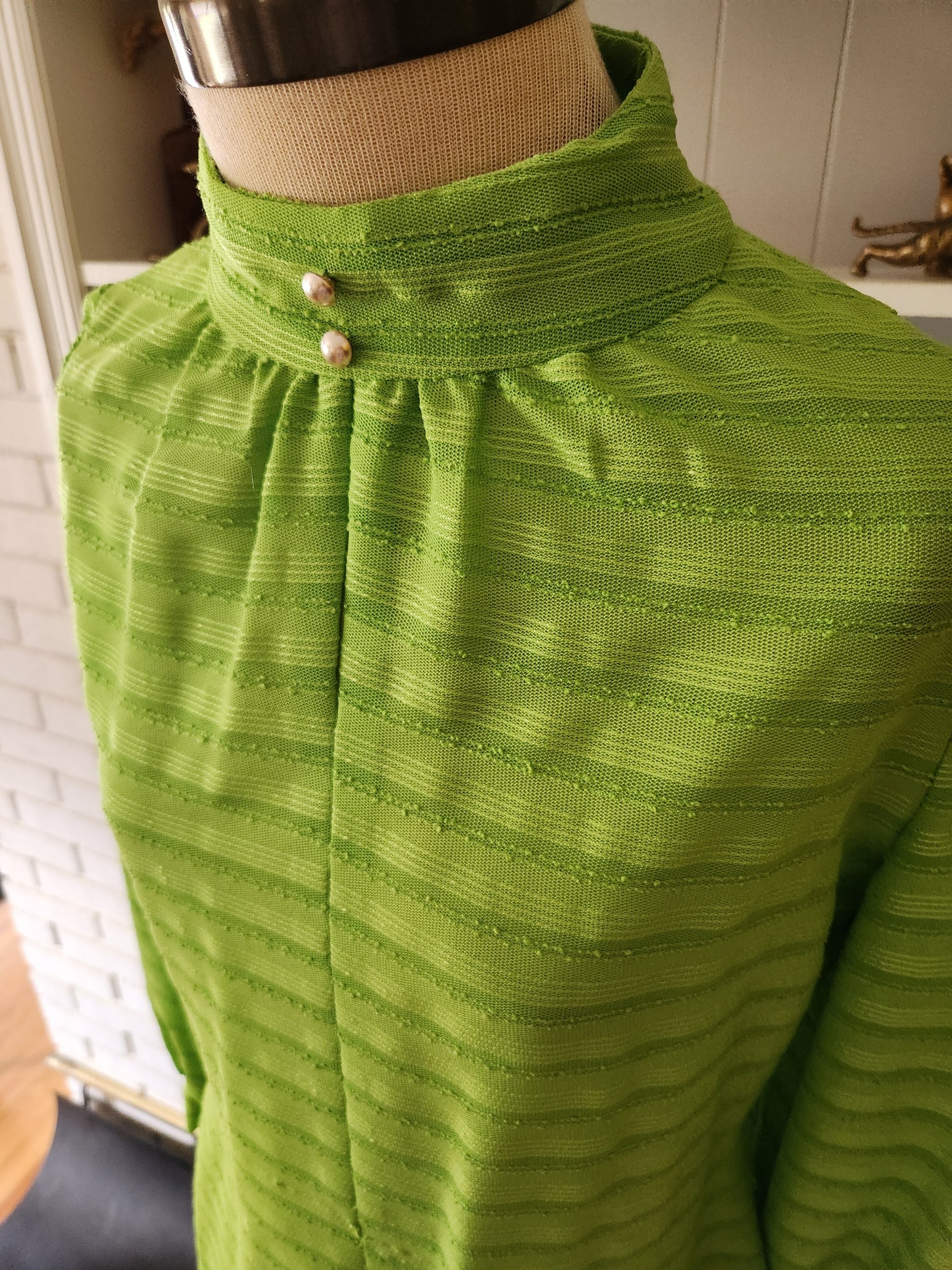 Martha was extraordinary. Not only did she have excellent taste, she could make almost anything. She knit, she crocheted, she made pottery. And she sewed. This one of a kind, hand made dress is an example of her skill. It feels like mostly or all polyester, and I'd guess by the style that she made this in the 60s or early 70s. Gorgeous two tone green fabric with a keyhole front, two buttons on the collar, and three on each cuff. 16" zipper down the back. It's fairly light weight, sheer, soft and comfy. It's in amazing condition with years of life left. Here are the measurements taken laying flat (please refer to the last pic to see how I measure dresses)