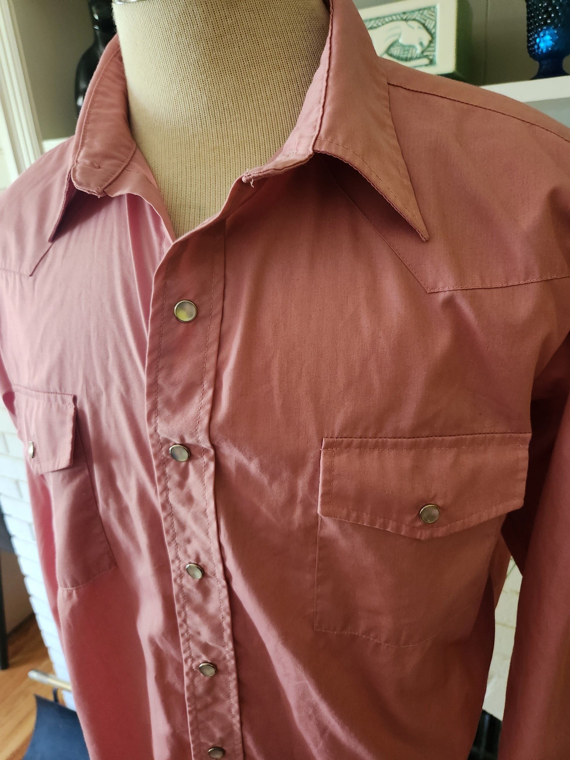 Here is a cool vintage western snap shirt. Most likely a poly blend. Wonderful salmon pink color. Seven button front, with three on each cuff, and a buttoned pocket on each breast. Medium weight, soft and comfy. Super cool with tons of life left! Here are the measurements taken laying flat. (refer to the last pic above to see how I measure shirts)