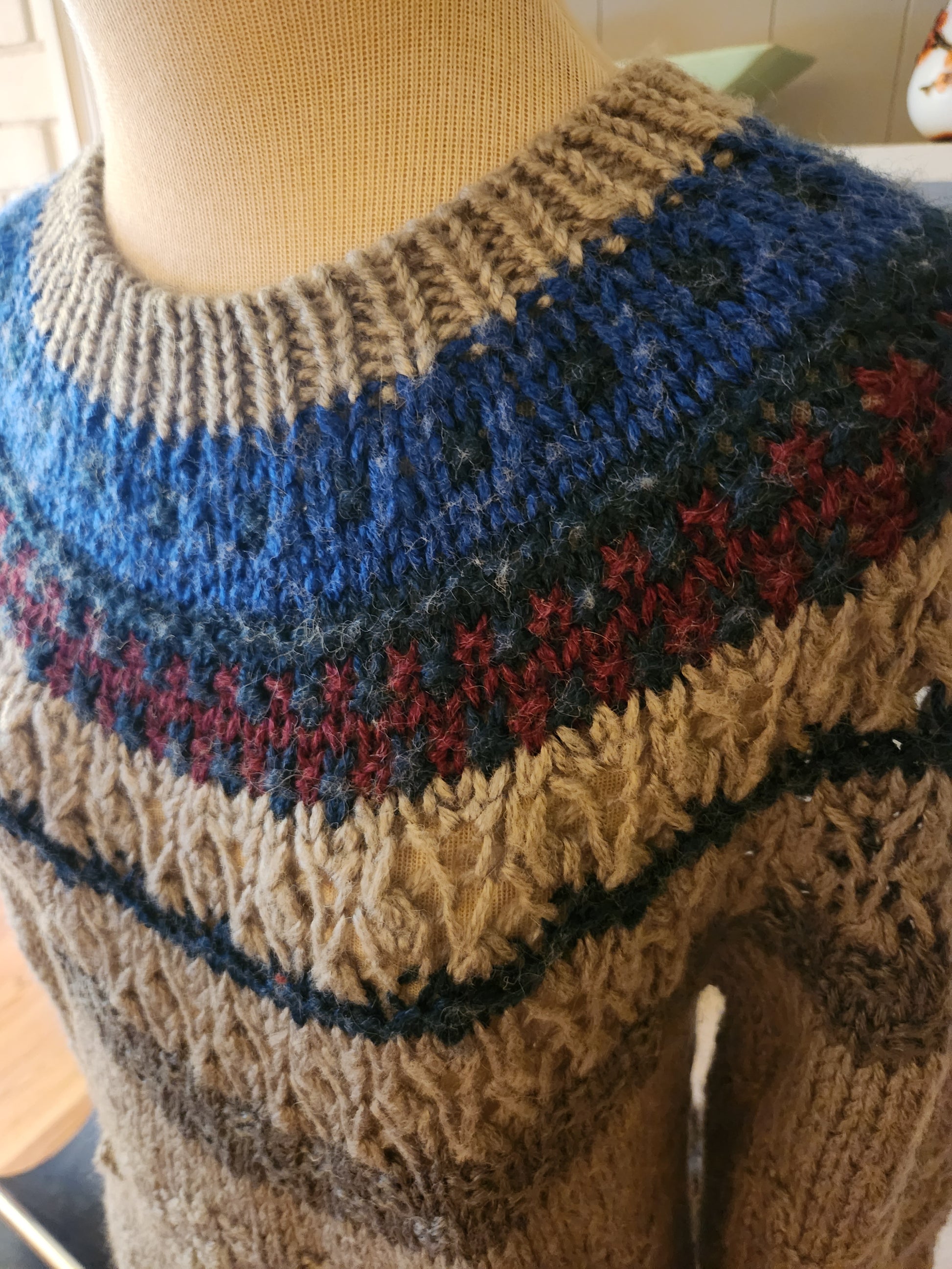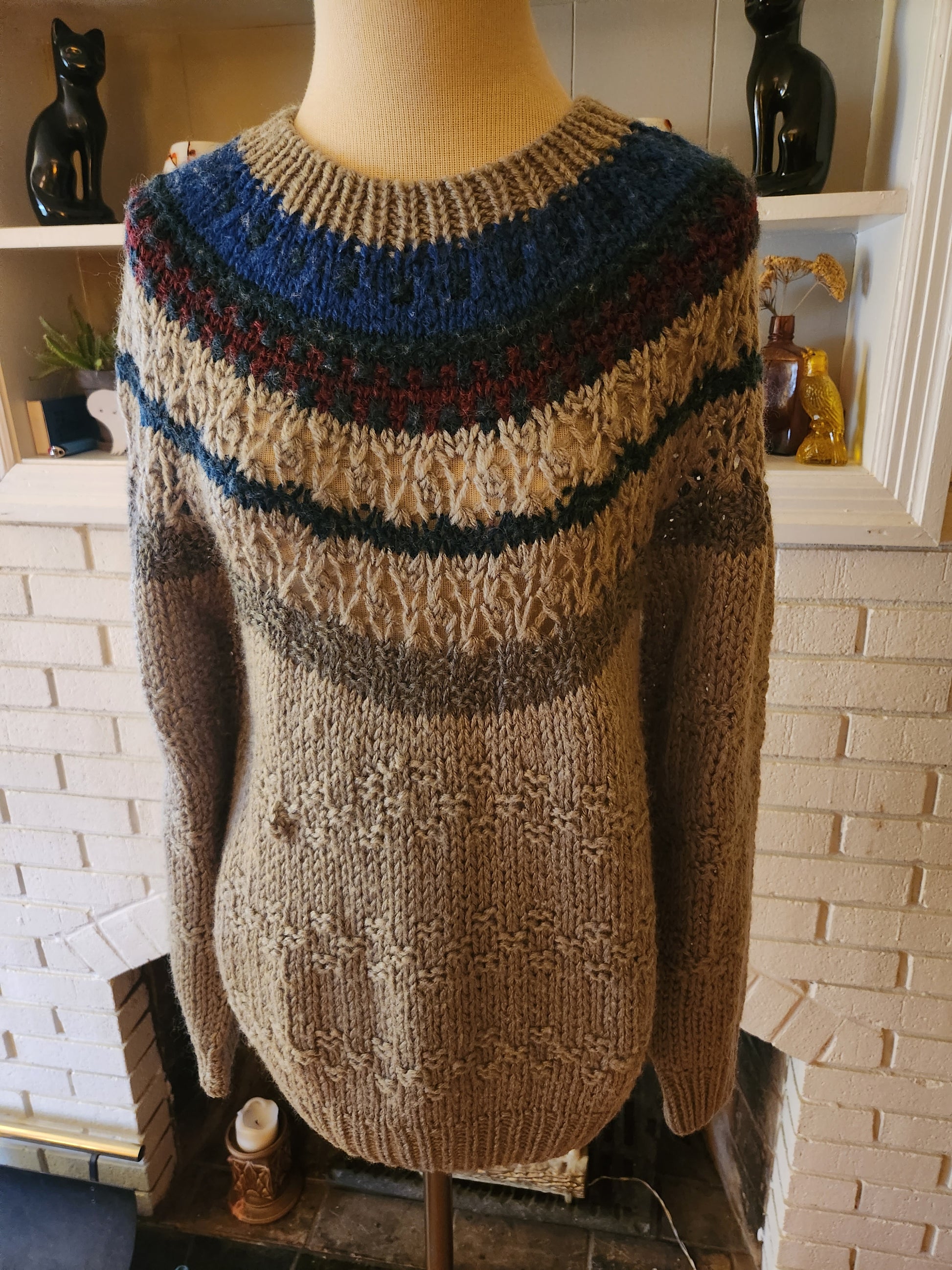 Here is an awesome vintage sweater by Pappagallo. 10% wool, 90% acrylic. Beautiful design of grays, blues, and maroon with different knit patterns throughout. Medium weight, but warm, soft, and comfy. It's in amazing condition, and has years of life left. The tag says Medium, but here are the measurements taken laying flat. (refer to the last pic above to see how I measure shirts)