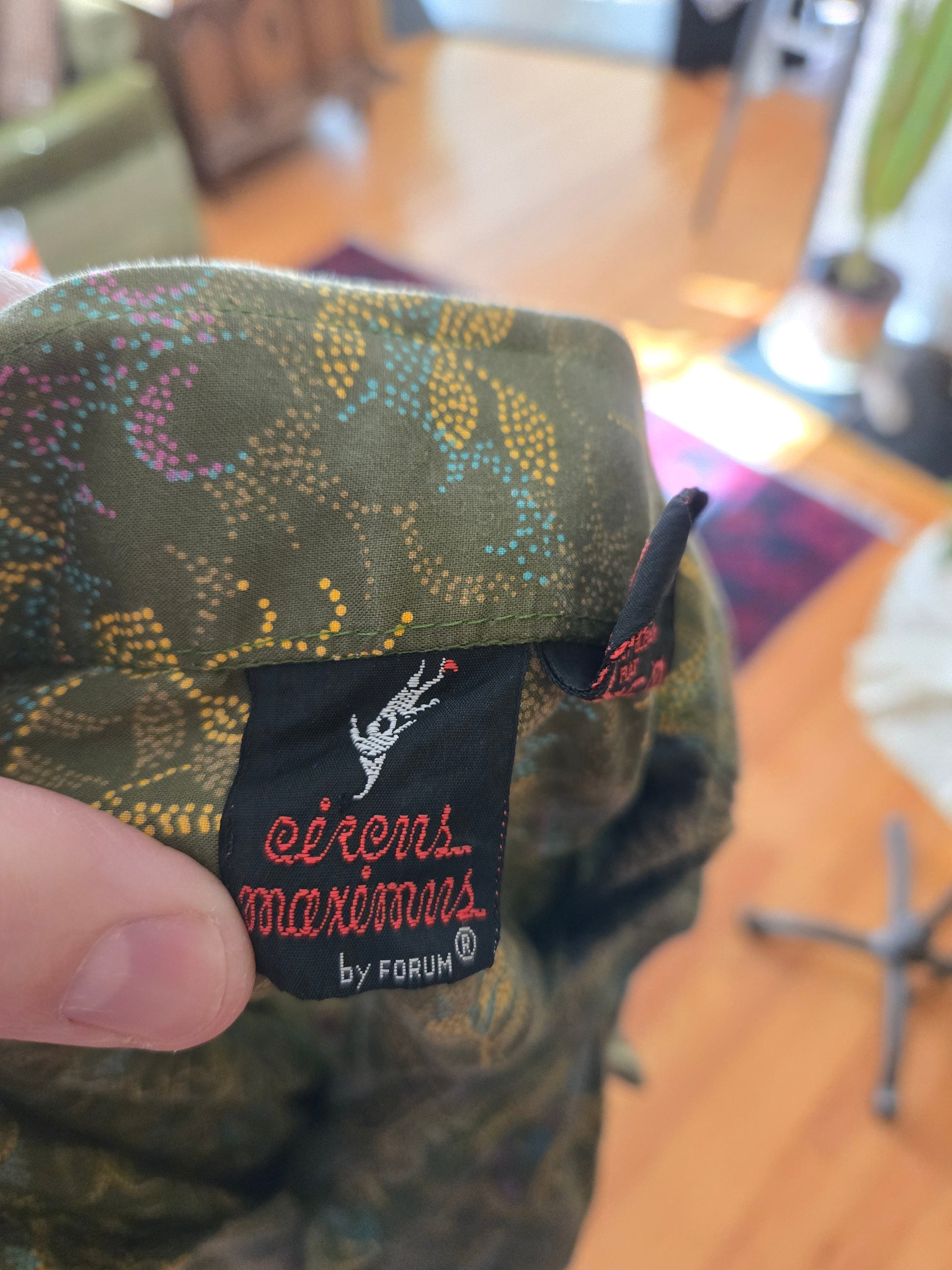 Here is a wonderful long sleeve button down shirt by Circus Maximus. It's 100% cotton. Green fabric with great floral pointillism design throughout. Seven button front with a button on each cuff. Light weight, thin, sheer, soft, and comfy. This one is in amazing condition with tons of life left! The tag says Medium, but here are the measurements when laying flat (please see the last picture for how we measure shirts)