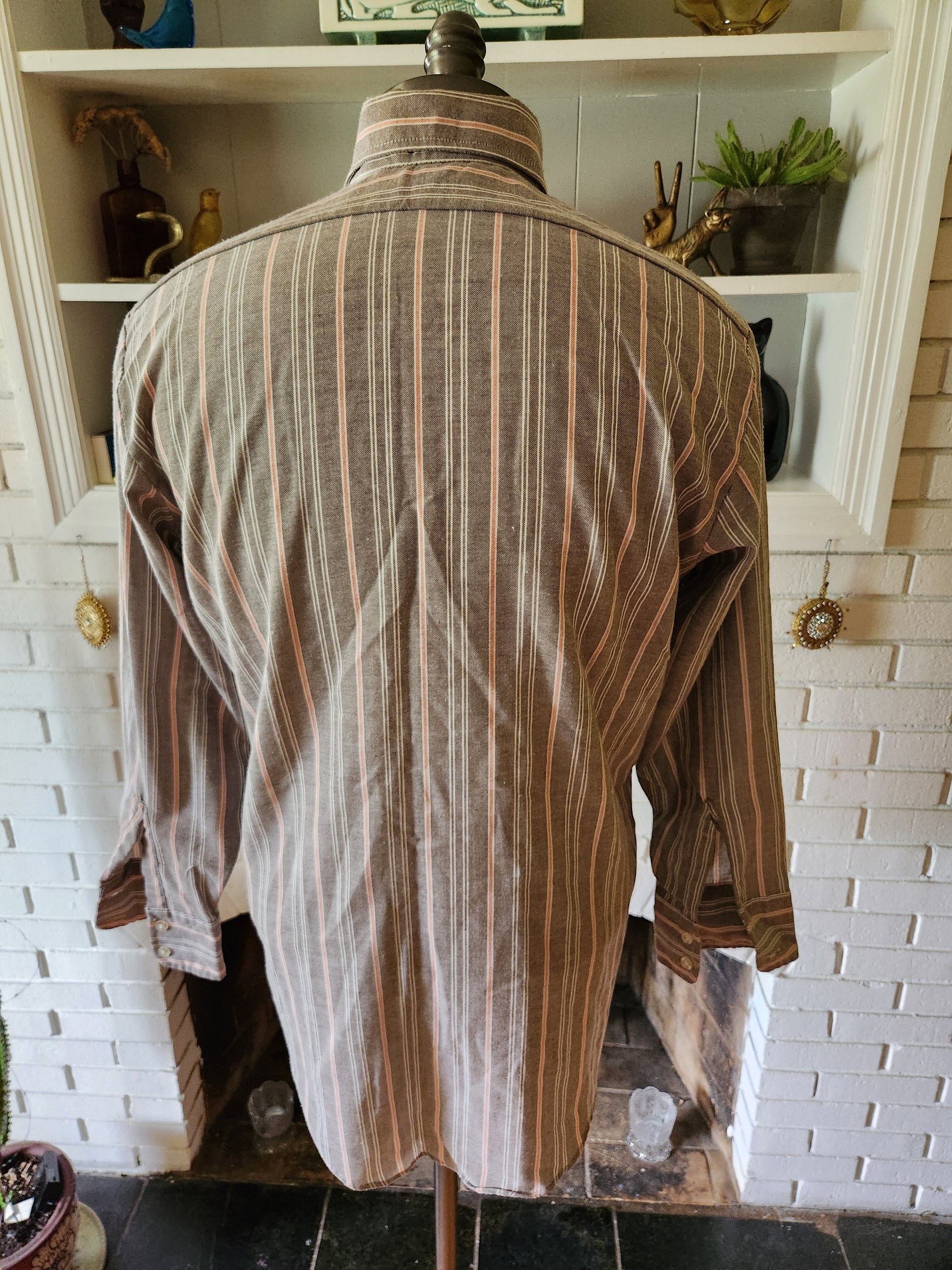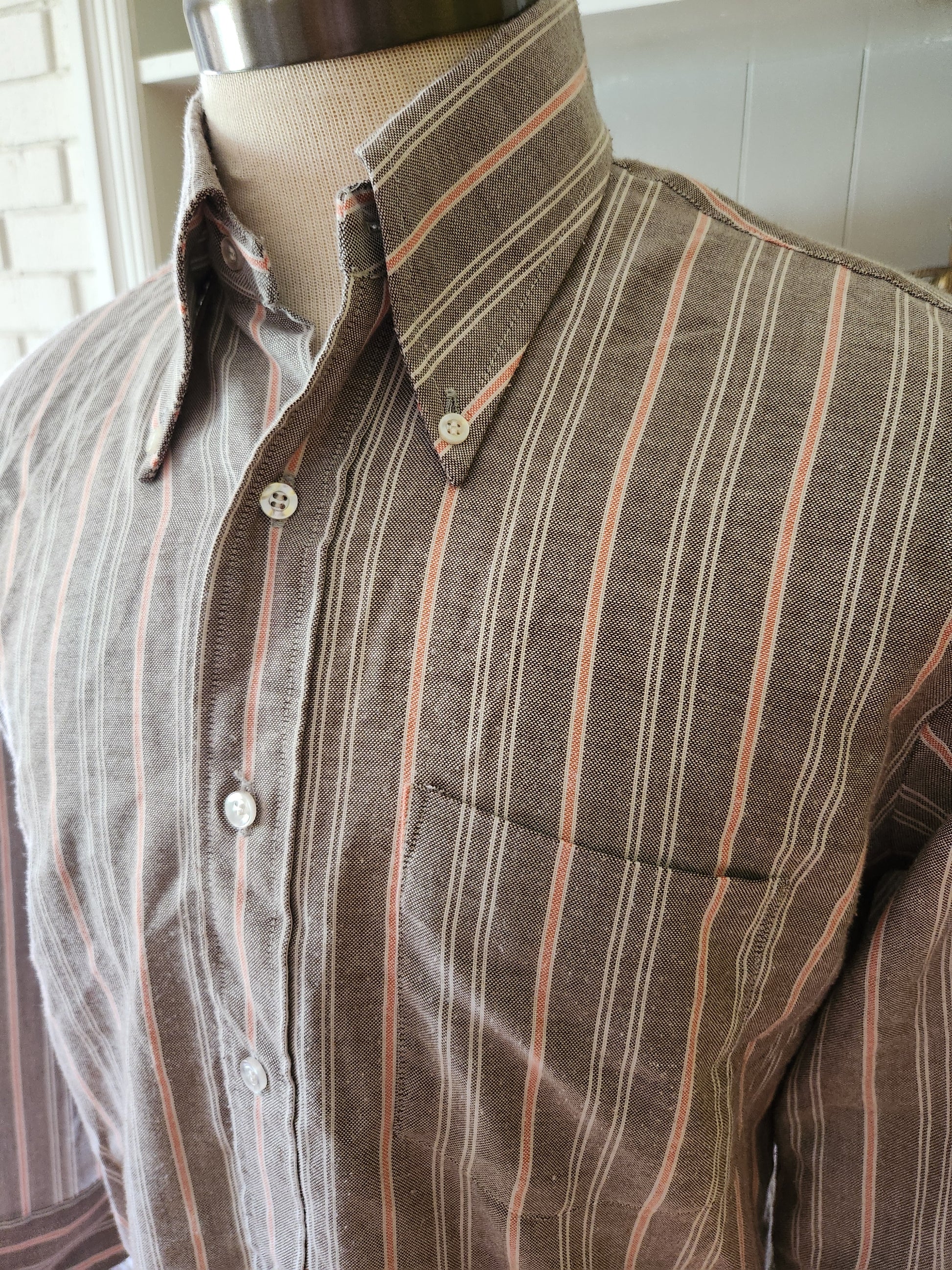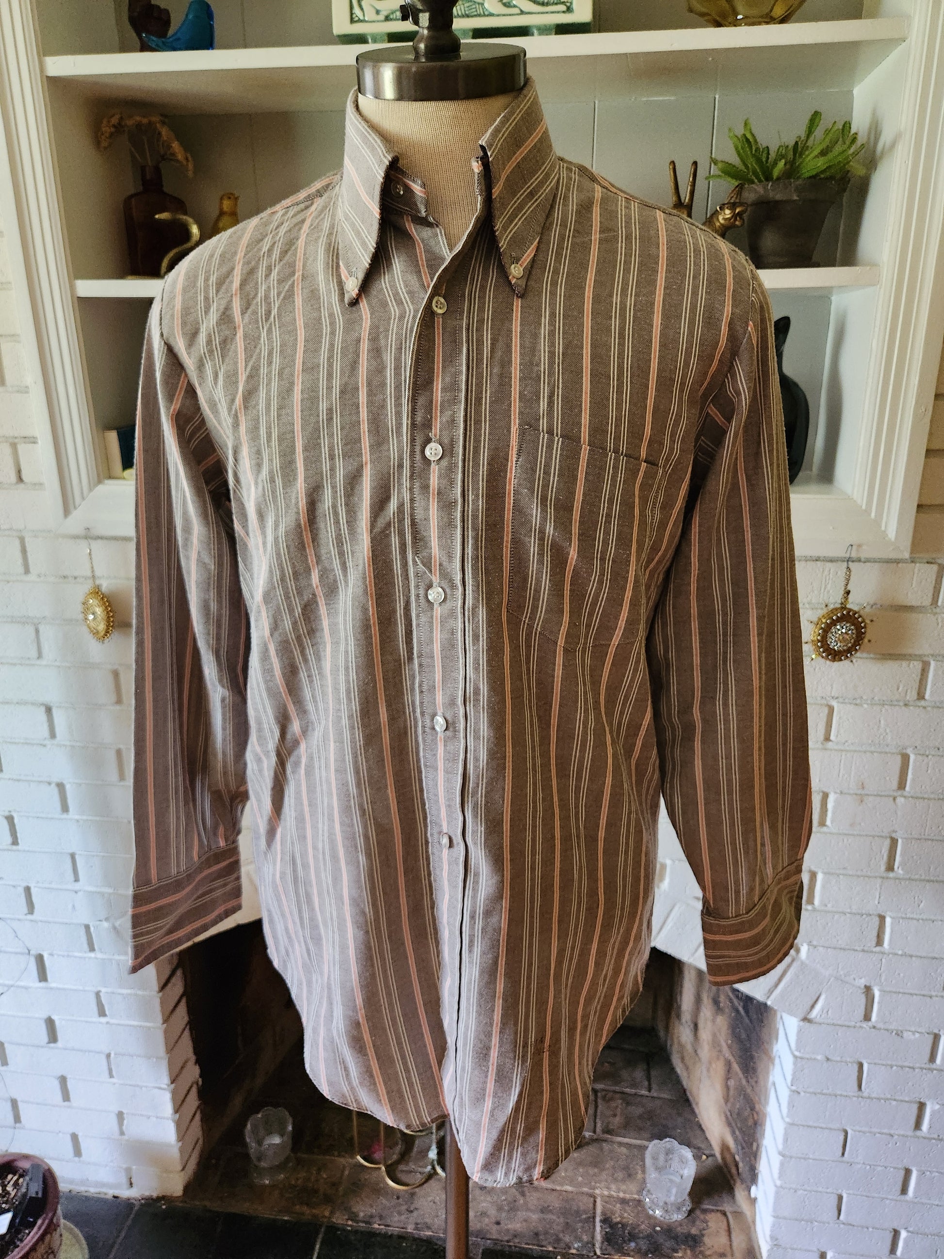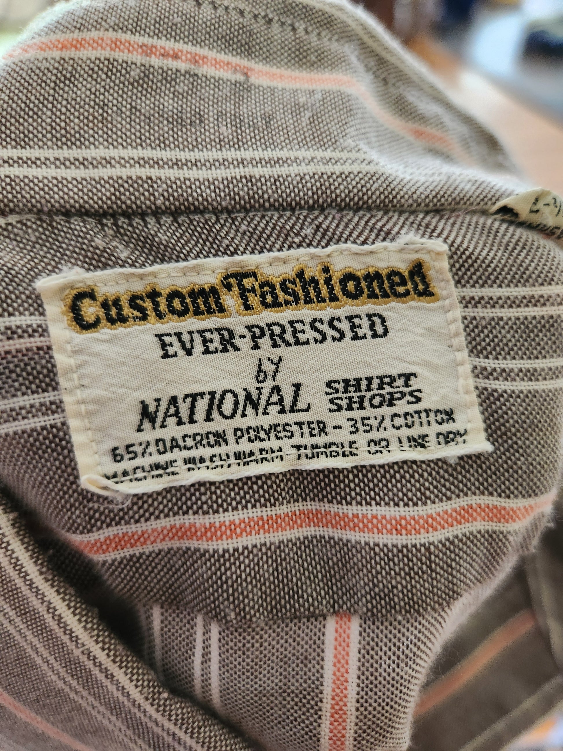 Here is a cool vintage button down shirt from the 70s by National Shirt Shops. It's 65% Polyester, 35% cotton. Great striping pattern of brown, white, and salmon throughout. Six button front with two buttons on each cuff, a button down collar, and a pocket on the left breast. It's light to medium weight, fairly sheer, soft and comfy. It's in excellent condition with years of life left! The tag says 15 1/2-32, but here are the measurements taken laying flat. (refer to the last pic above to see how I measure shirts)