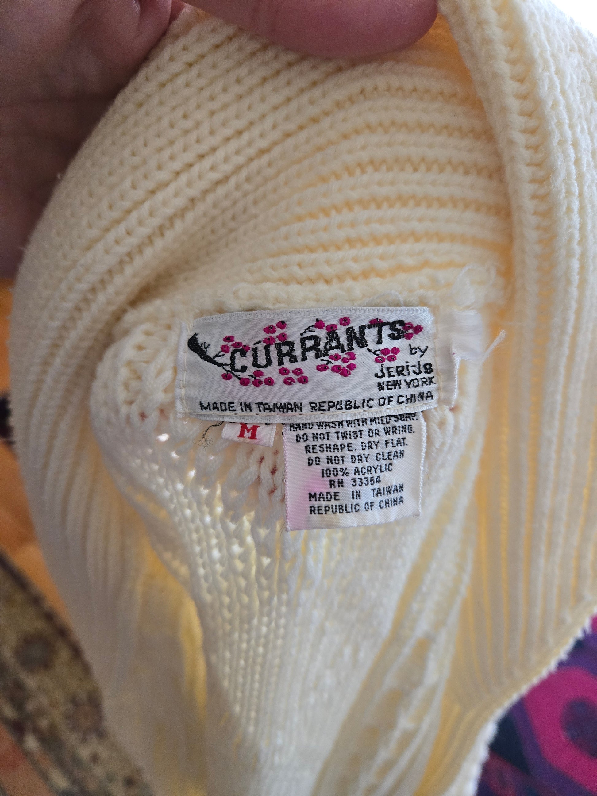Here is a wonderful long sleeve sweater from the 70s by Currants. 100% acrylic. Classic cable knit design in an off white fabric. Removable matching belt. Medium weight, warm, soft and super comfy. It's in amazing condition with tons of life left! The tag says Medium but here are the measurements taken laying flat.