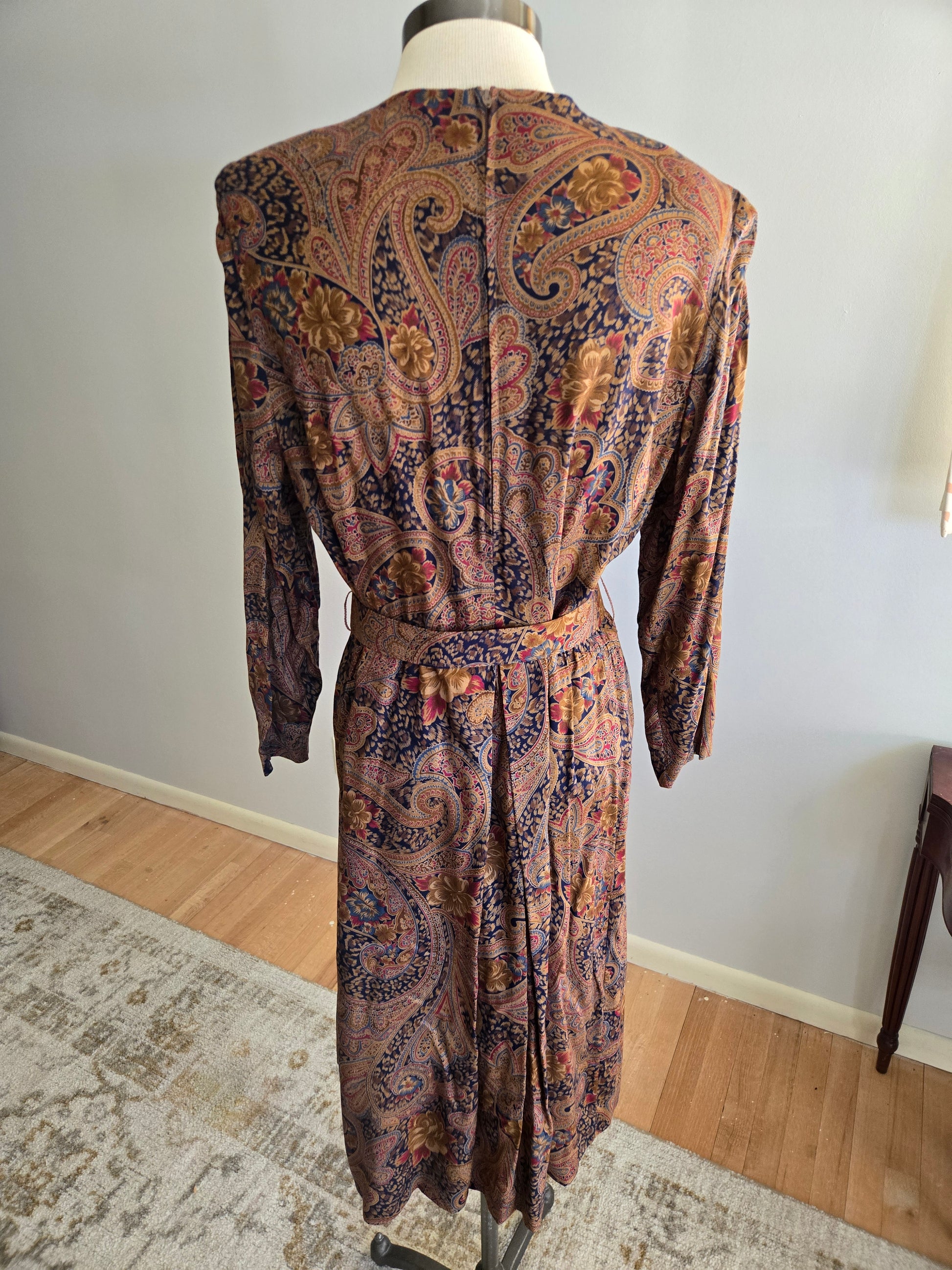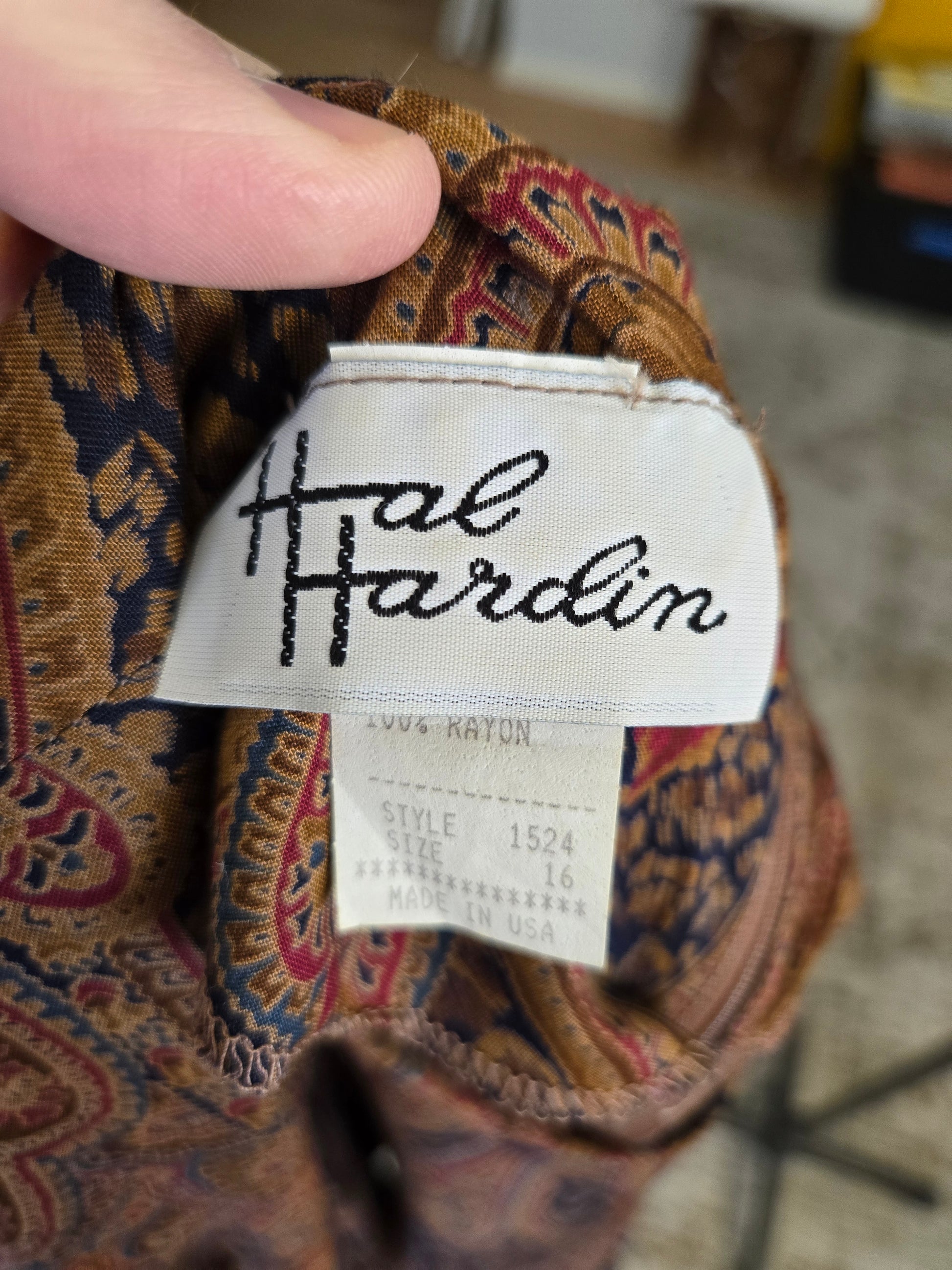 This is a super cool long sleeve dress from the 70s/80s by Hal Hardin. 100% rayon, and made in the USA. Lovely paisley pattern in browns, blues, and red. Zippered back, pleated skirt section, matching belt, shoulder pads present. There is elastic at the waist, but it has lost some of it's tension. The fabric is light weight and fairly sheer. It's soft and comfy, and in excellent condition with years of life left! The tag says Size 16, but here are the exact measurements taken laying flat (be sure to reference the last photo to see how I measure dresses)
