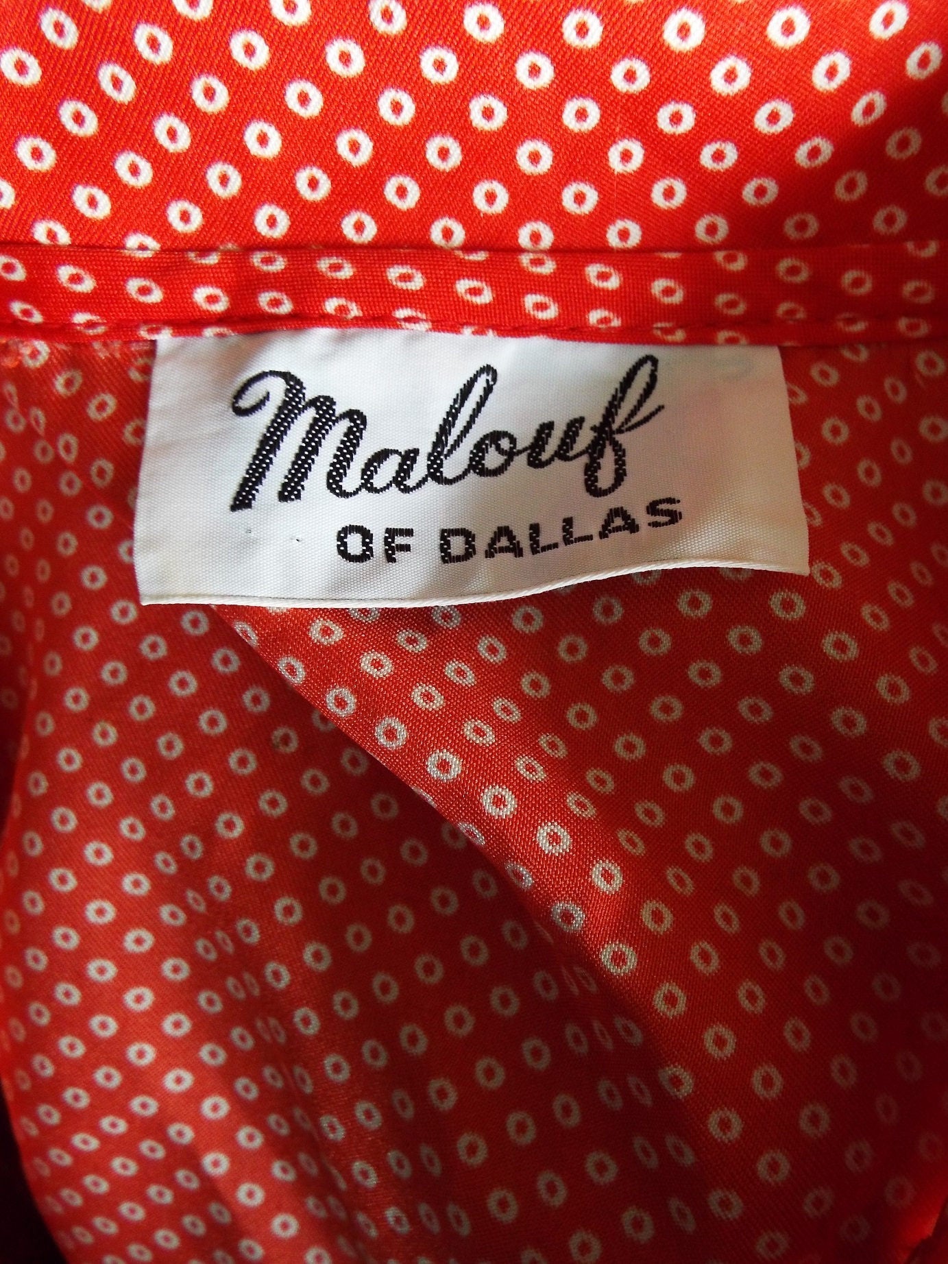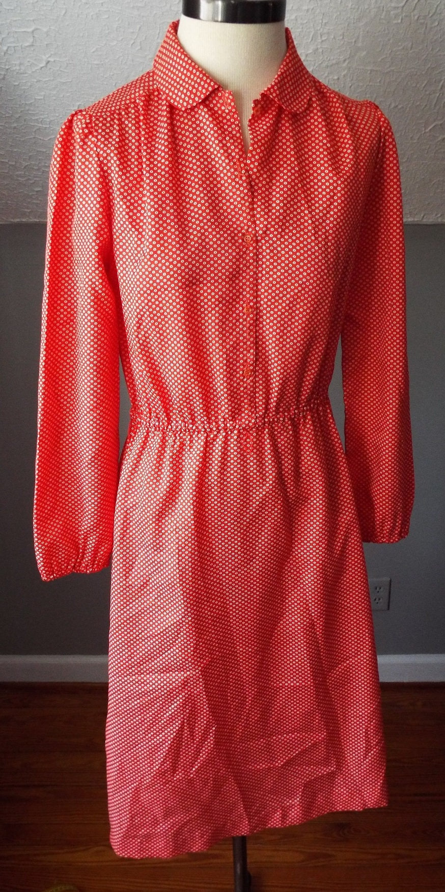 This is a hip and stylish long sleeve dress by Malouf of Dallas. Feels like 100% polyester. Red fabric with little white donuts all over it. Supposed to be a five button front, but the second from the top is missing. I'd take the top one off and put it there, as no one ever buttons the top button. Very light weight and fairly sheer. Other than the missing button, it's in amazing shape with years of life left! Here are the exact measurements. (be sure to reference the last photo to see how I measure dresses)