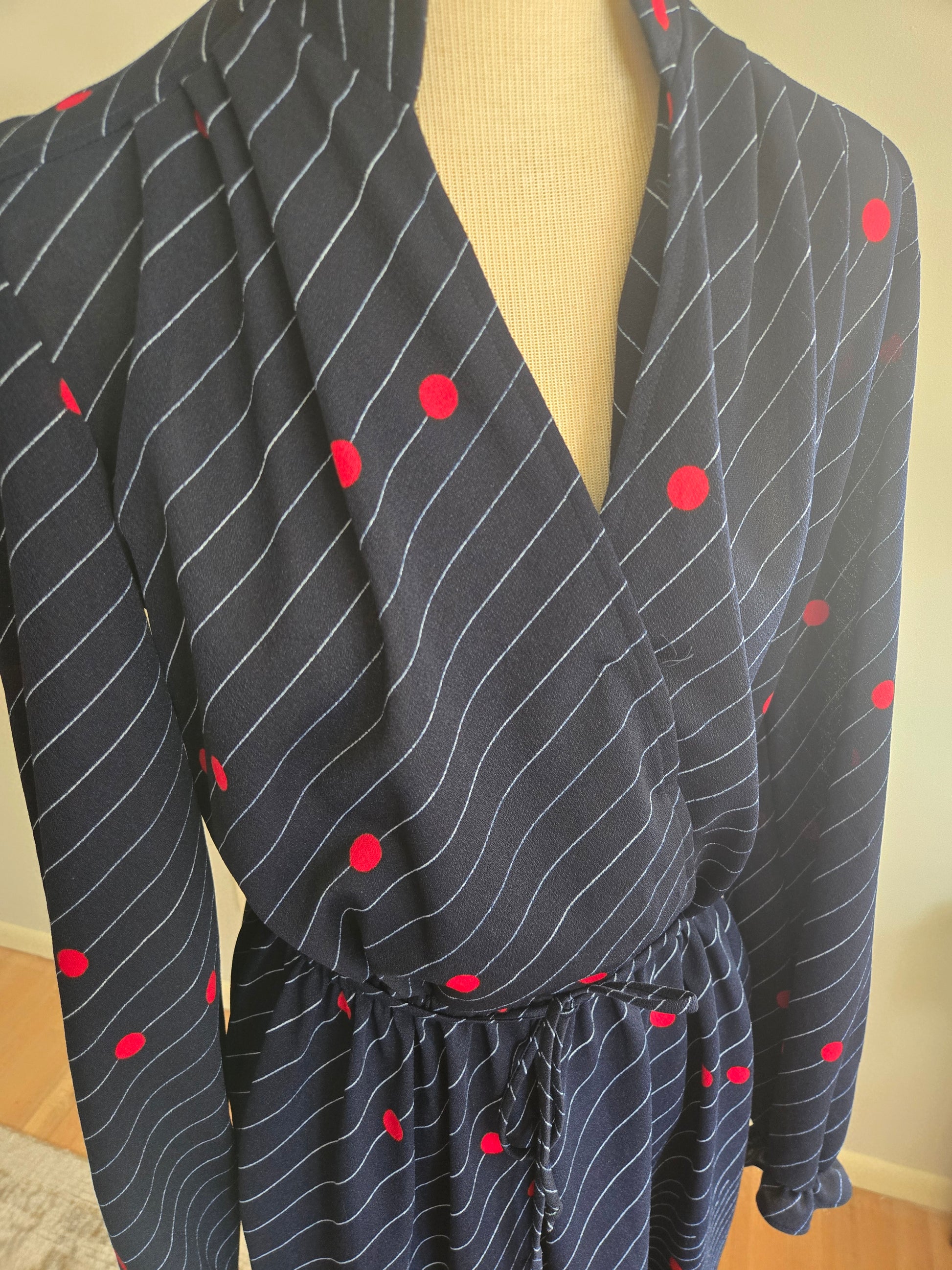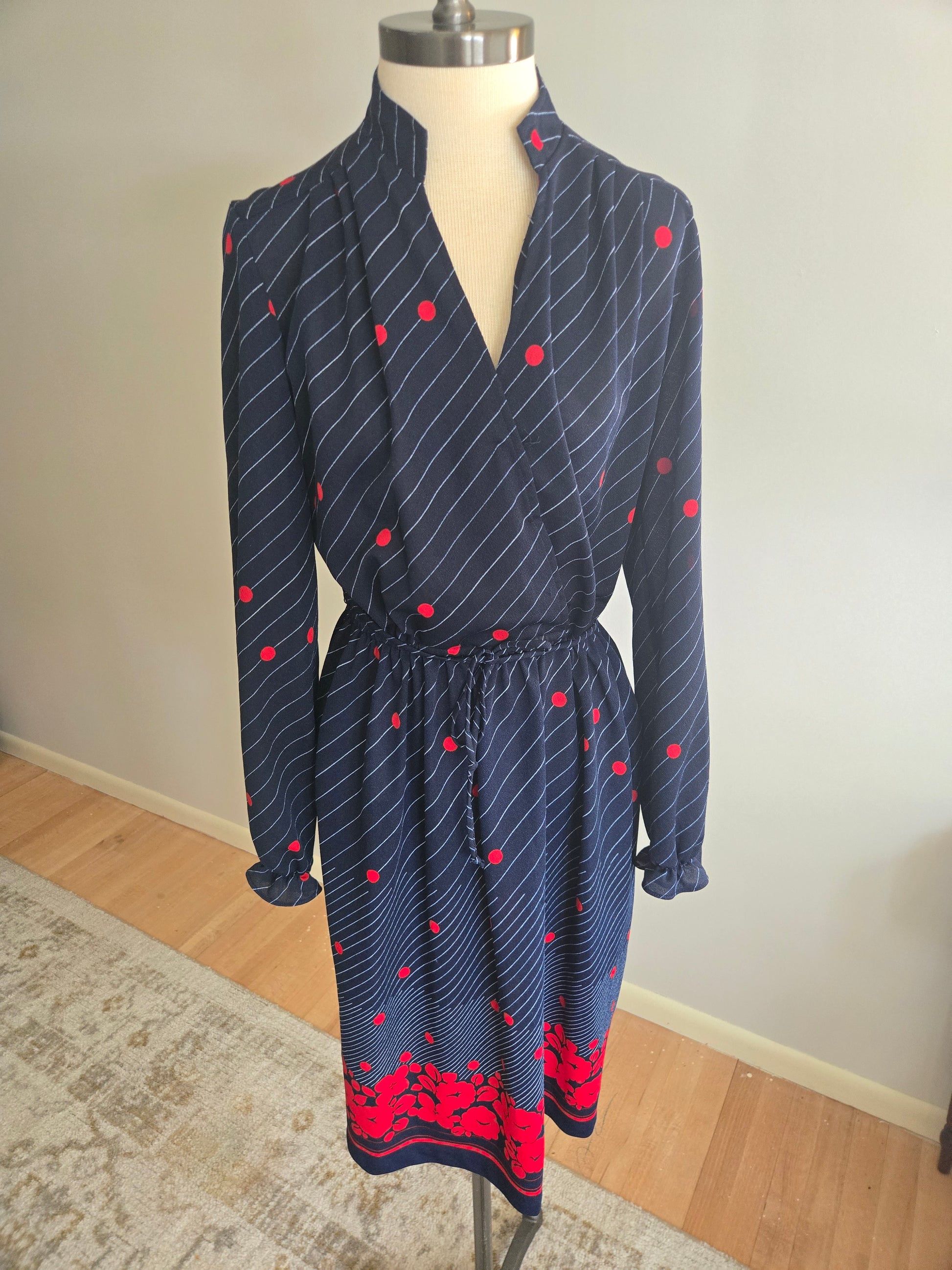 This is a super cool long sleeve dress from the 70s. Feels like all polyester. Dark blue background with bold red floral print at the bottom, polka dot design and white/light blue striping on the rest. Ruffles at the cuff and a matching removable cloth belt. There is a little life left in the elastic waist. The fabric is light weight, thin, and fairly sheer. It's soft and comfy, and in excellent condition with years of life left! The tag says Size 16, but here are the exact measurements taken laying flat (be sure to reference the last photo to see how I measure dresses)