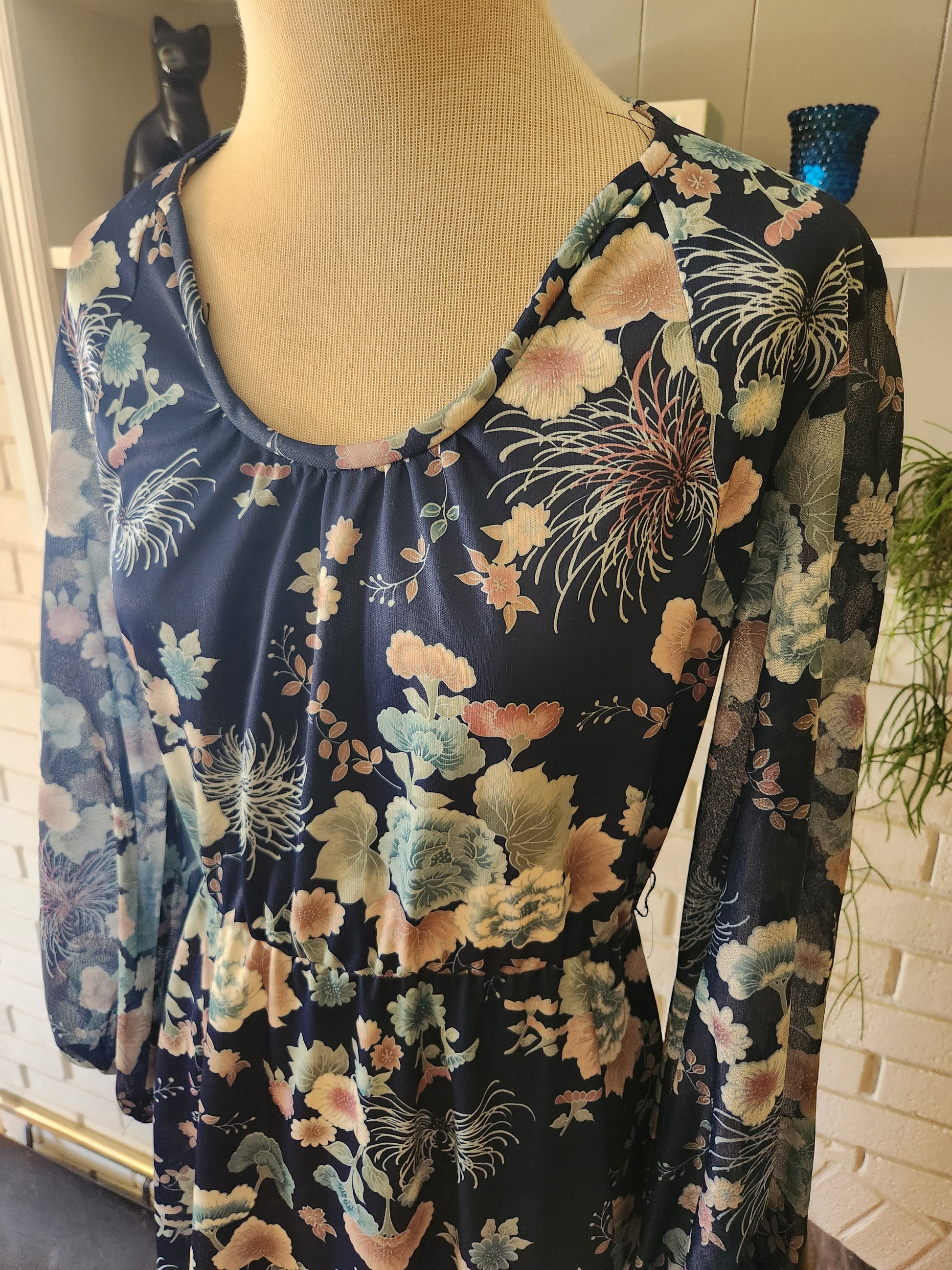 Here is a gorgeous long sleeve dress. 100% polyester. Dark blue fabric with amazing floral design throughout. 22" zipper down the back. It's thin, fairly sheer, soft, and super comfy. It's in amazing condition with years of life left! The tag says Size 10, but here are the measurements when laying flat: