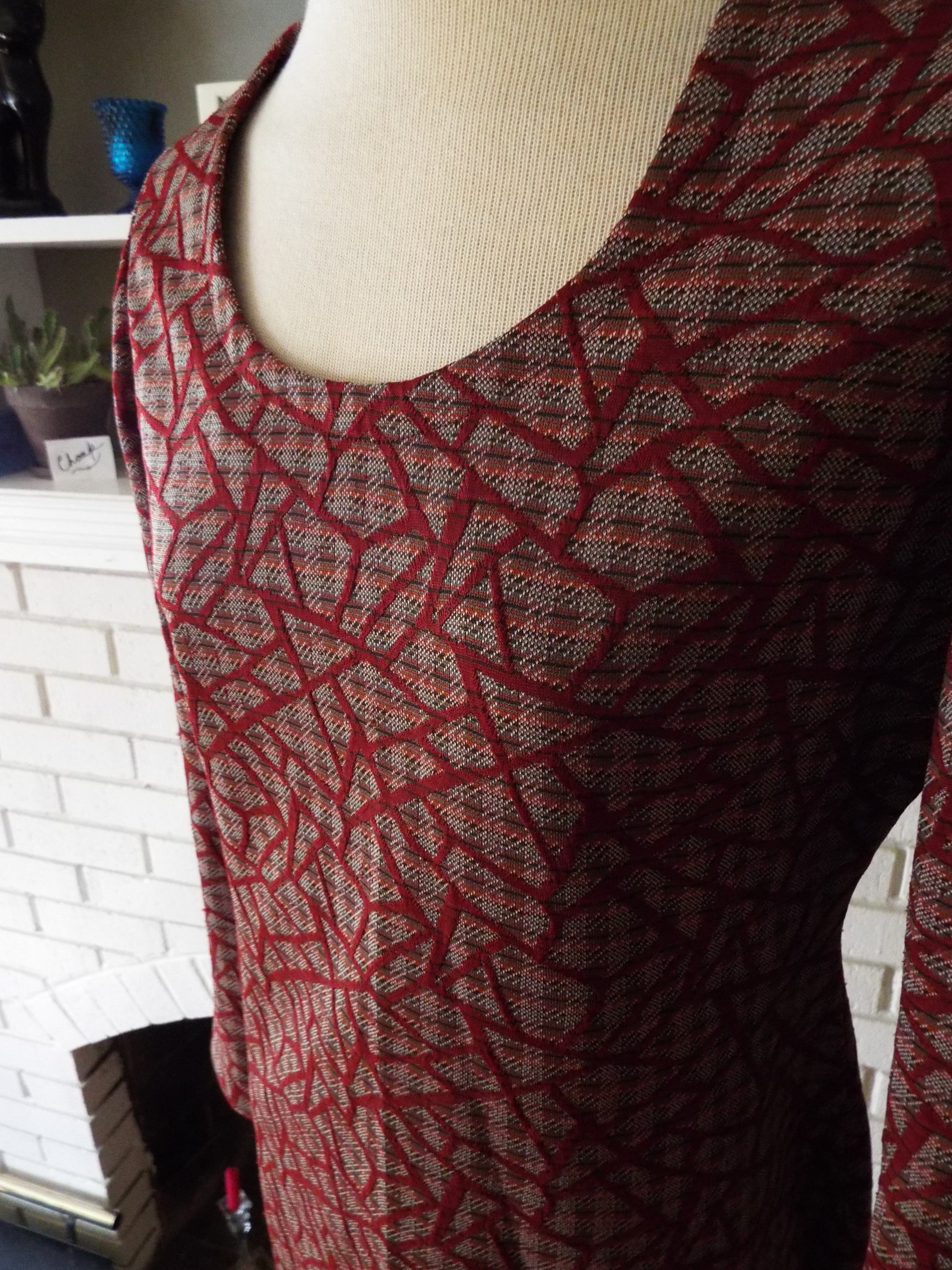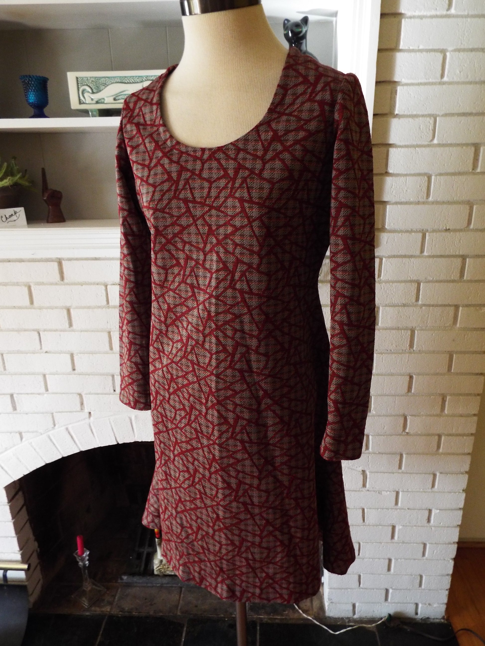 Here is a gorgeous vintage long sleeve dress. Feels like mostly or all polyester. Super interesting geometric design under maroon. 21" zipper down the back. It's in incredible condition with years of life left! Here are the measurements taken laying flat. (please refer to the last photo above to see how I measure dresses)