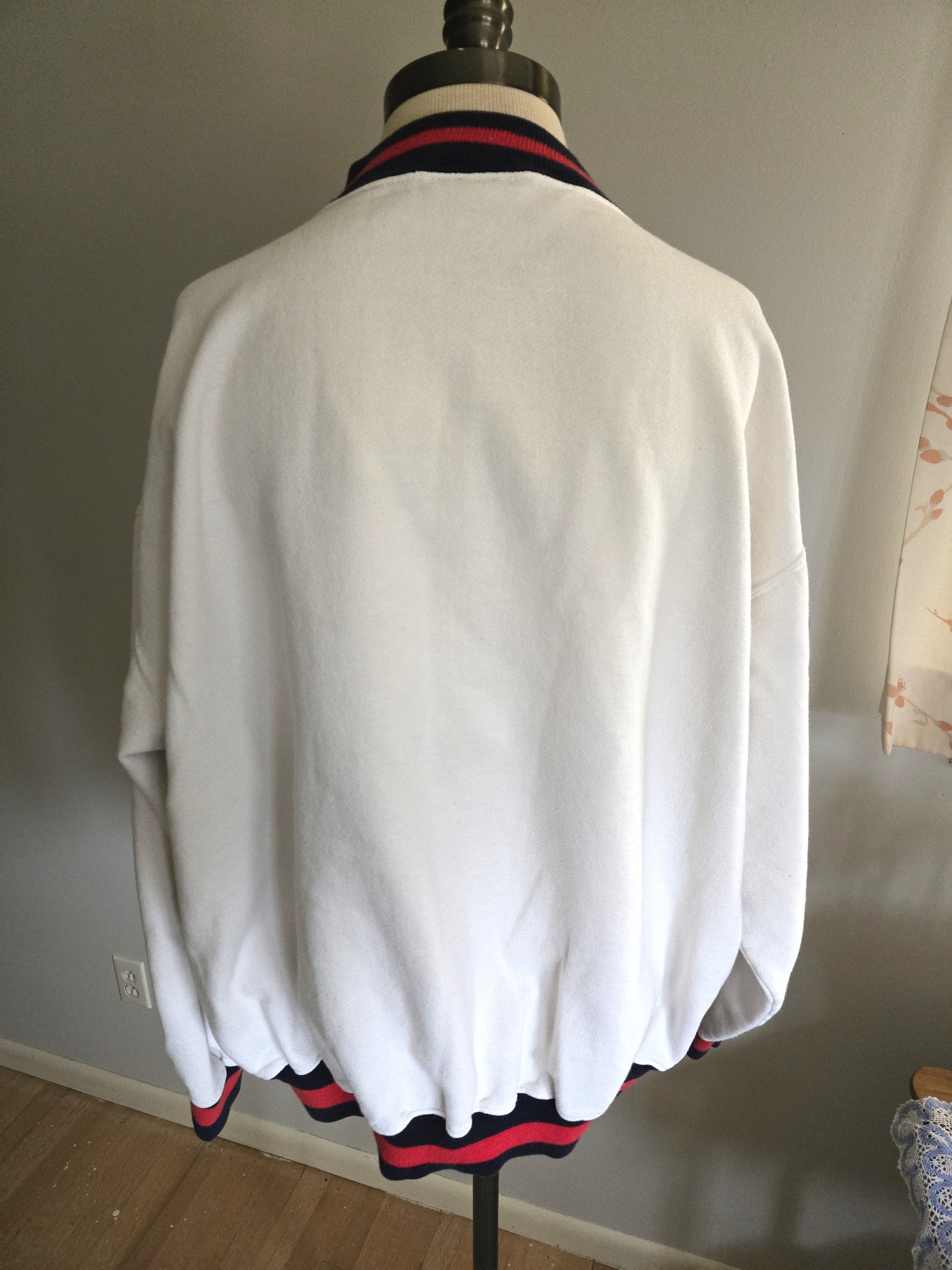 Here is a super cool vintage long sleeve sweatshirt from the 80s/90s by Vantage Club Collection. Made in the USA. The inside is soft, the outside has that late 80s/early 90s stiffness to it. White shirt with blue and red accents, and a sweet embossed Cornelius logo on the left breast. This one is a medium weight shirt, warm, comfy, and it's in excellent condition with years of life left. The tag says XL, but here are the measurements taken laying flat. (refer to the last pic above to see how I measure shirts)