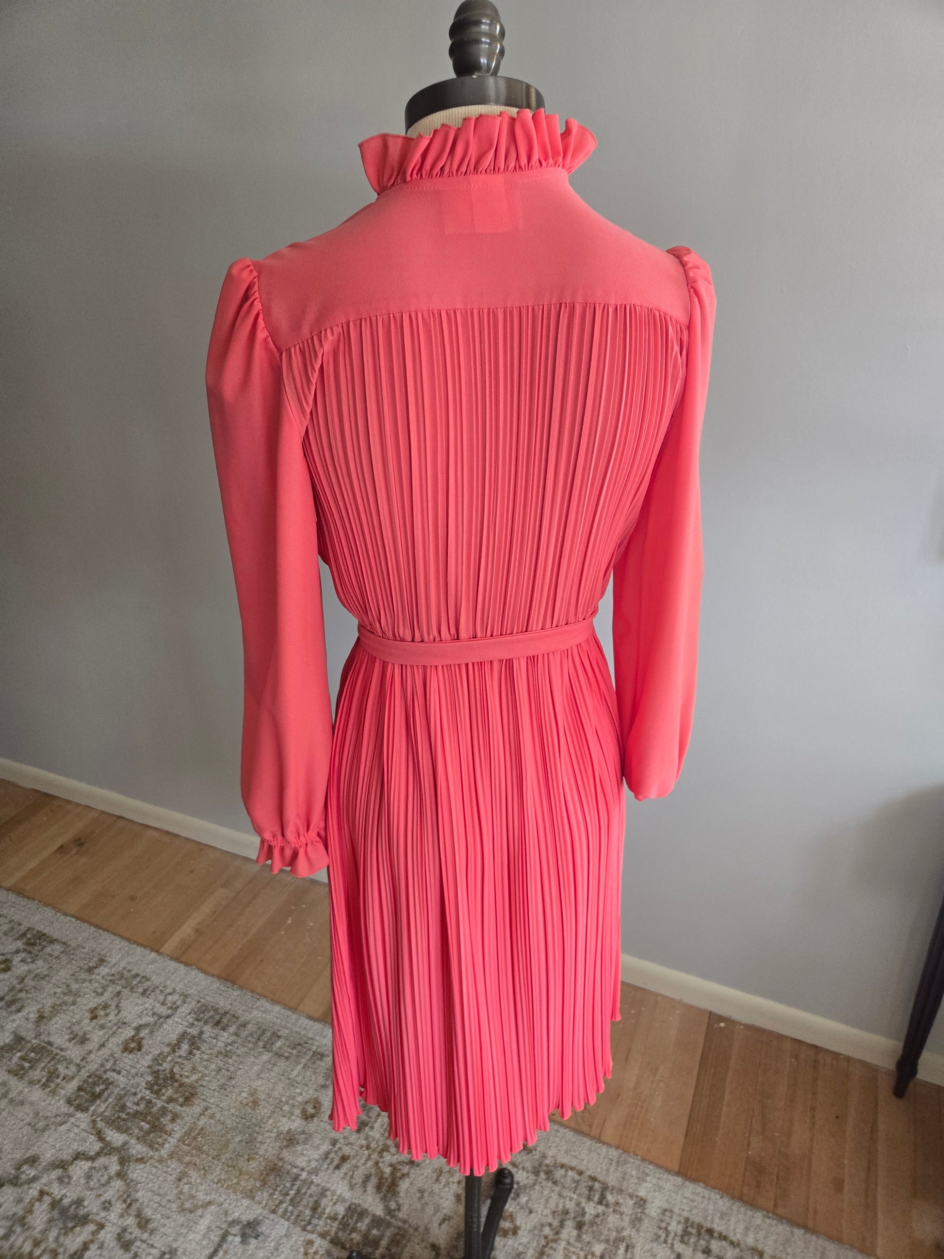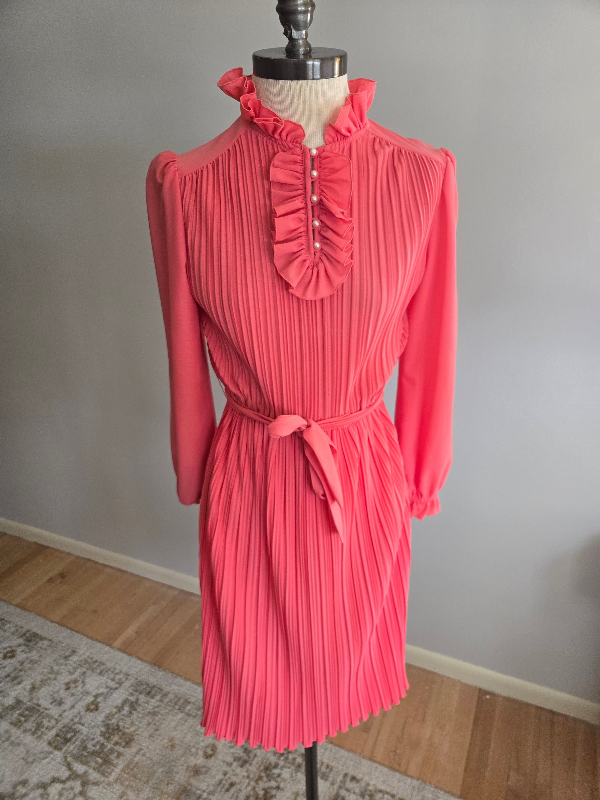 This is a gorgeous long sleeve dress from the 70s/80s by Newton Centre. Feels like all polyester, and made in the USA. Lovely pink fabric throughout. The body has a lovely ruched pleating to it, while the sleeves are flat. Five pearloid buttons on the front, slight poof at the shoulders, with fun ruffled detail at the collar and cuffs. Elastic waist feels nice and springy. Matching flat pink removable belt. Thin, light weight, sheer, soft and comfy. It's in excellent condition with years of life left! The tag says Size 10, but here are the exact measurements taken laying flat (be sure to reference the last photo to see how I measure dresses)