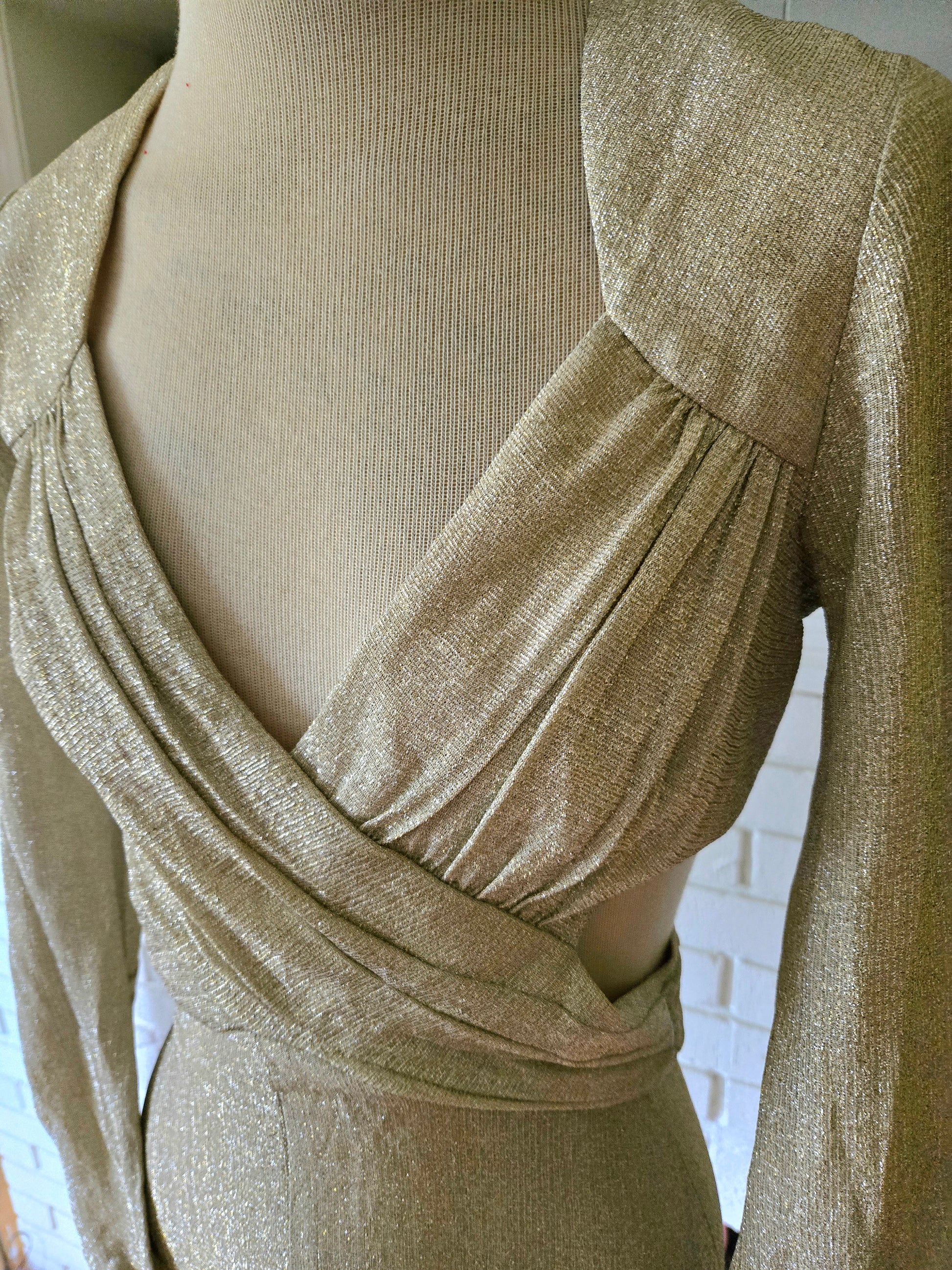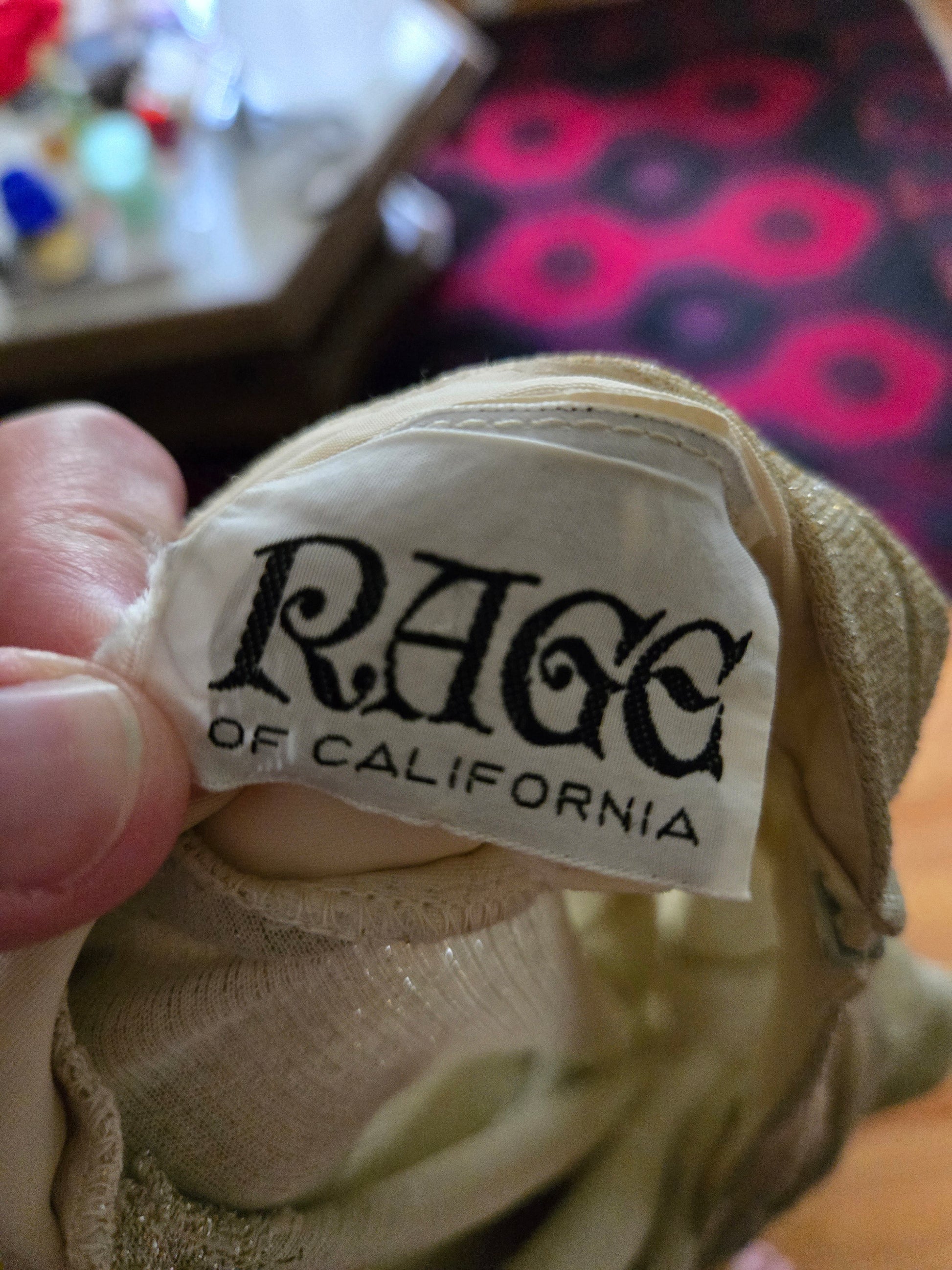 This is a wonderful long sleeve dress from the 70s/80s by Rage of California. 85% rayon, 15% metallic fabric. Gorgeous metallic shimmer to the fabric, which is a mixture of gold, silver, and tan. Sexy shape and cut on both front and back. Zipper and two buttons on the back. It's in excellent condition with years of life left, and will turn heads wherever it goes! The tag says Juniors Size 11, but here are the exact measurements taken laying flat (be sure to reference the last photo to see how I measure dresses)