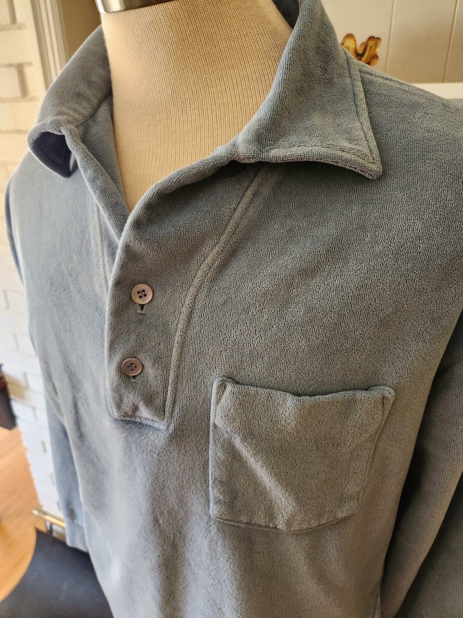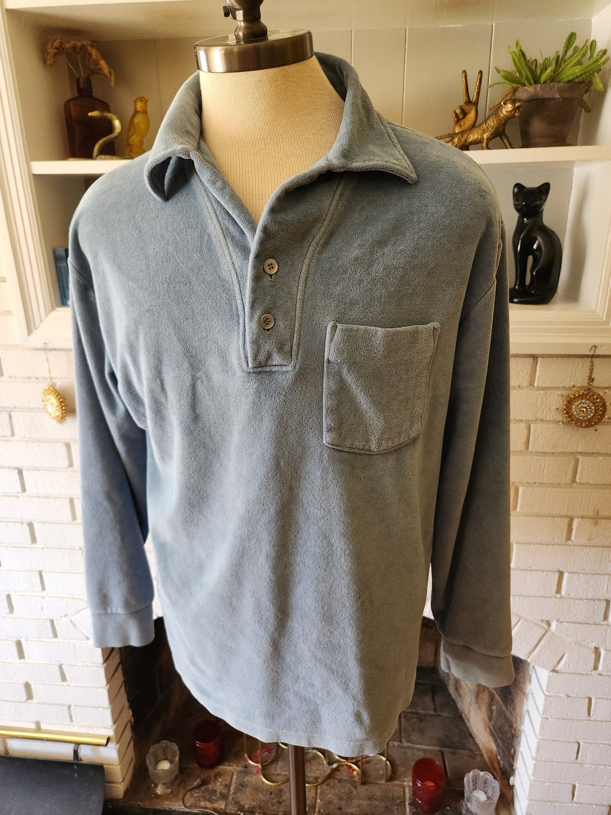 Here is an awesome vintage shirt from the 1970s by JC Penney. Most likely polyester or a poly blend. Handsome blue fabric with that amazing 70s terry cloth feel. Two button collar and a pocket on the left breast. It's medium weight, soft, comfy and in amazing condition with years of life left. The tag says XL, but here are the exact measurements, taken laying flat. (please refer to the last pic to see how I measure shirts)