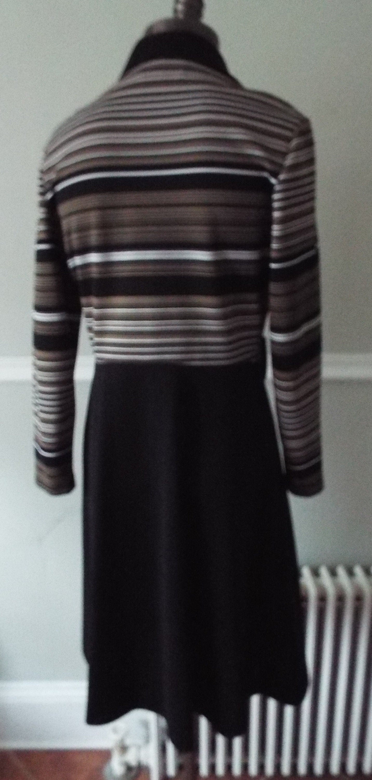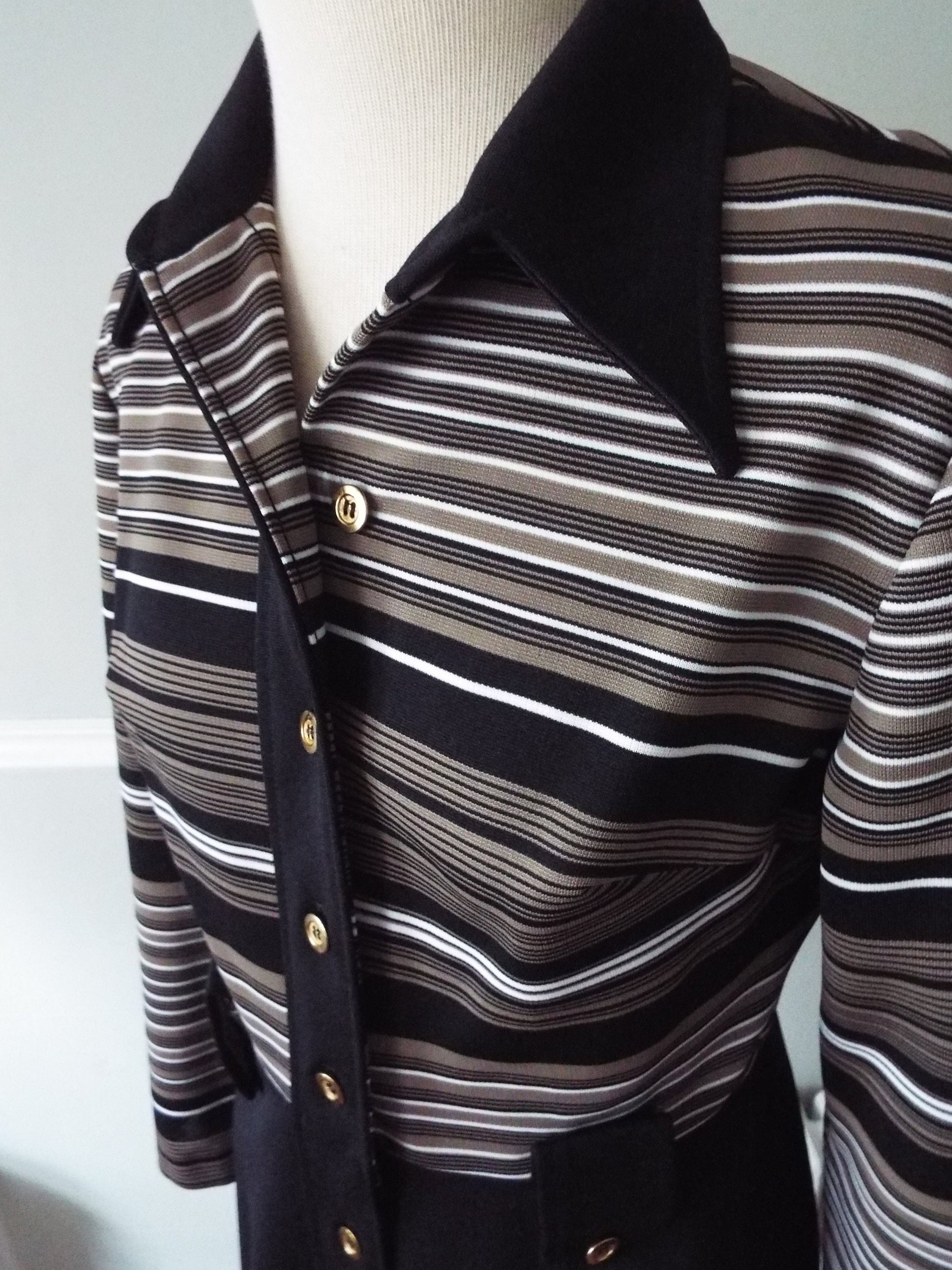 Here is an elegant long sleeve dress by Kay Windsor. Feels like poly or a poly blend. Bold striping of goldish-greenish-brown, white, and black. Nine buttons down the length of the front, with two buttoned belt loops on the waist. Fairly heavy, and would make a wonderful Fall/Winter look. Striking and vibrant in a very classy and timeless way. It's in excellent shape with tons of life left! Here are the measurements: