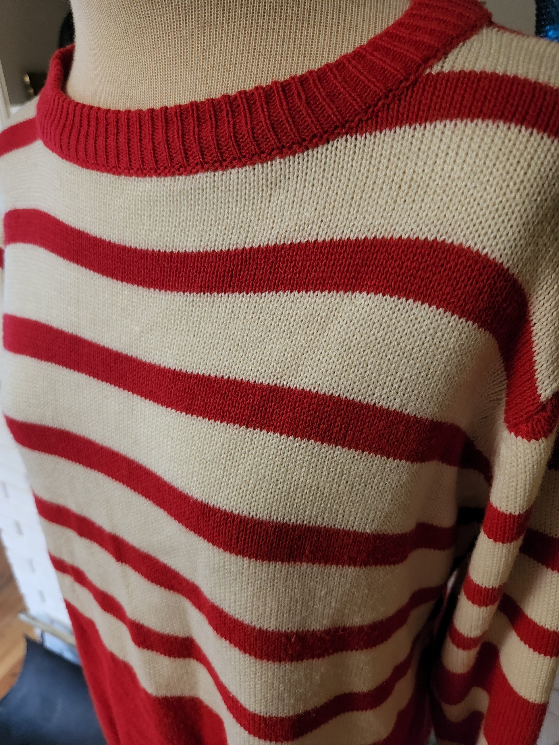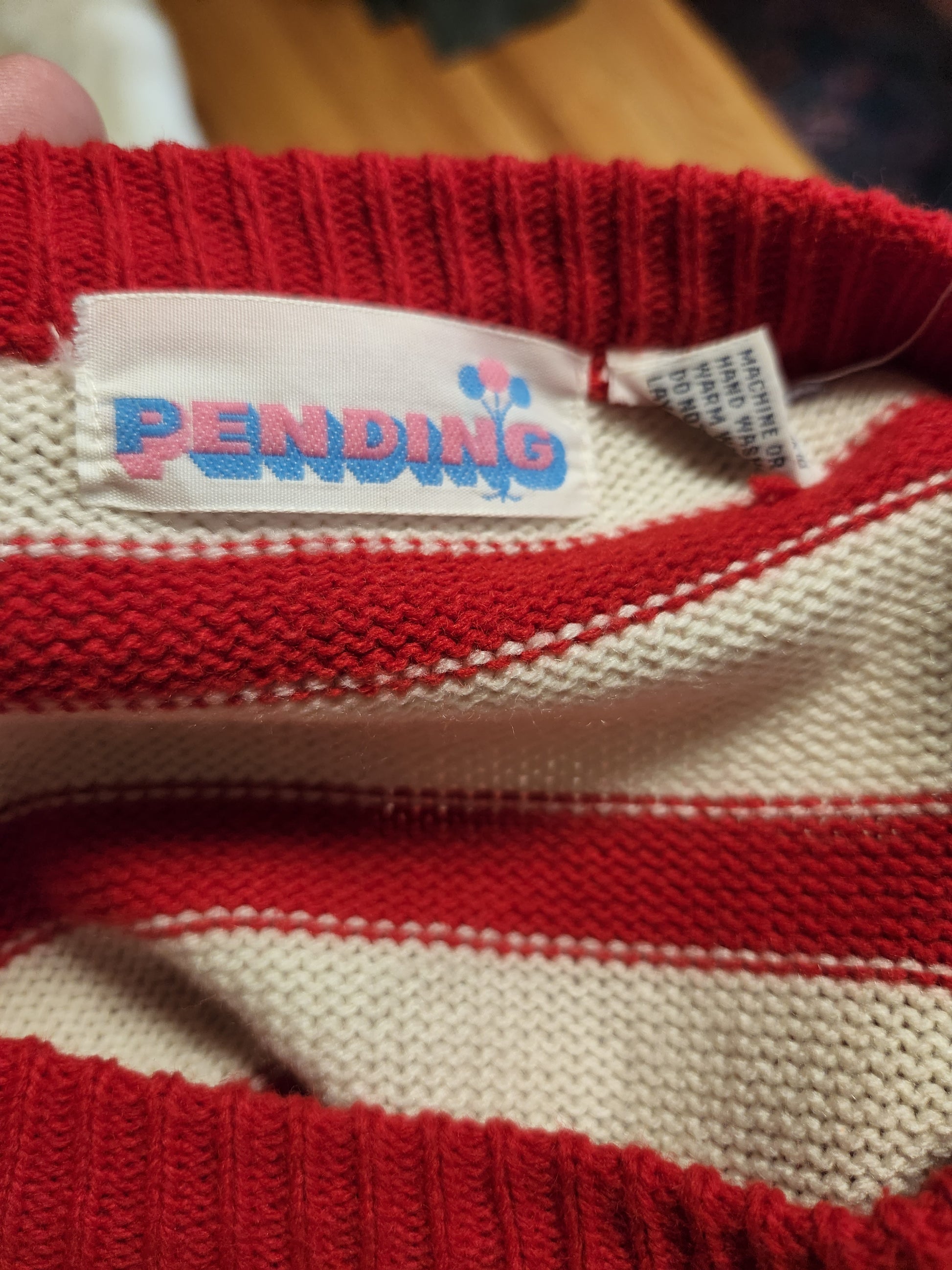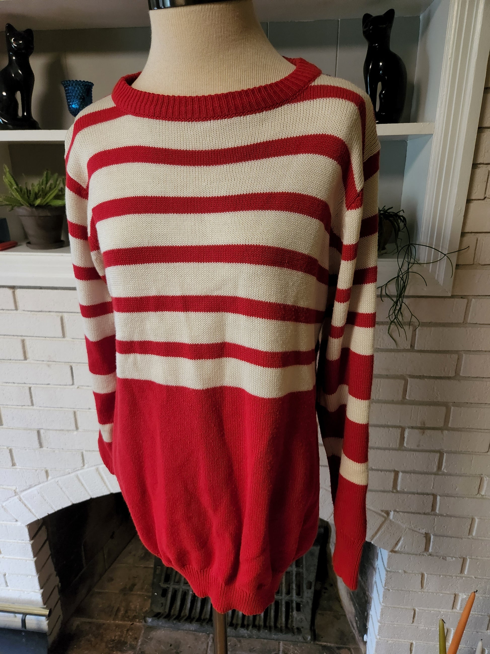 Here is a beautiful long sleeve sweater by Pending. 100% acrylic. Wonderful red and white horizontal striping. Fairly light weight, but warm, soft, comfy, and in amazing condition with tons of life left! The tag says Large, but here are the measurements taken laying flat (please refer to the last pic to see how I measure sweaters)