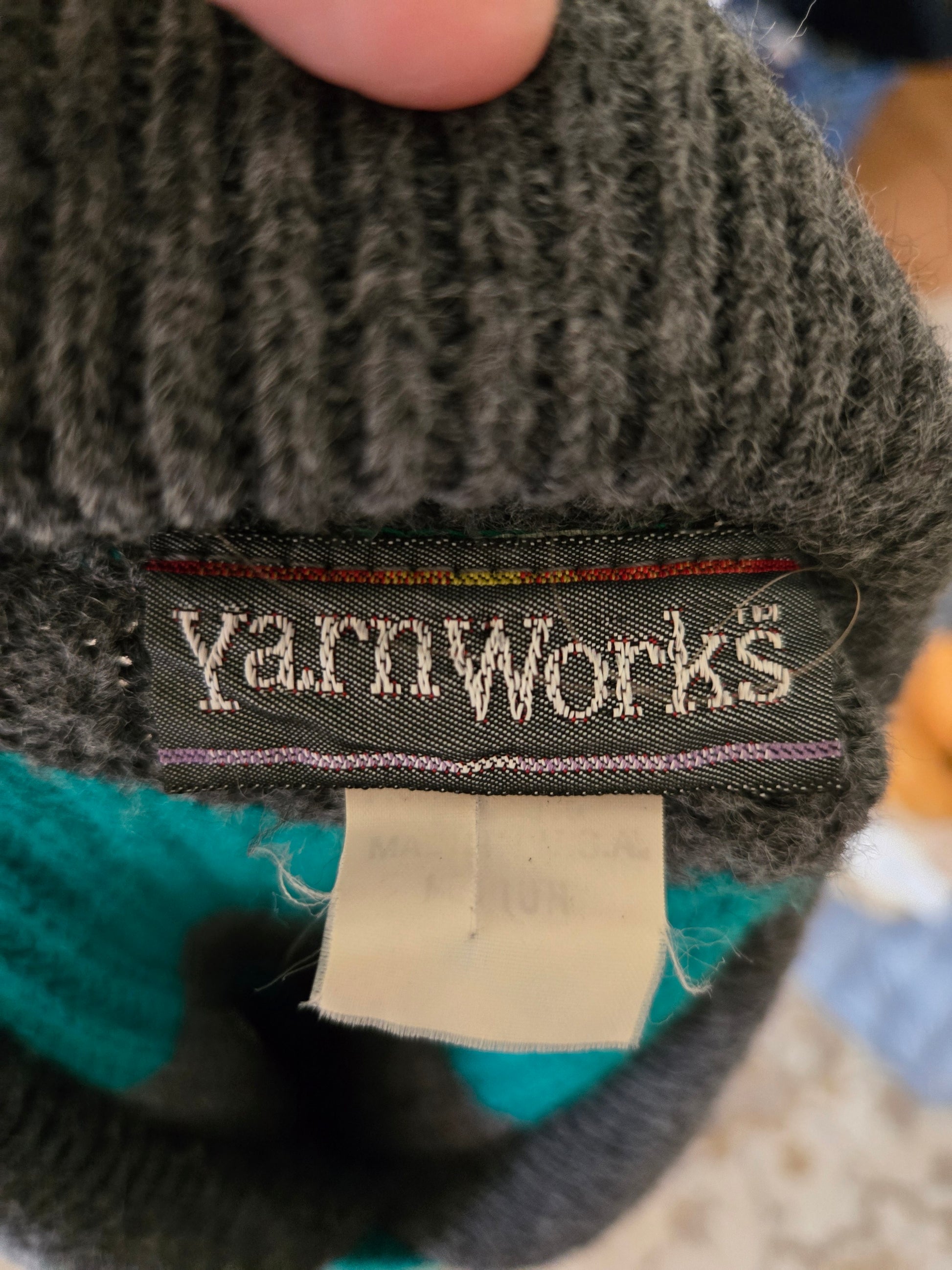 Here is a super cool vintage sweater from the 80s by Yarn Works. Feels like acrylic or a blend. Sweet striping of green (much more green in person than they teal that shows up in the pics) and gray, with a collar sewn in. Medium weight, slightly sheer, soft, warm and comfy. It's in excellent condition with years of life left. Here are the measurements taken laying flat. (refer to the last pic above to see how I measure shirts)