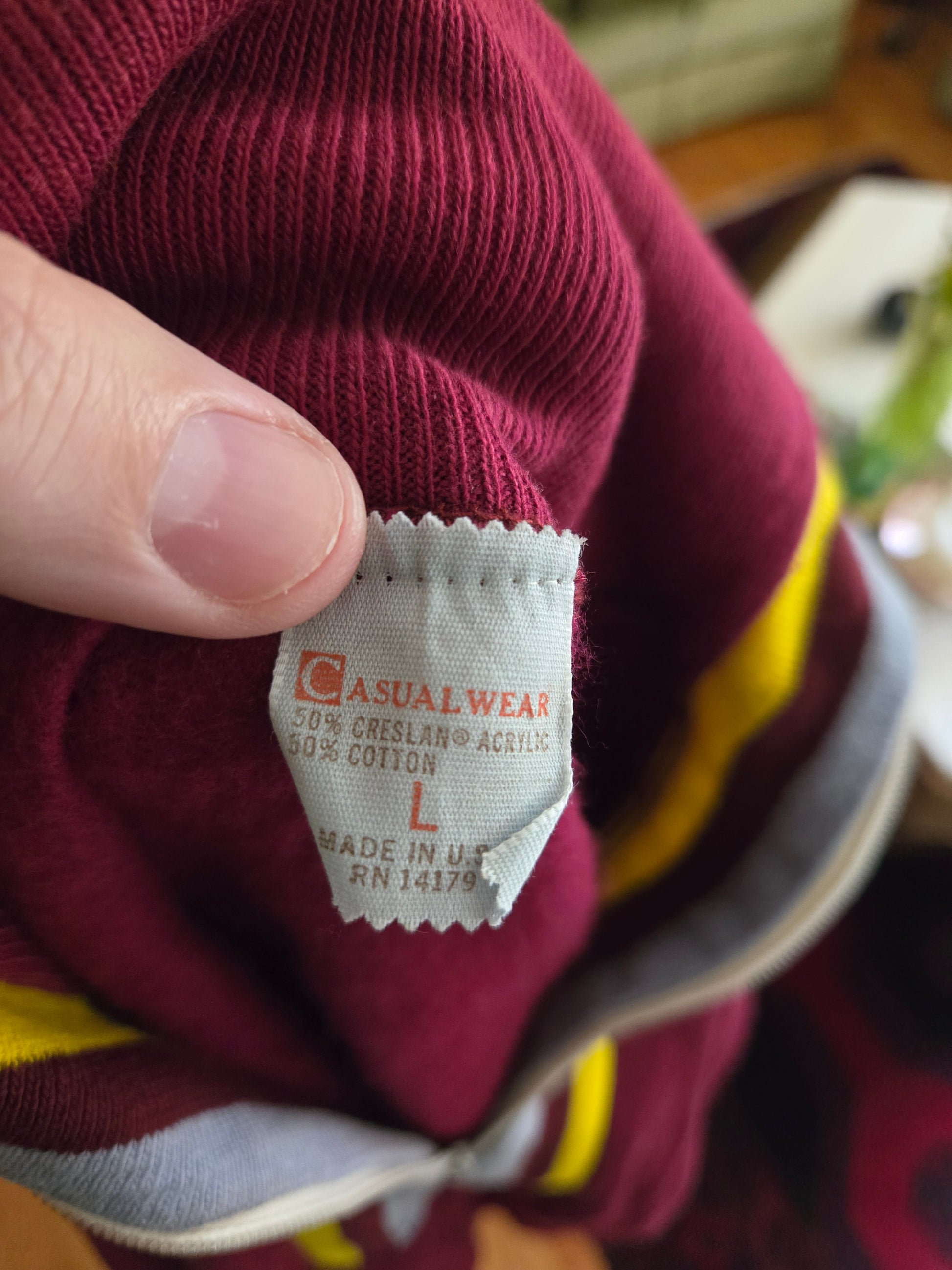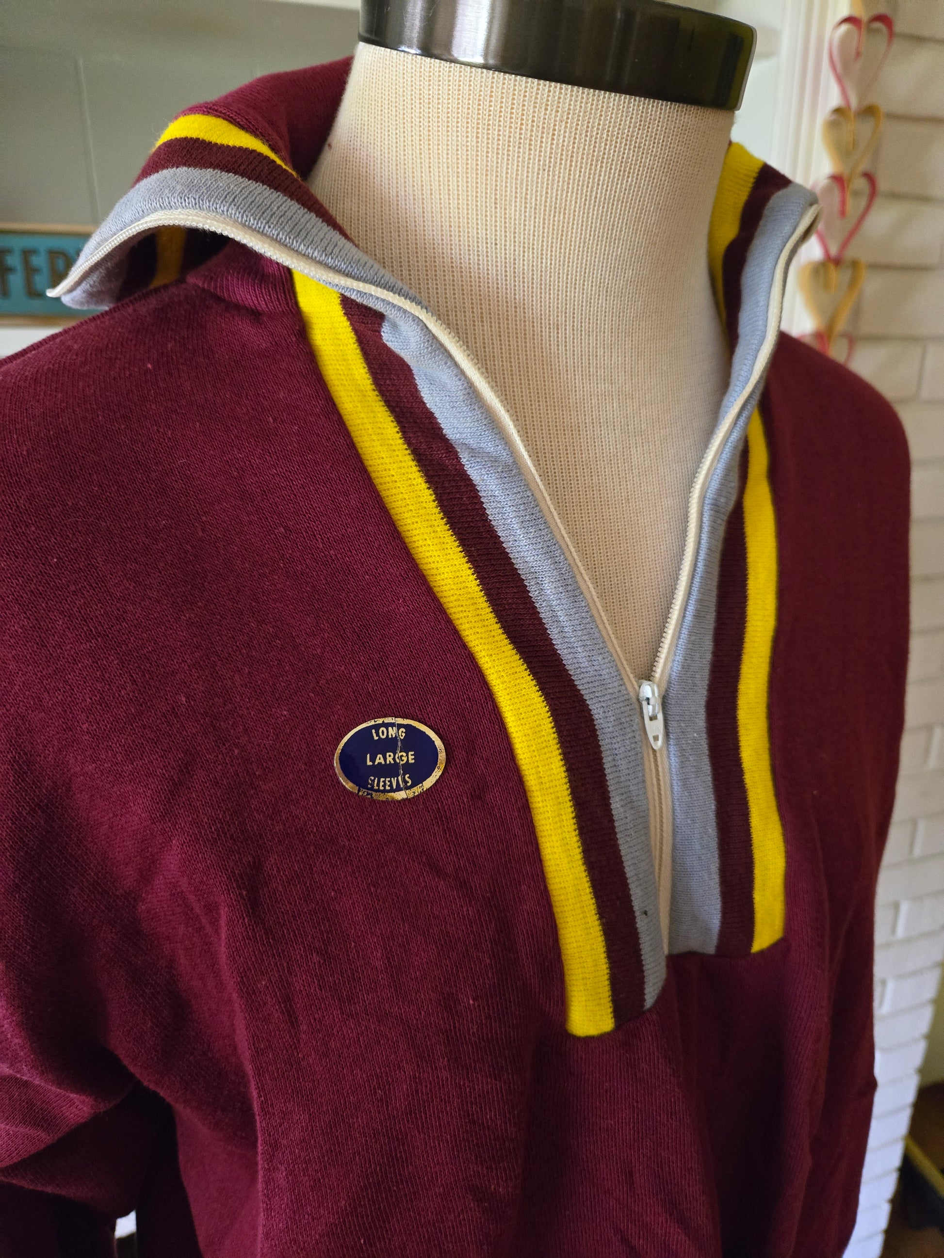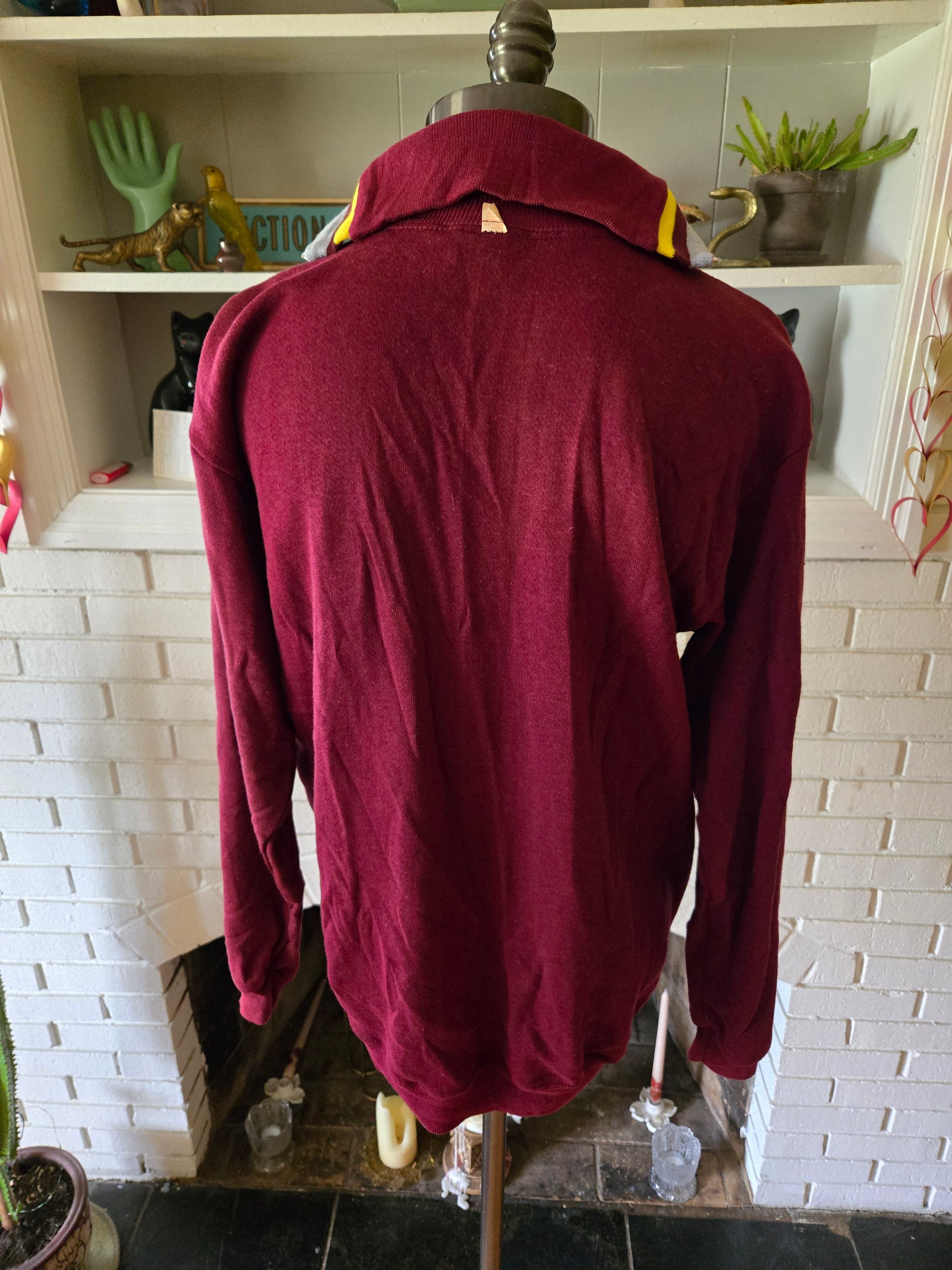 Here is a super cool vintage long sleeve sweatshirt from the 70s by Casualwear. 50% cotton, 50% acrylic, and made in the USA. Maroon fabric with gray and yellow accents. Zippered front. And it's never been worn!! It still has the original tags on it. It's medium weight, super soft and comfy, and it's in excellent, like new condition with years of life left! The tag says Large, but here are the measurements taken laying flat. (refer to the last pic above to see how I measure shirts)