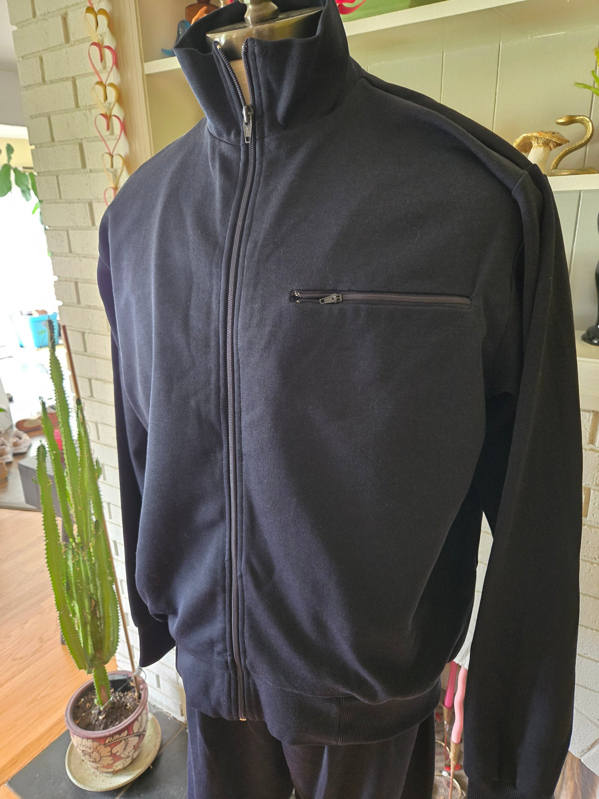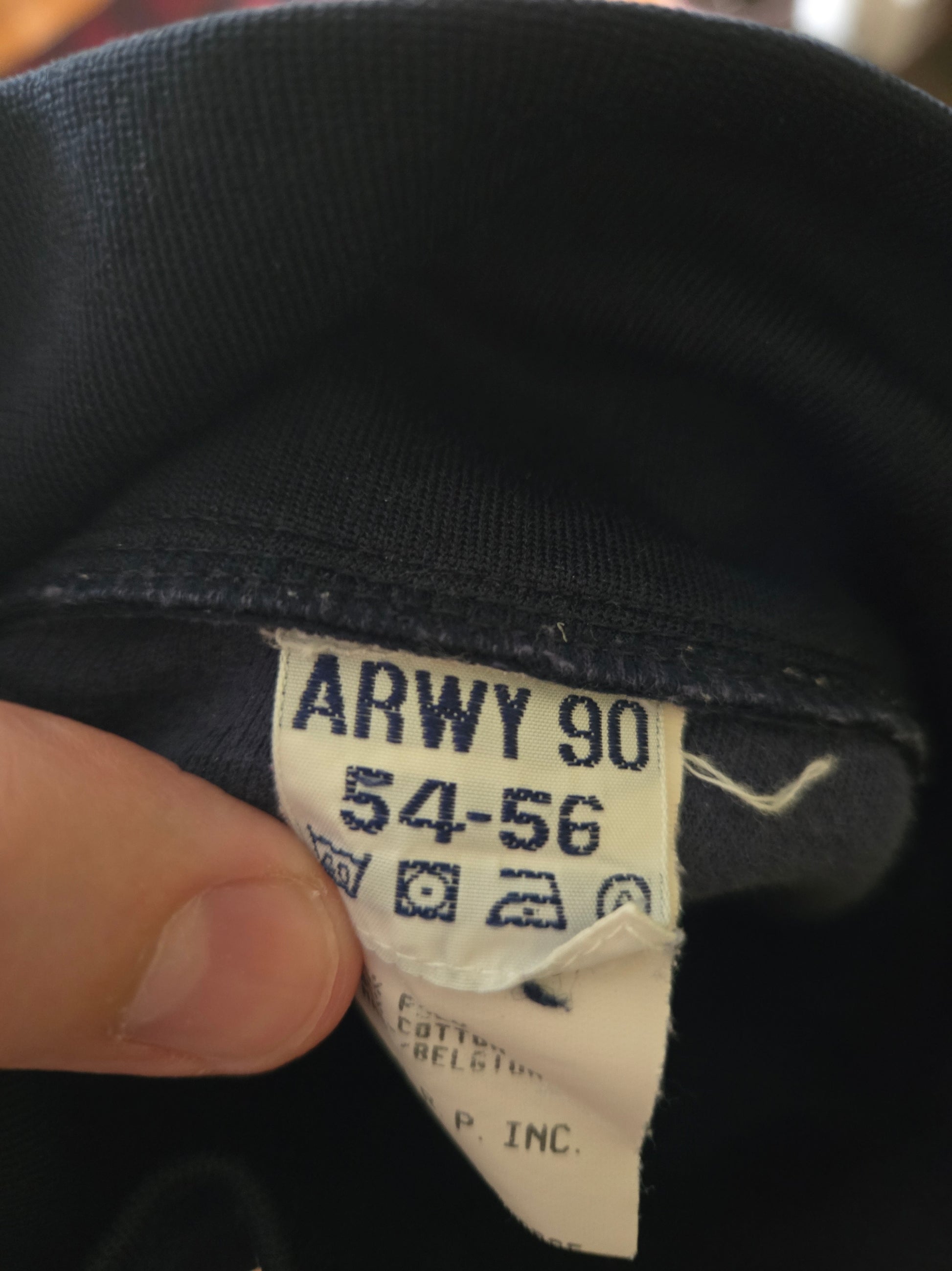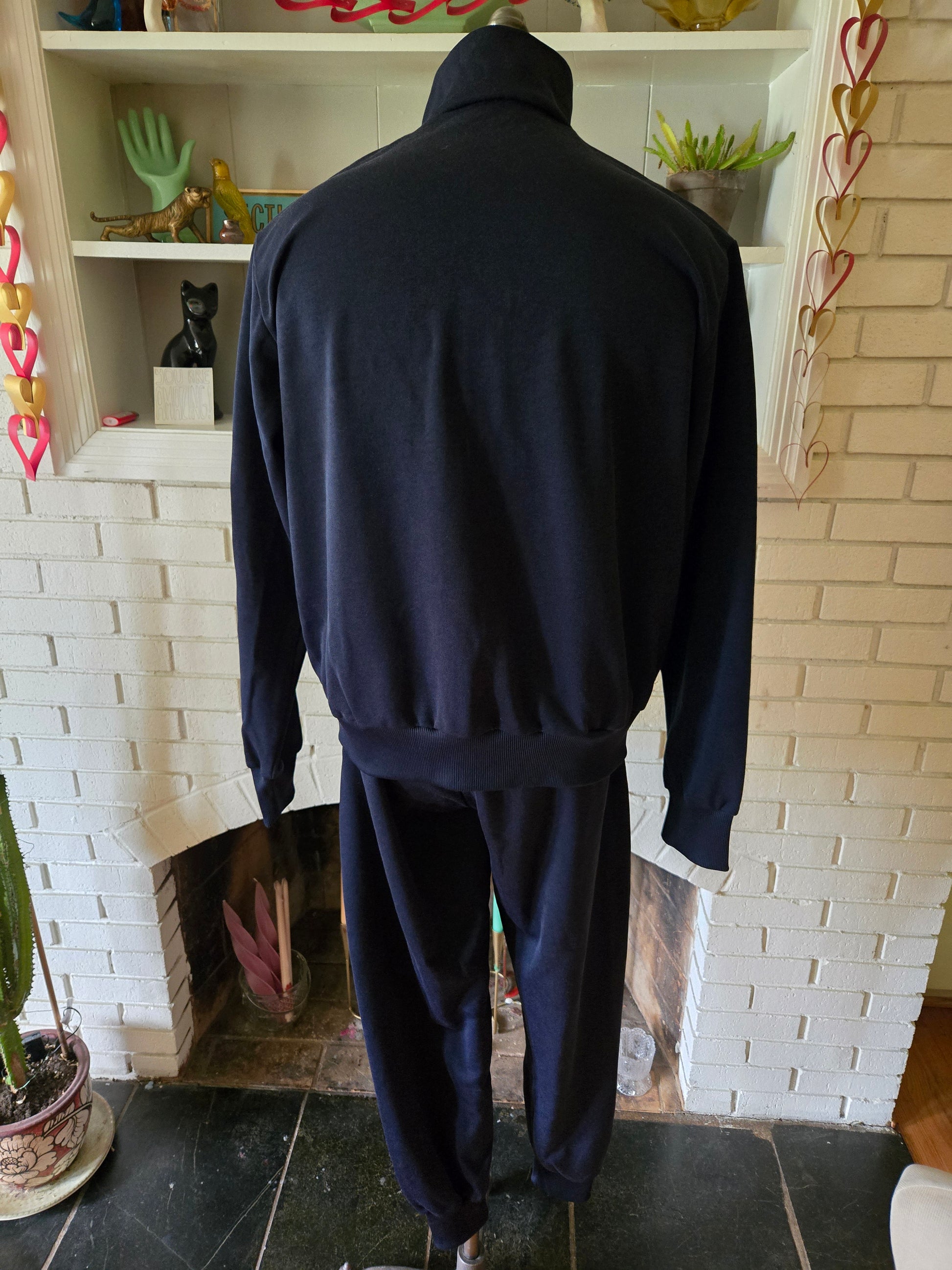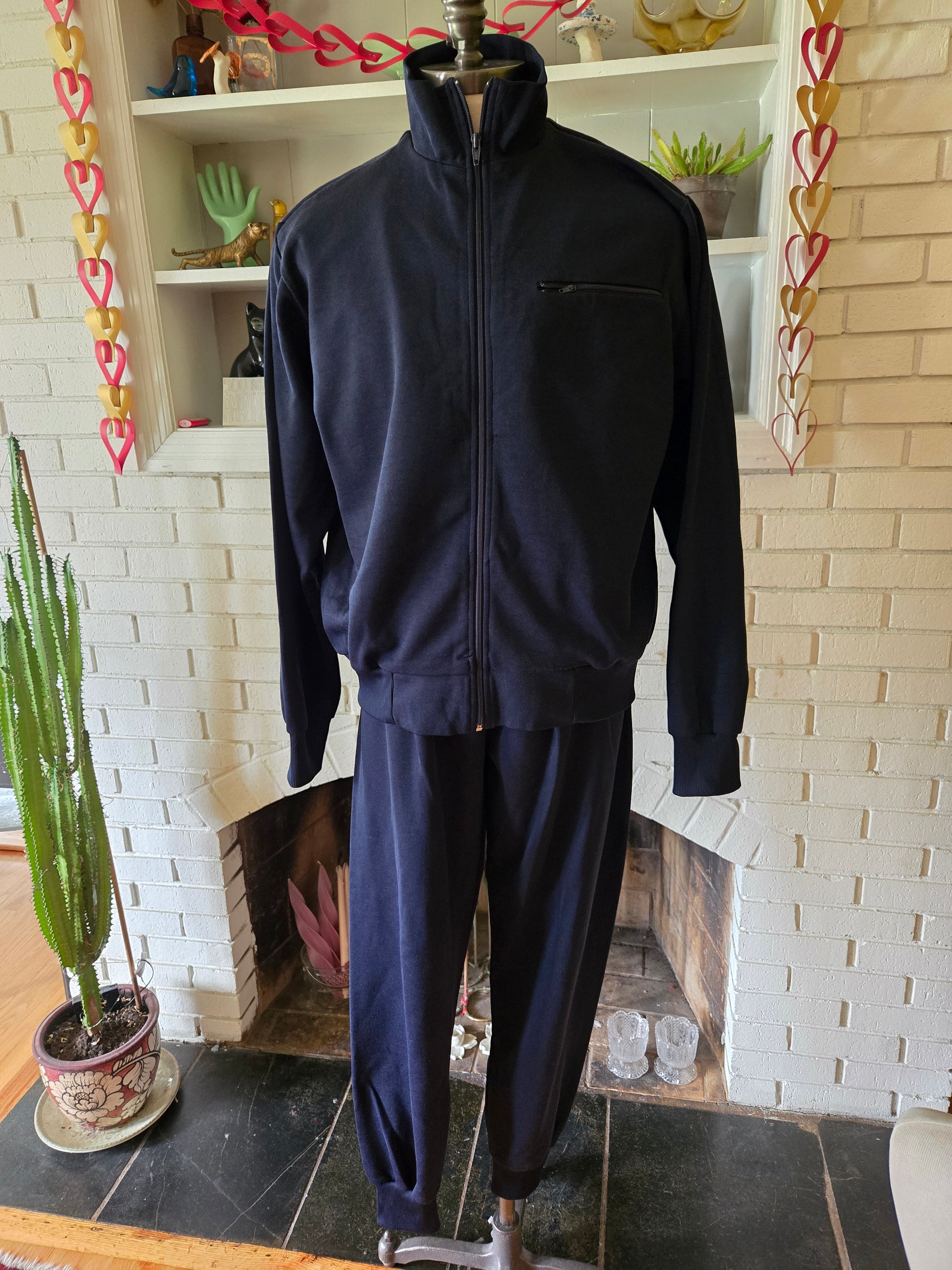 Here is a super cool track suit by ABL ARWY. 65% polyester, 35% cotton, and made in Belgium. Dark blue fabric throughout. The jacket has a zippered front with a zippered pocket on the left breast. The pants have an elastic waist. Very little comes back when searching for this one, so I'm not quite sure what decade this comes from. It's medium weight, incredibly well made, and fells like it's rarely been worn. It's in amazing condition with tons of life left! The tag says 54-56 (European sizing), but here are the measurements taken laying flat (refer to the last pic above to see how I measure shirts)