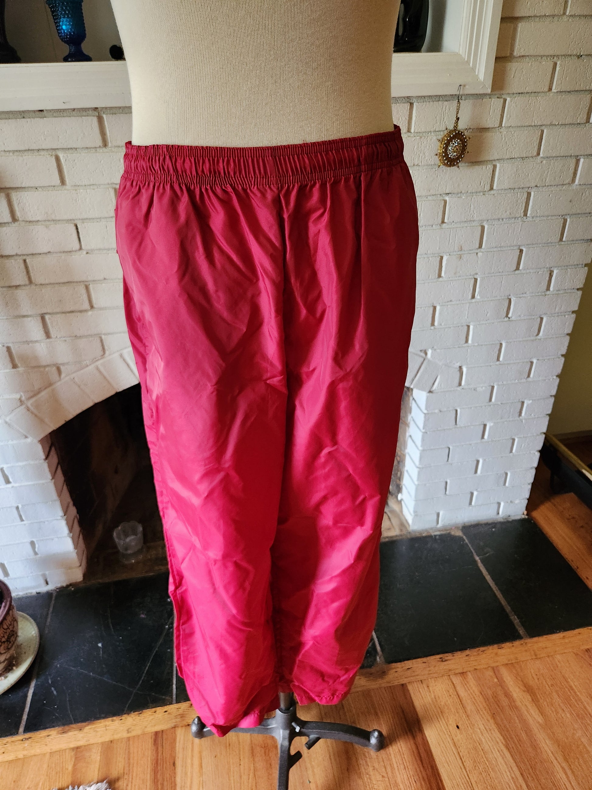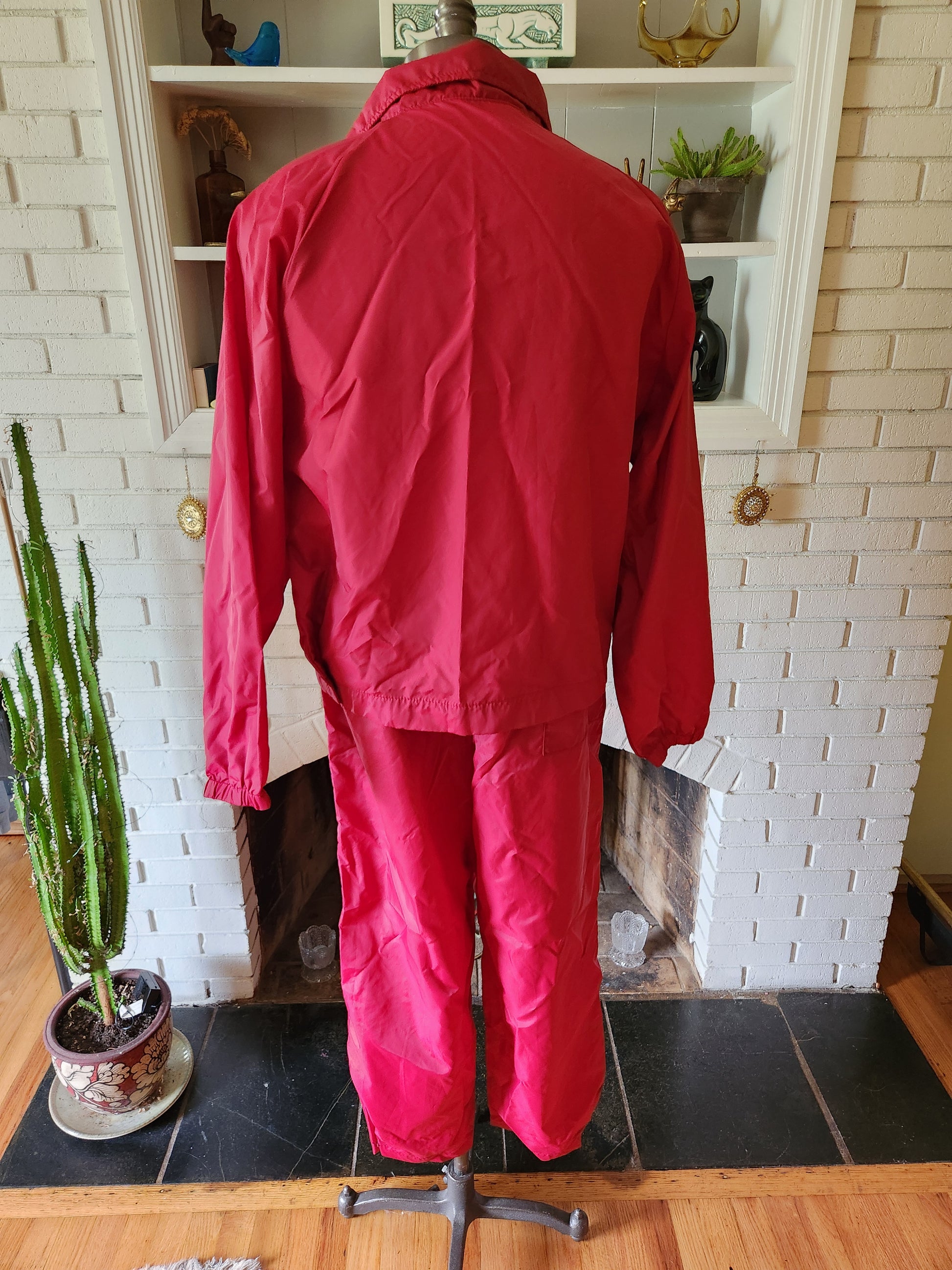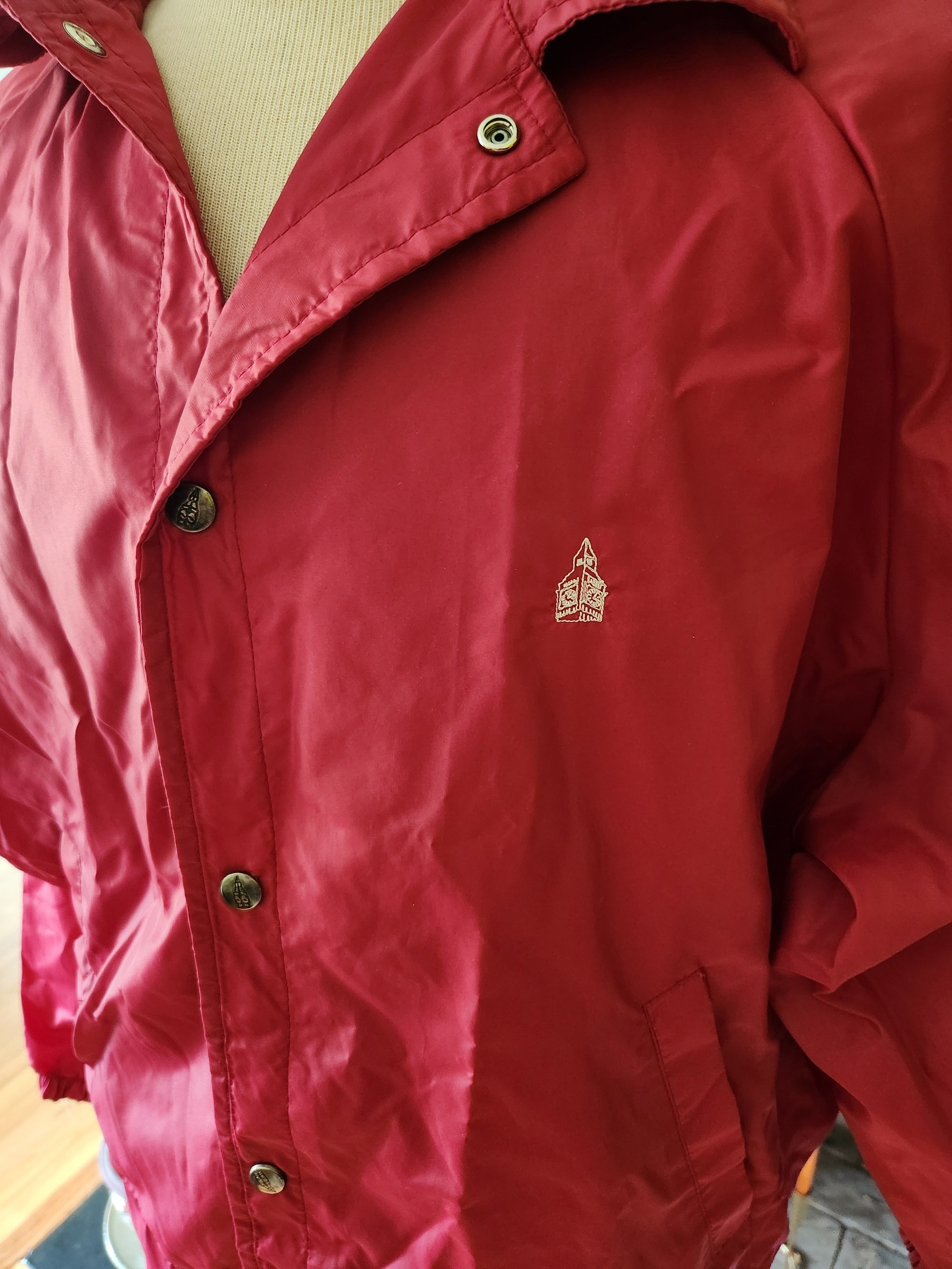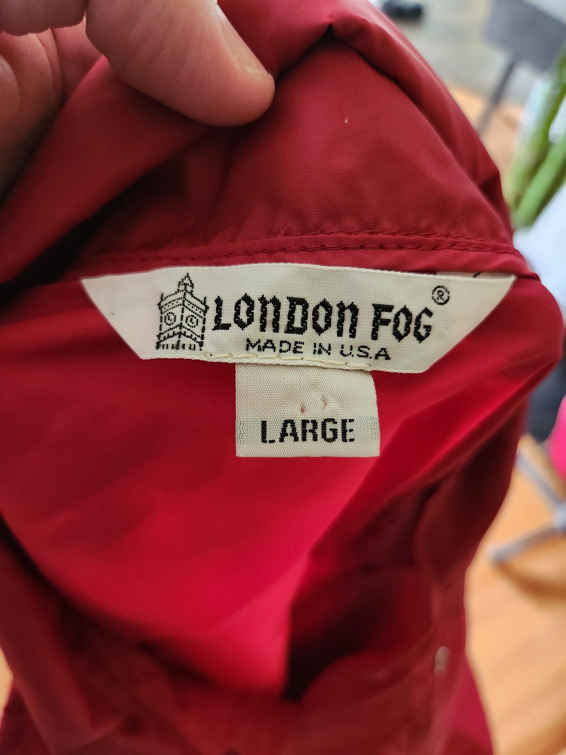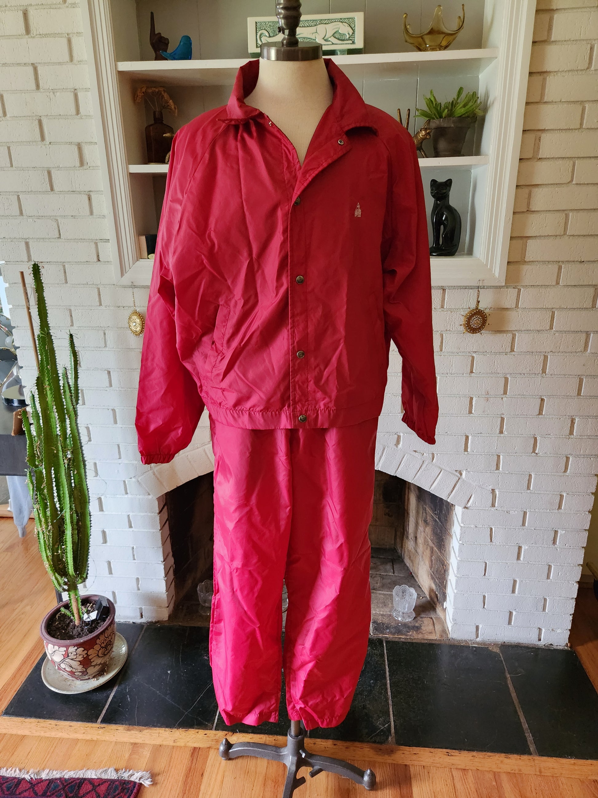 Here is a cool windbreaker track suit from the 80s by London Fog. It's most likely all polyester or nylon, and made in the USA. Maroon set with white tower logo embroidered on the left breast of the jacket. The jacket also has a five button front, a pocket on each hip, elastic at the cuffs, and a velcro fastener on each side to slightly tighten or loosen the fit. The pants have a drawstring waist, a pocket on each hip, a velcro pocket on the back right, and velcro at the cuffs to snug the fit. Thin, light weight, and sporty. This set is in amazing shape with tons of life left! The tag says Large, but here are the measurements taken laying flat (refer to the last pic above to see how I measure shirts)