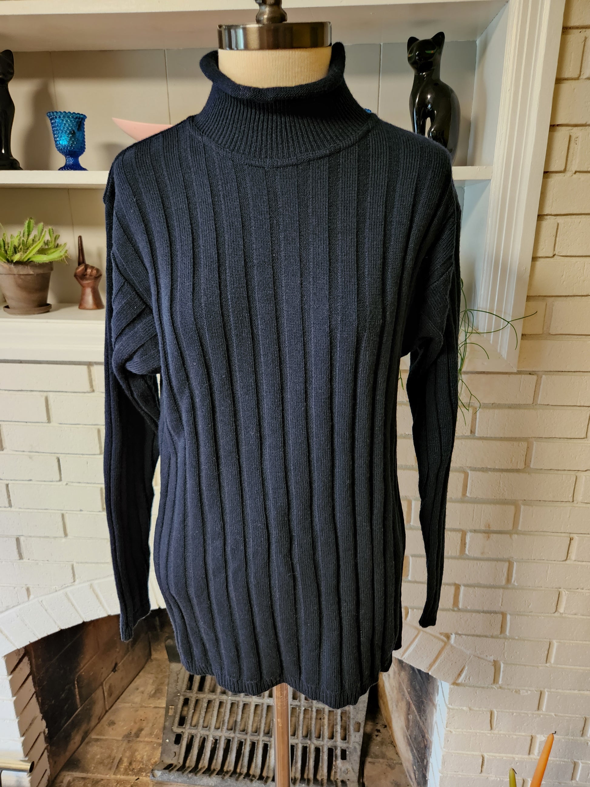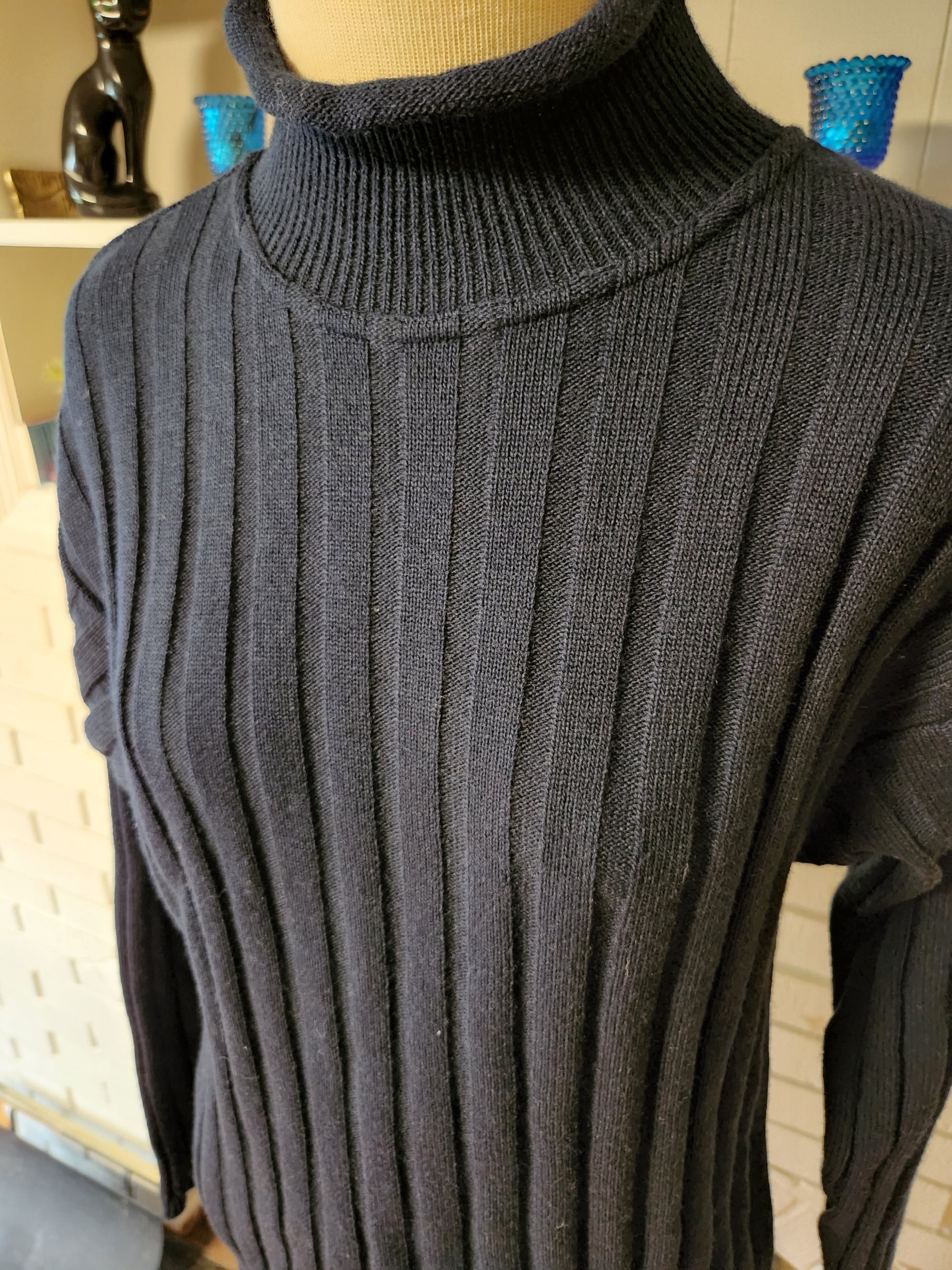 Here is a timeless long sleeve sweater, most likely from the 1970s. The tag is hard to read, but it's a blend of polyester and acrylic at least, and made in Italy. Dark blue fabric with deep ribbing and almost a mock turtleneck. Medium weight, soft, comfy, and in excellent shape. This is a beautiful sweater with lots of life left! Here are the measurements taken laying flat (refer to the last pic above to see how I measure shirts)