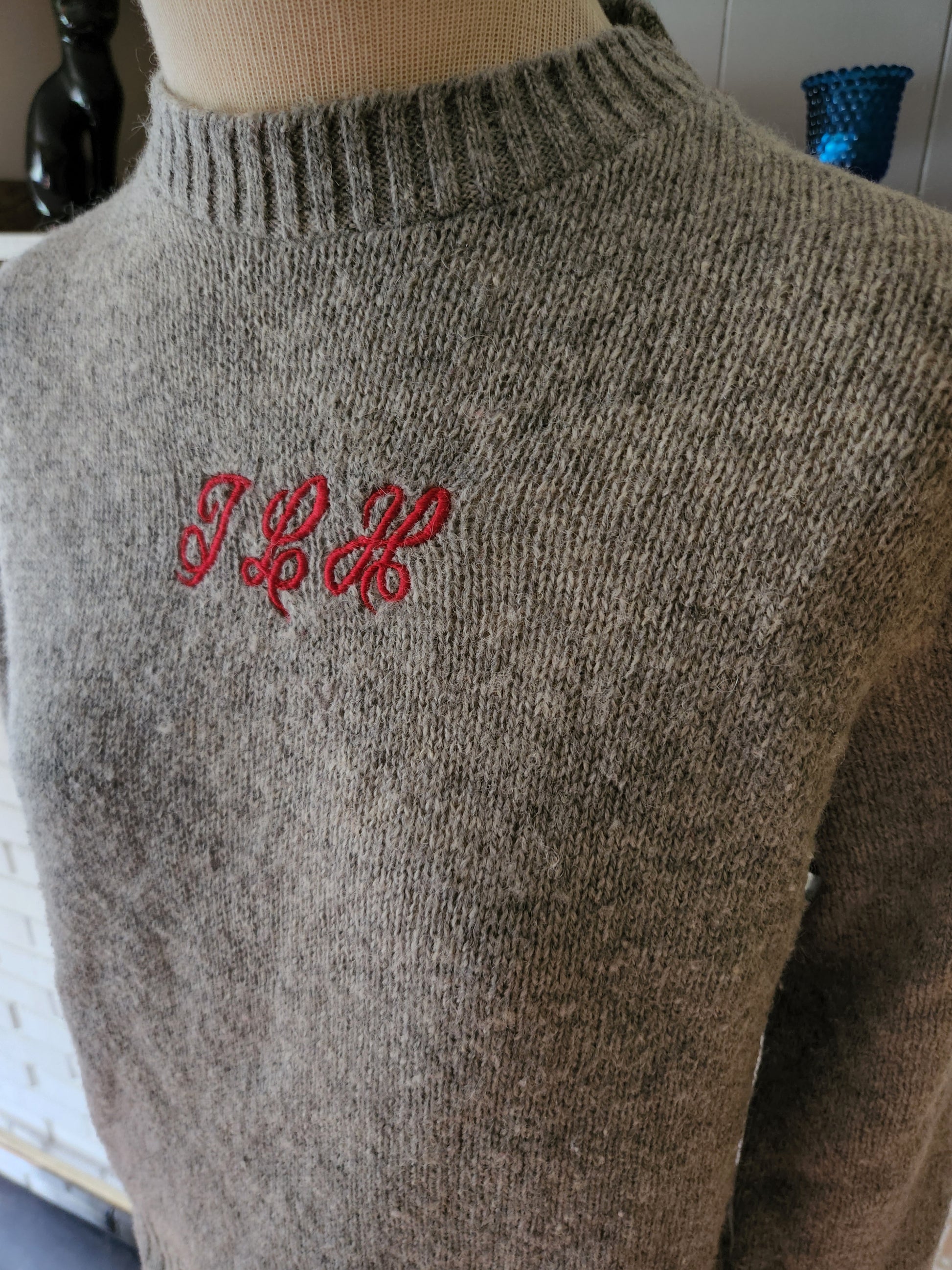 Here is a wonderful long sleeve sweater by Jantzen. Feels like it could be a wool blend, and made in the USA. Classic gray sweater with red initials embroidered on the front. Fairly light weight, but warm, soft and comfy, and in amazing condition with tons of life left! The tag says Large, but here are the measurements taken laying flat (please refer to the last pic to see how I measure sweaters)