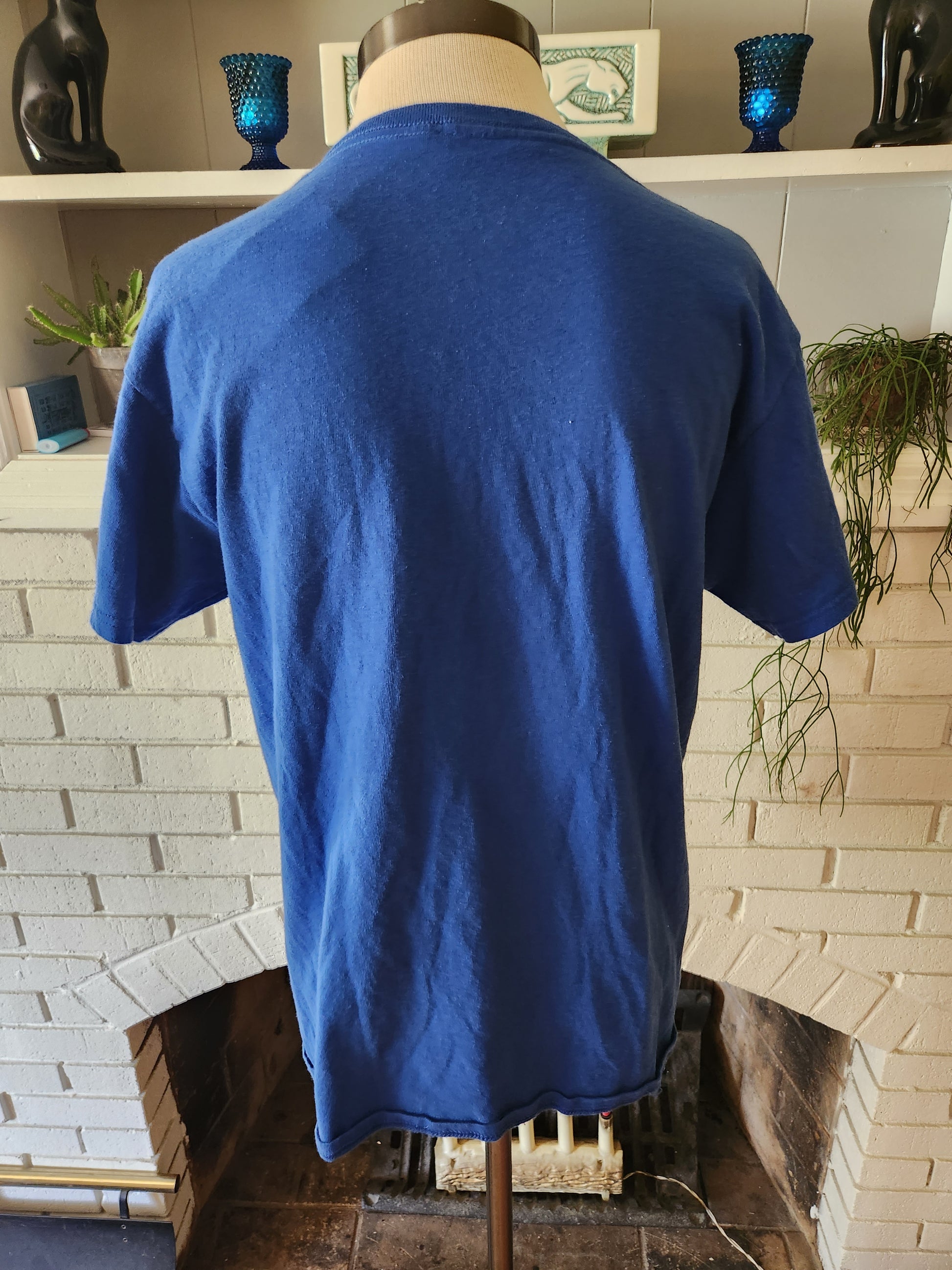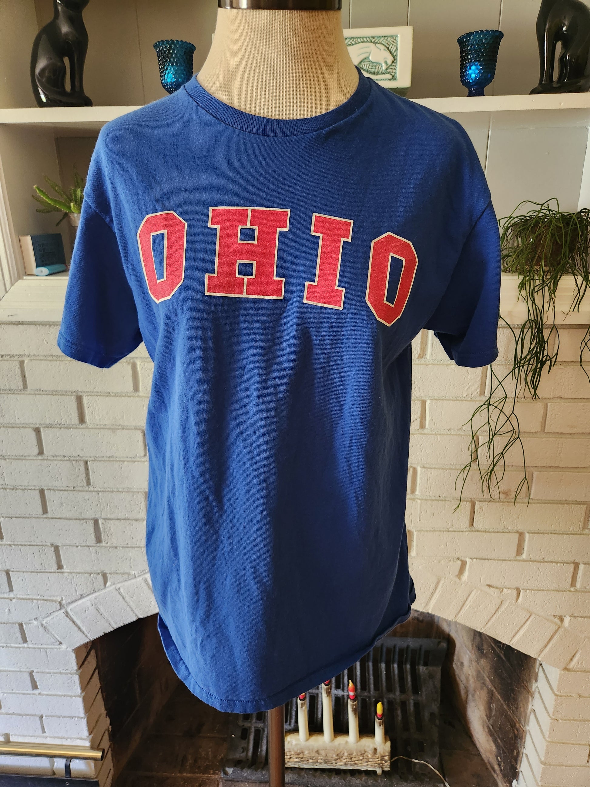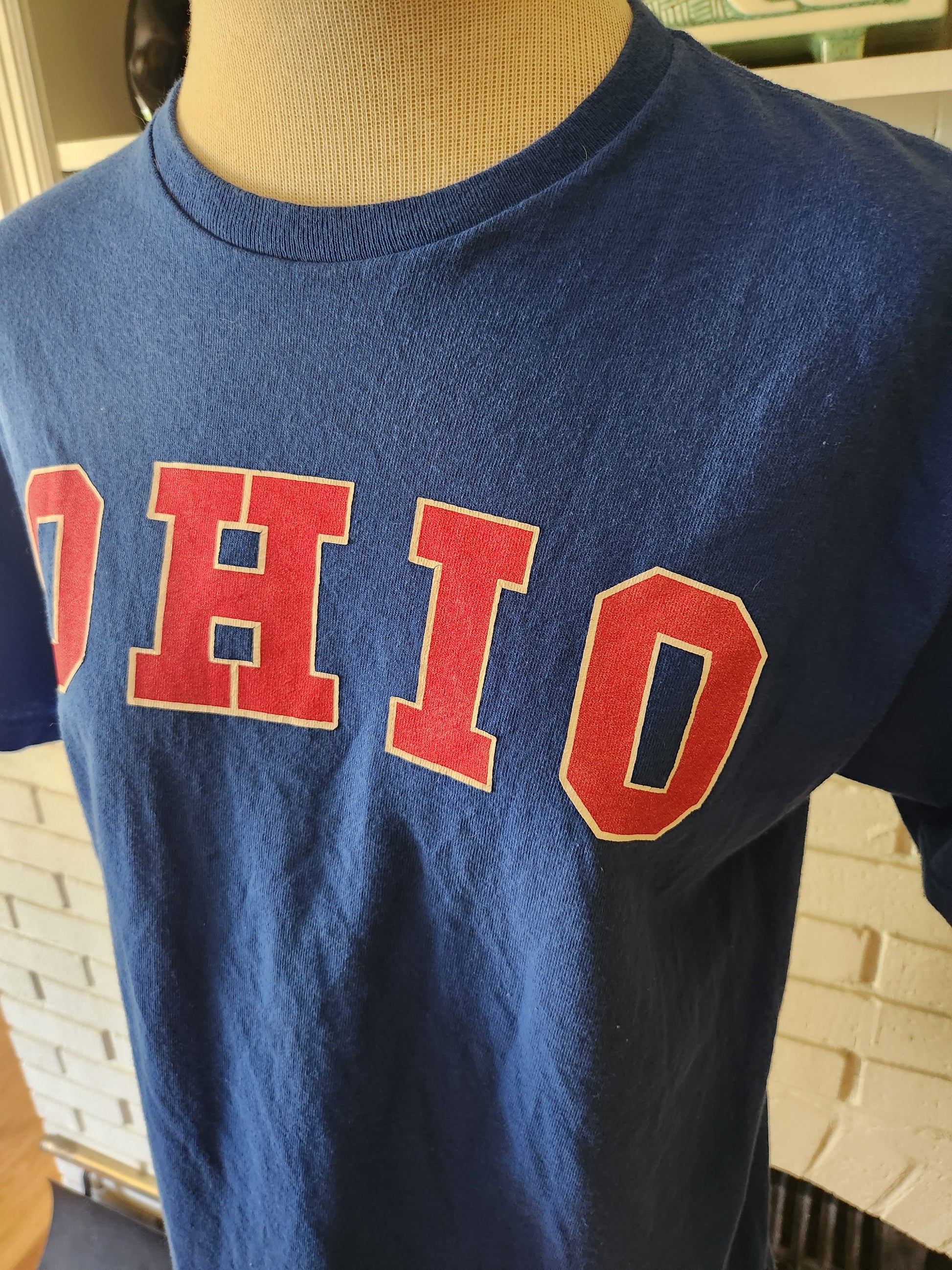 Here is a great vintage T-shirt. Feels like a cotton blend. Blue shirt with OHIO graphic on the front in red and white. Medium weight, soft, and comfy. It's in incredible condition with tons of life left. Here are the measurements taken laying flat (please refer to the last pic to see how I measure shirts)