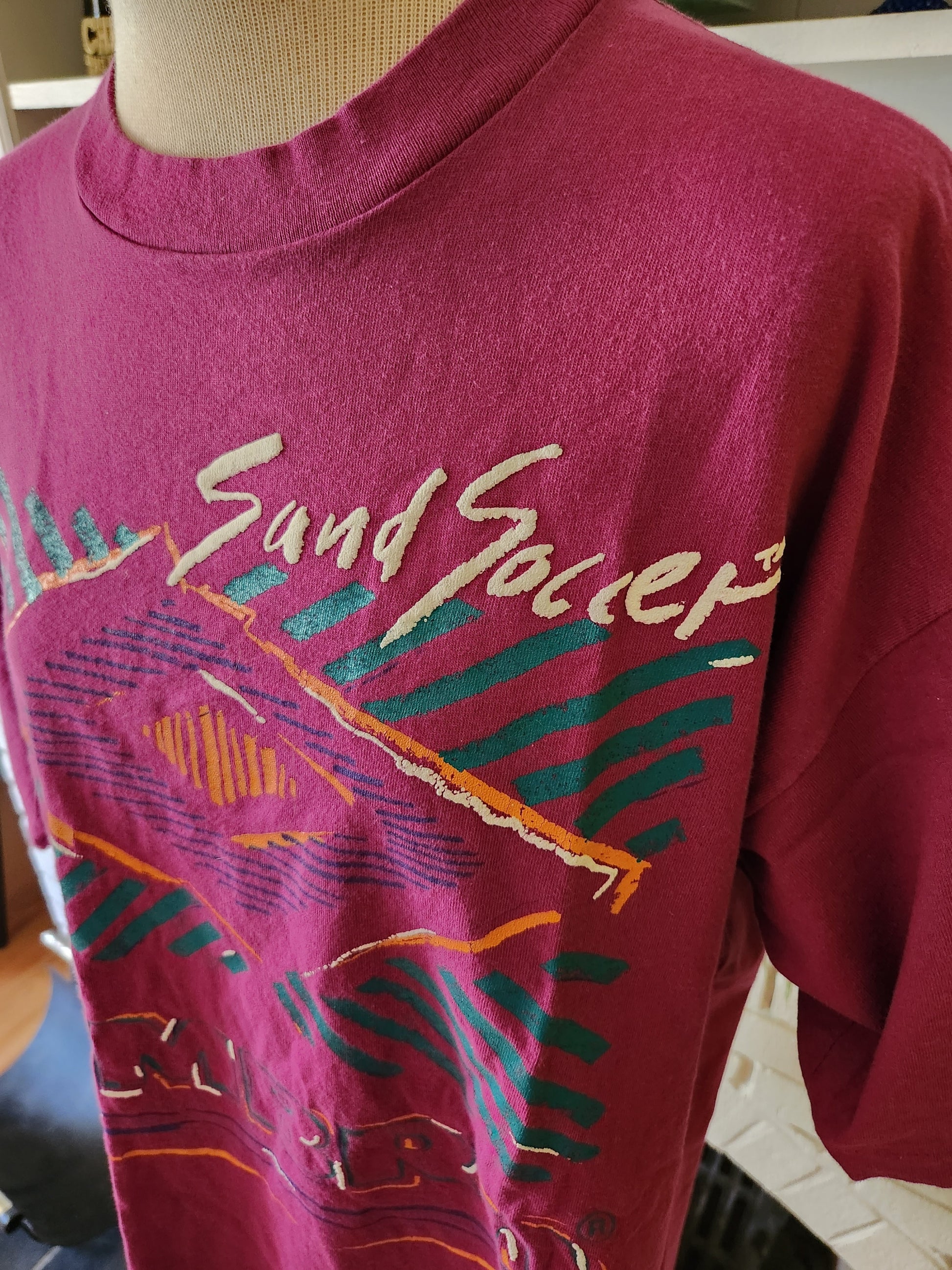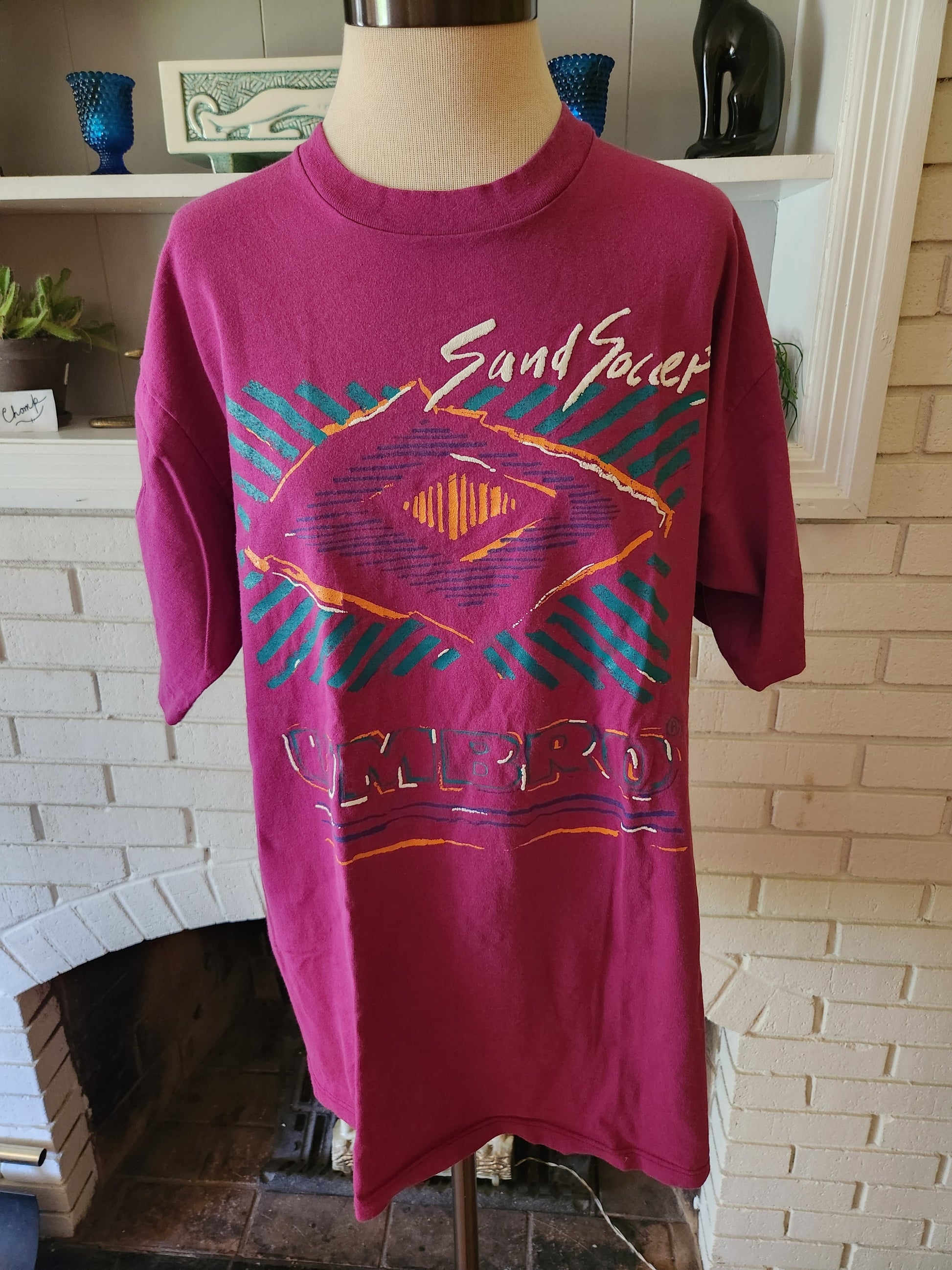 Here is a great vintage T-shirt by Umbro. 100% cotton and made in the USA. Purple shirt with bold and colorful Sand Soccer graphic on the front. Logo on the back in green. Medium weight, soft and comfy. It's in incredible condition with tons of life left. The tag says Adult Large, but here are the measurements taken laying flat (please refer to the last pic to see how I measure shirts)