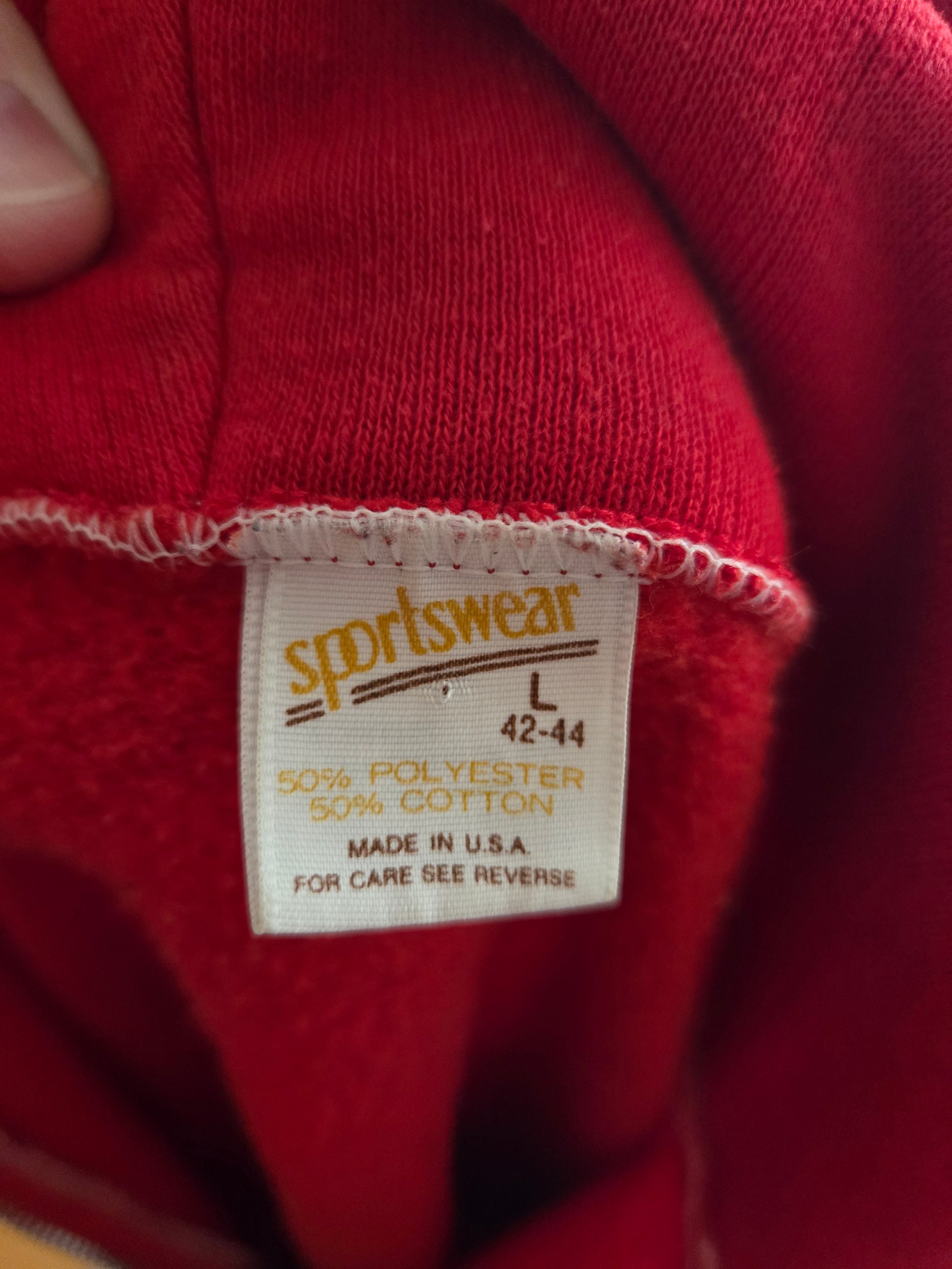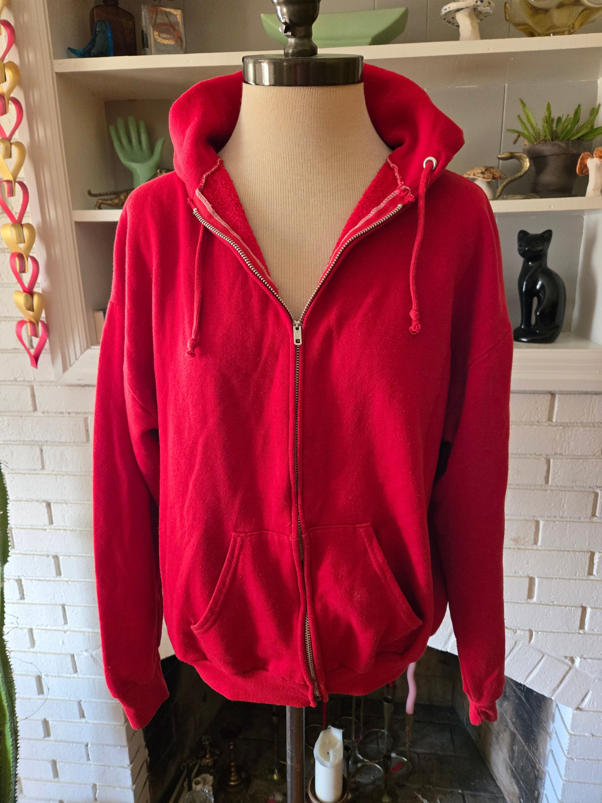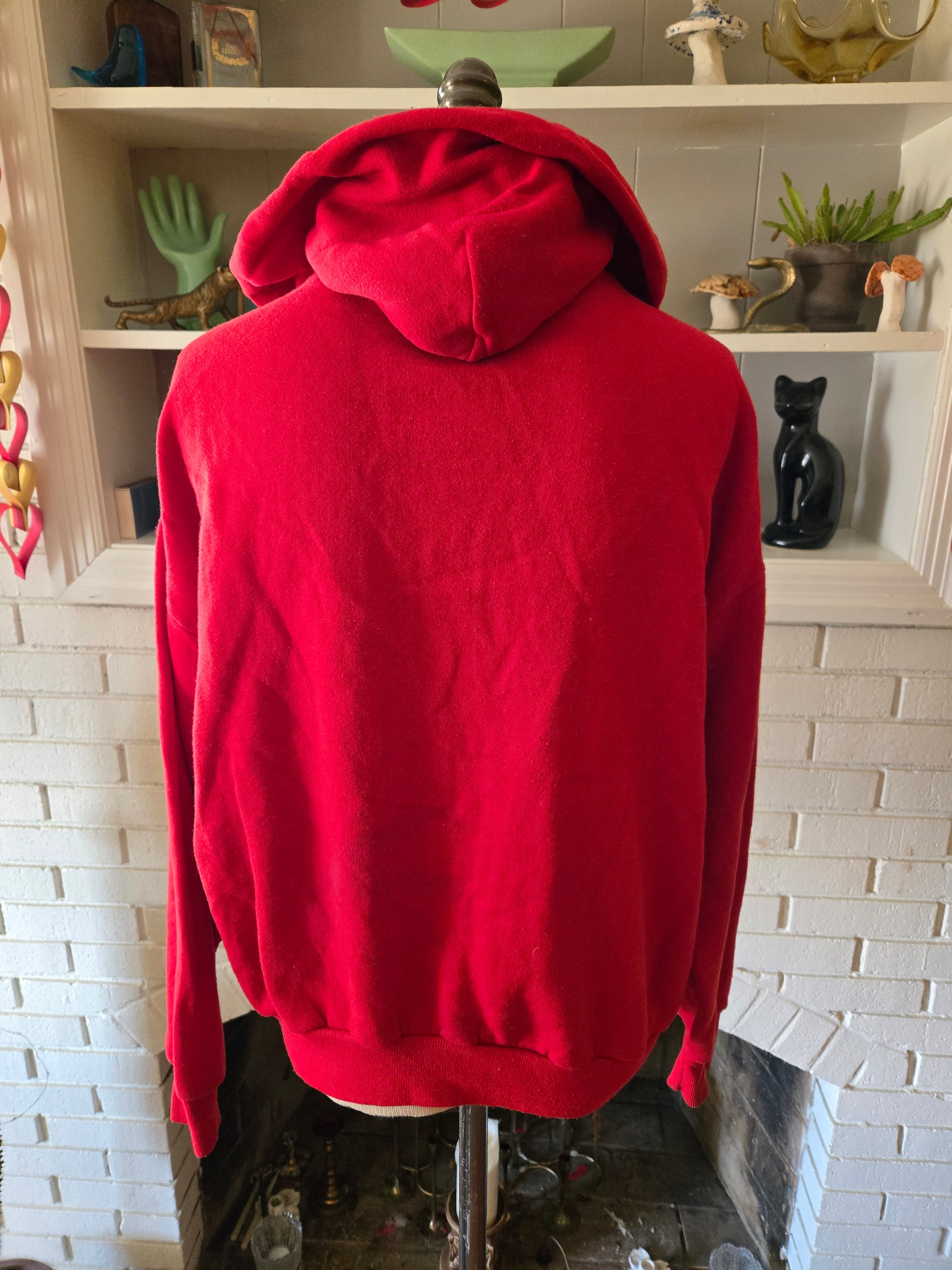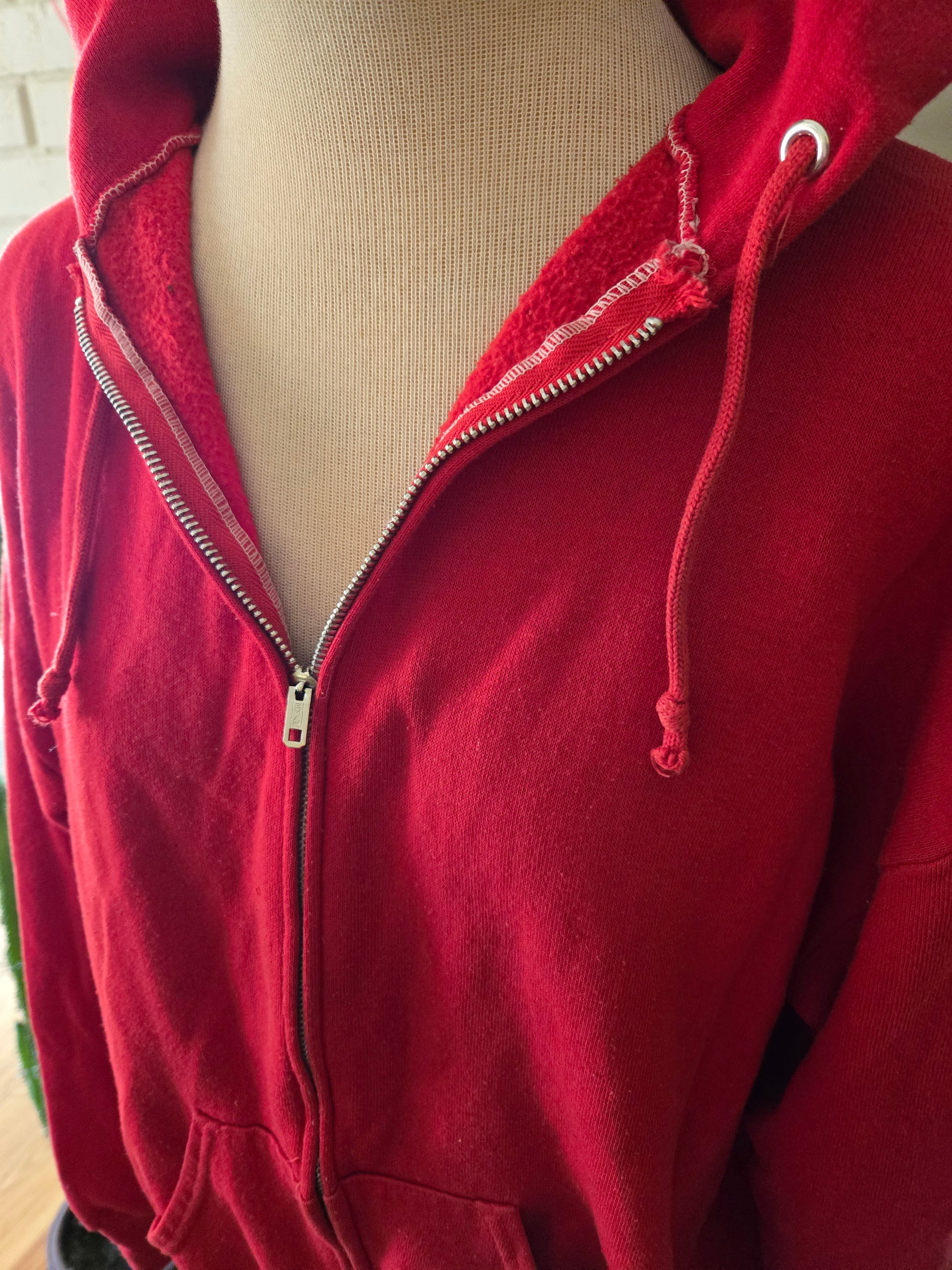 Here is a great vintage hoodie from the 70s or early 80s by Sportswear. 50/50 blend of cotton and polyester, and made in the USA. Red hoodie with zipper front, two pockets on the front, drawstring close. Definite Elliot vibes with this one! It's medium weight, super soft and comfy, and in amazing condition with tons of life left! The tag says Large, but here are the measurements taken laying flat. (refer to the last pic above to see how I measure shirts)