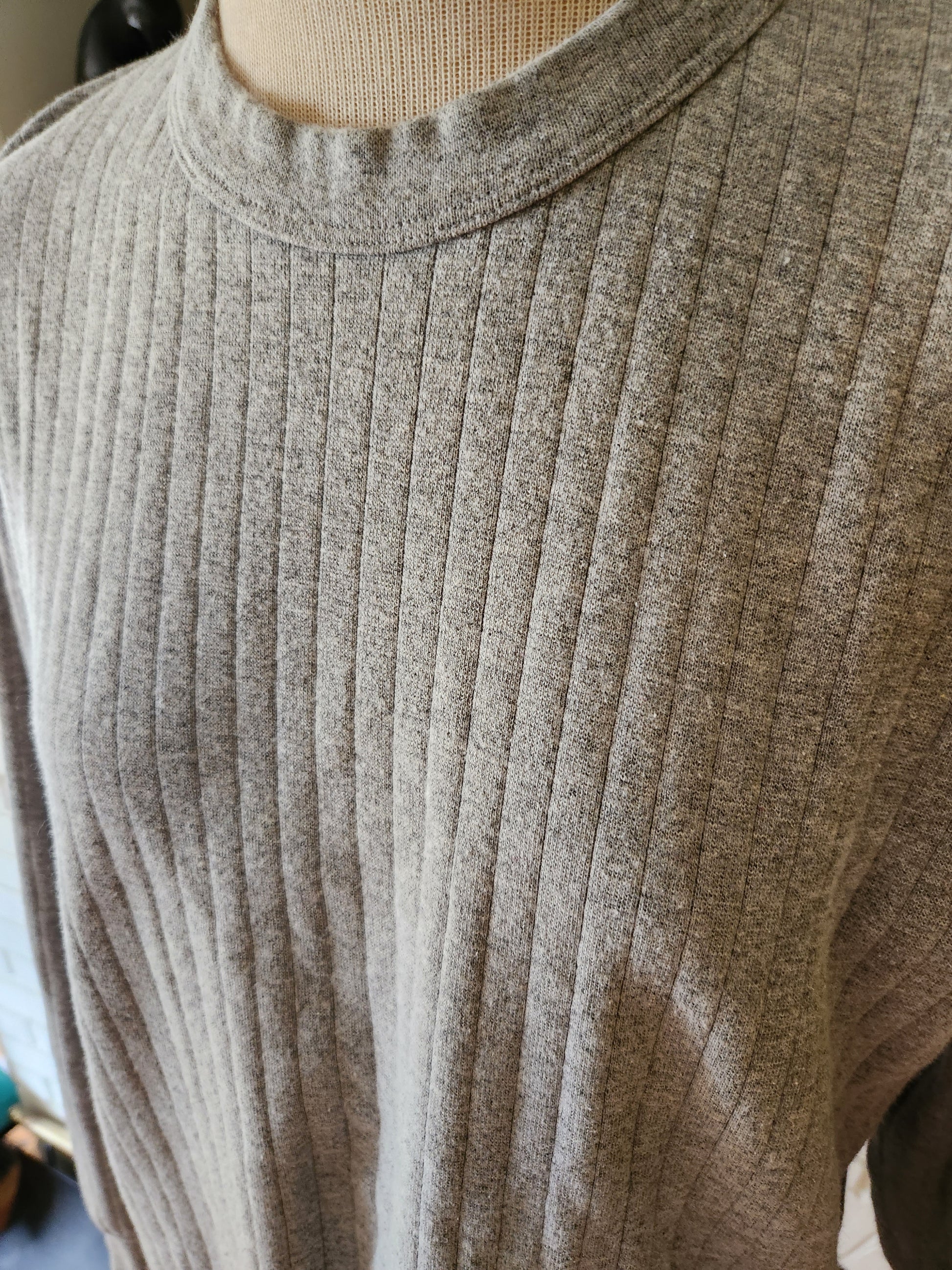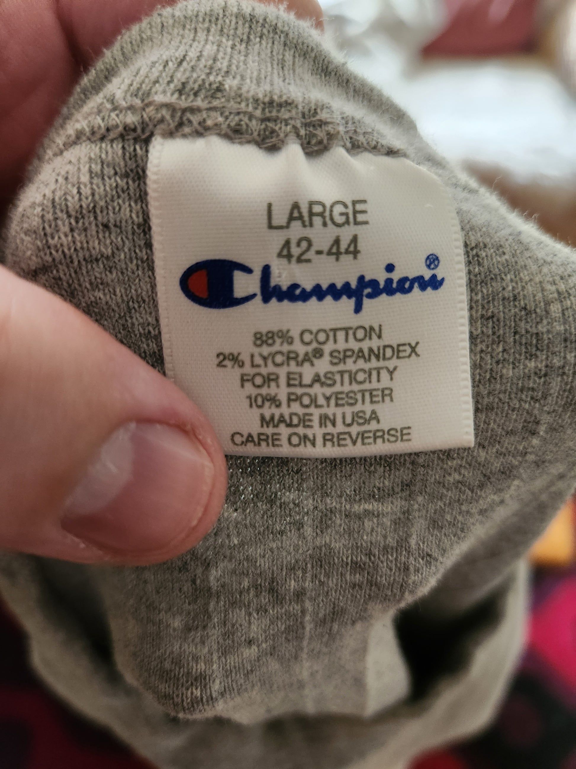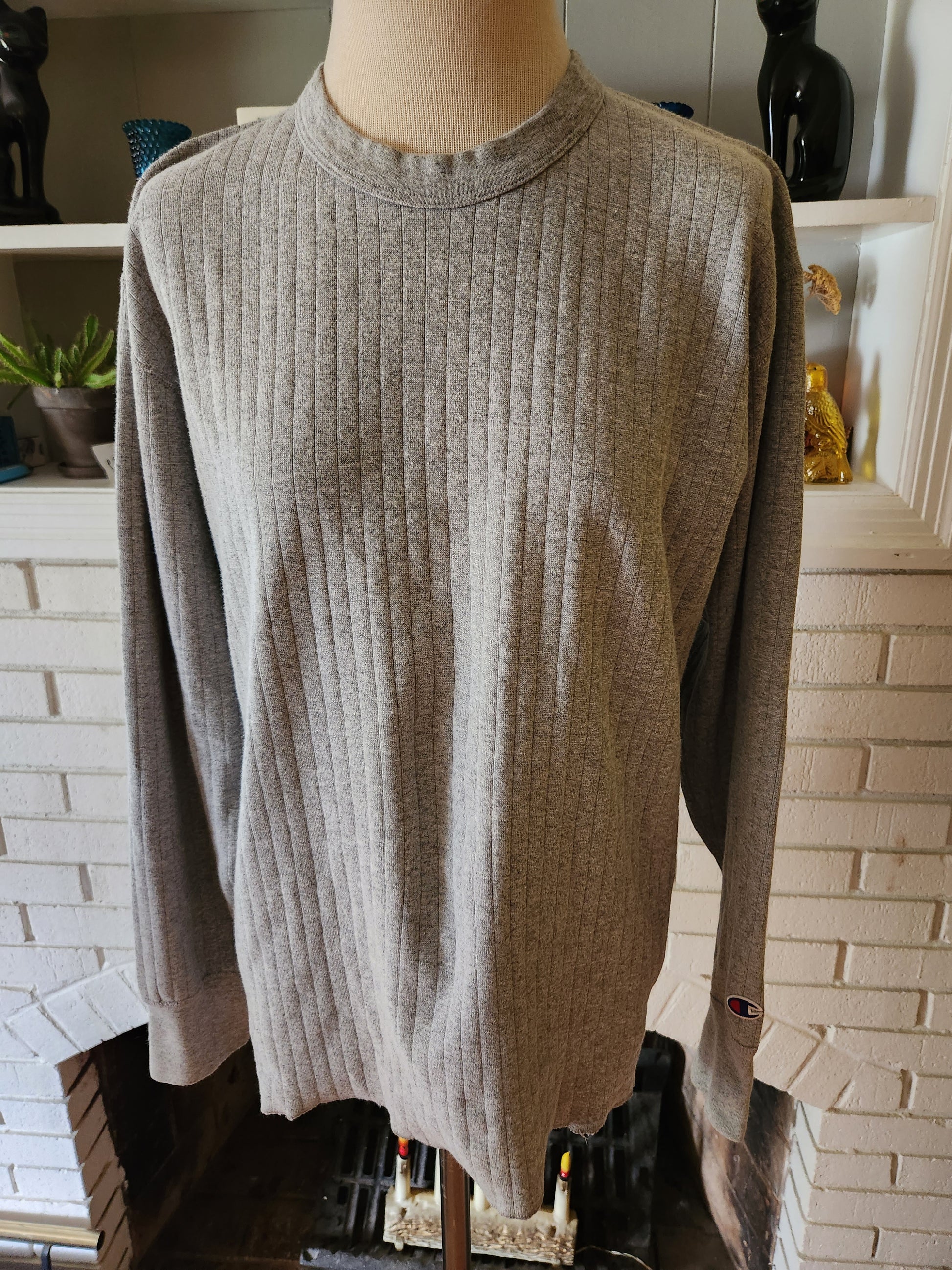 Here is an awesome long sleeve shirt by Champion. 88% cotton, 10% polyester, 2% spandex, and made in the USA. Light gray shirt with vertical ribbed design throughout. Heavier than a t shirt, lighter than a sweatshirt. It's super soft and comfy. It's in amazing condition with tons of life left. The tag says Large, but here are the measurements. (refer to the last pic above to see how I measure shirts)