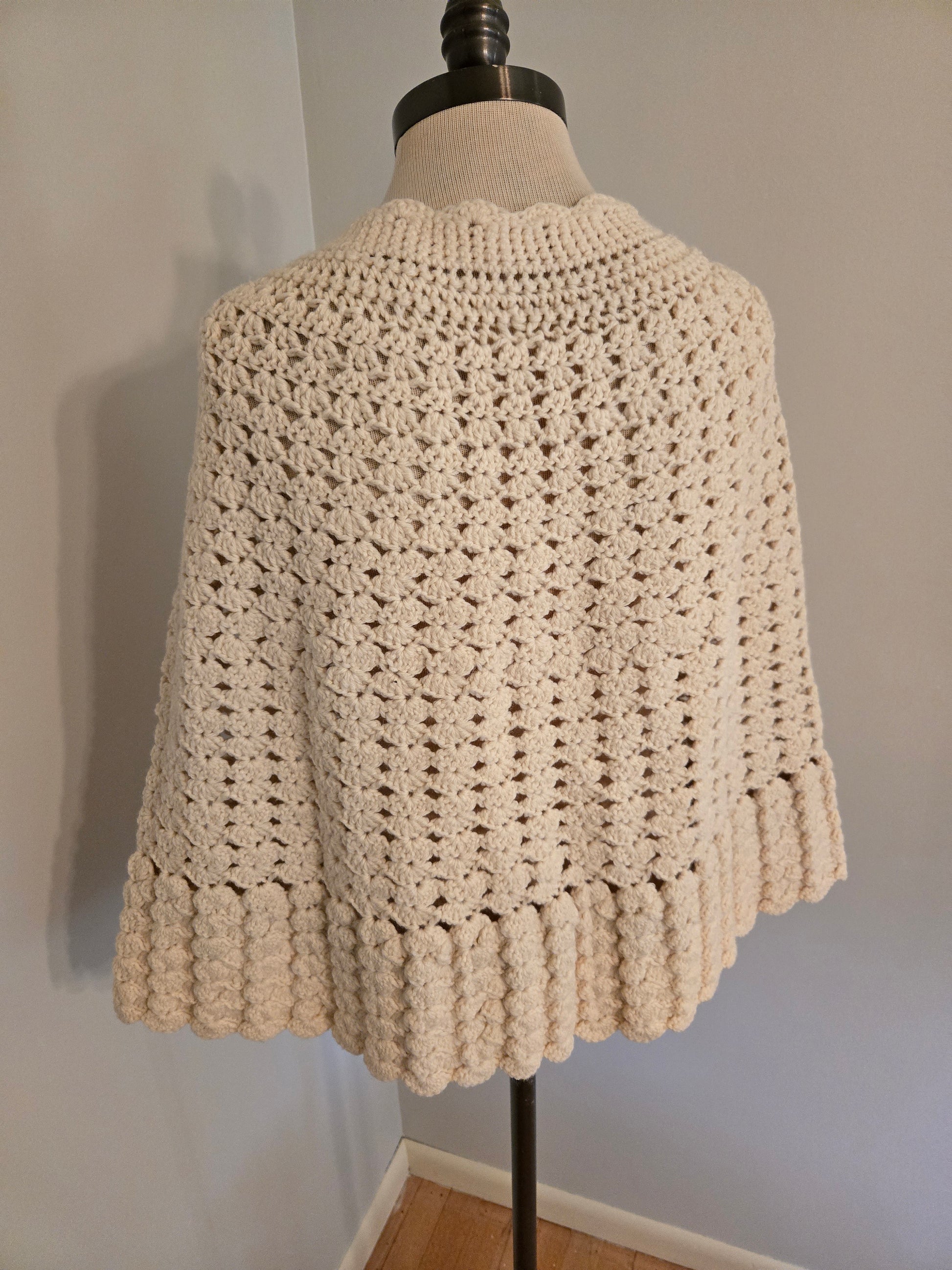 Here is a super cool vintage shawl sweater. It feels like it could be hand made. Hard to pinpoint the era...60s, 70s, 80s...could be any of em! Off white fabric in a very pretty knit pattern. Cute little tassel closure at the front. Medium weight, warm, soft, and comfy. It's in excellent condition with tons of life left. Here are the measurements taken laying flat. (refer to the last pic above to see how I measure shirts)