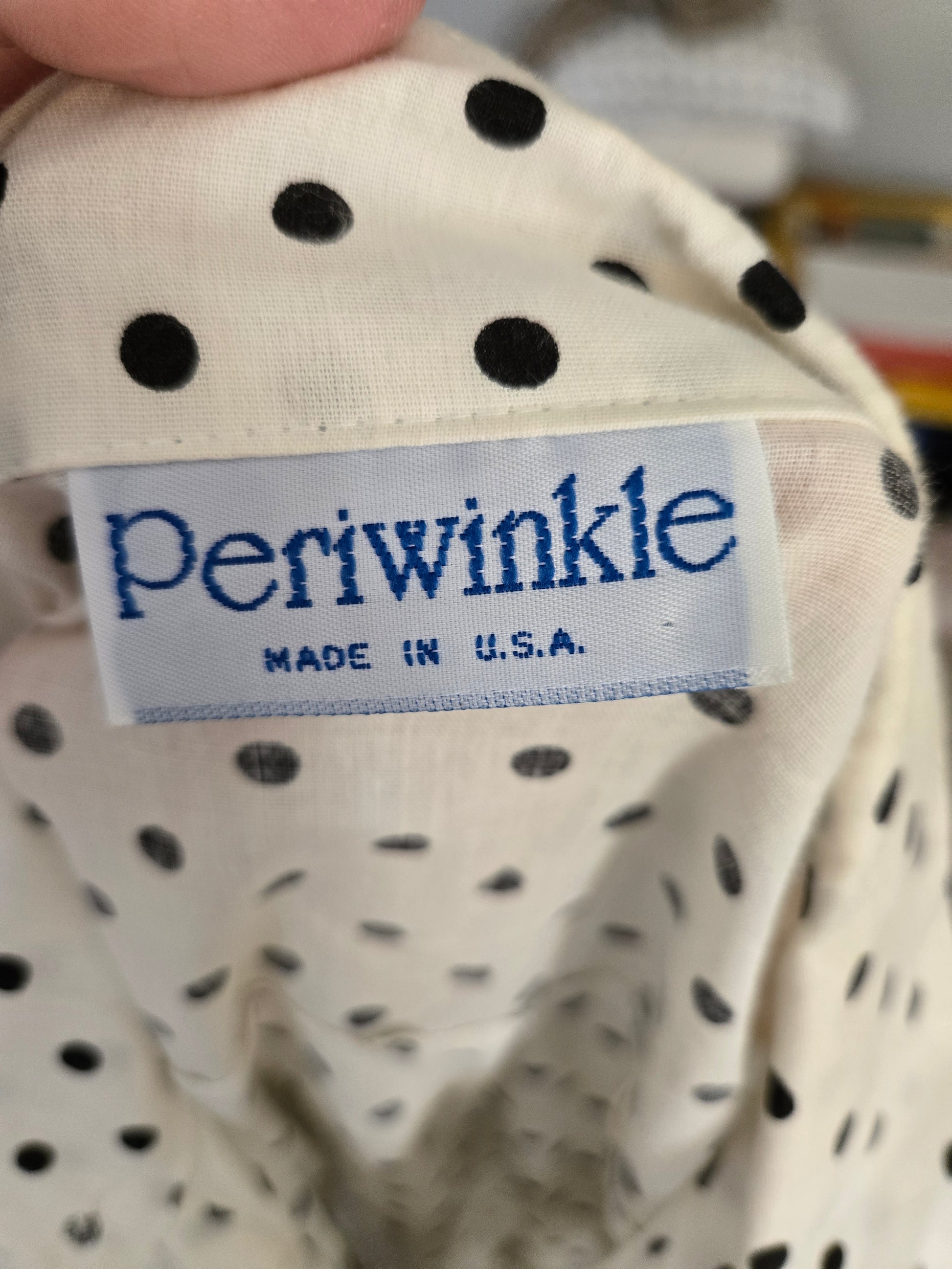Here is a lovely short sleeve dress from the 70s/80s by Periwinkle. Feels like cotton to me, and made in the USA. White dress with black polka dots all over. Eleven buttons down the front, with a button on each cuff and a faux pocket with button on each breast. Fairly large shoulder pads present. Light weight, sheer, soft and comfy. It's in excellent condition with years of life left! The tag says Size 12, but here are the exact measurements taken laying flat (be sure to reference the last photo to see how I measure dresses). PS this one is too large to look good on this small form. The pics don't do it justice. When it's on the right body, it's gonna look amazing!