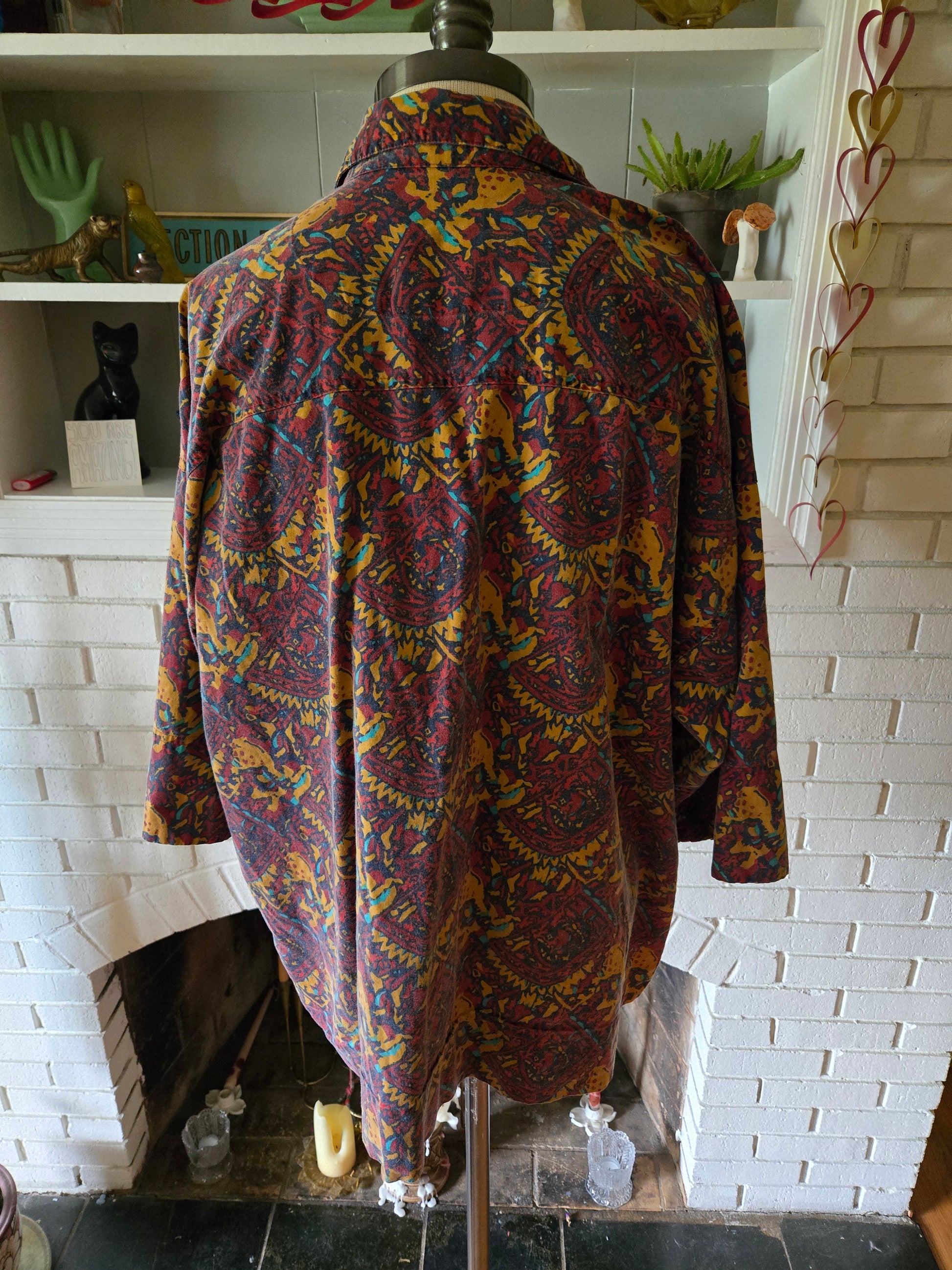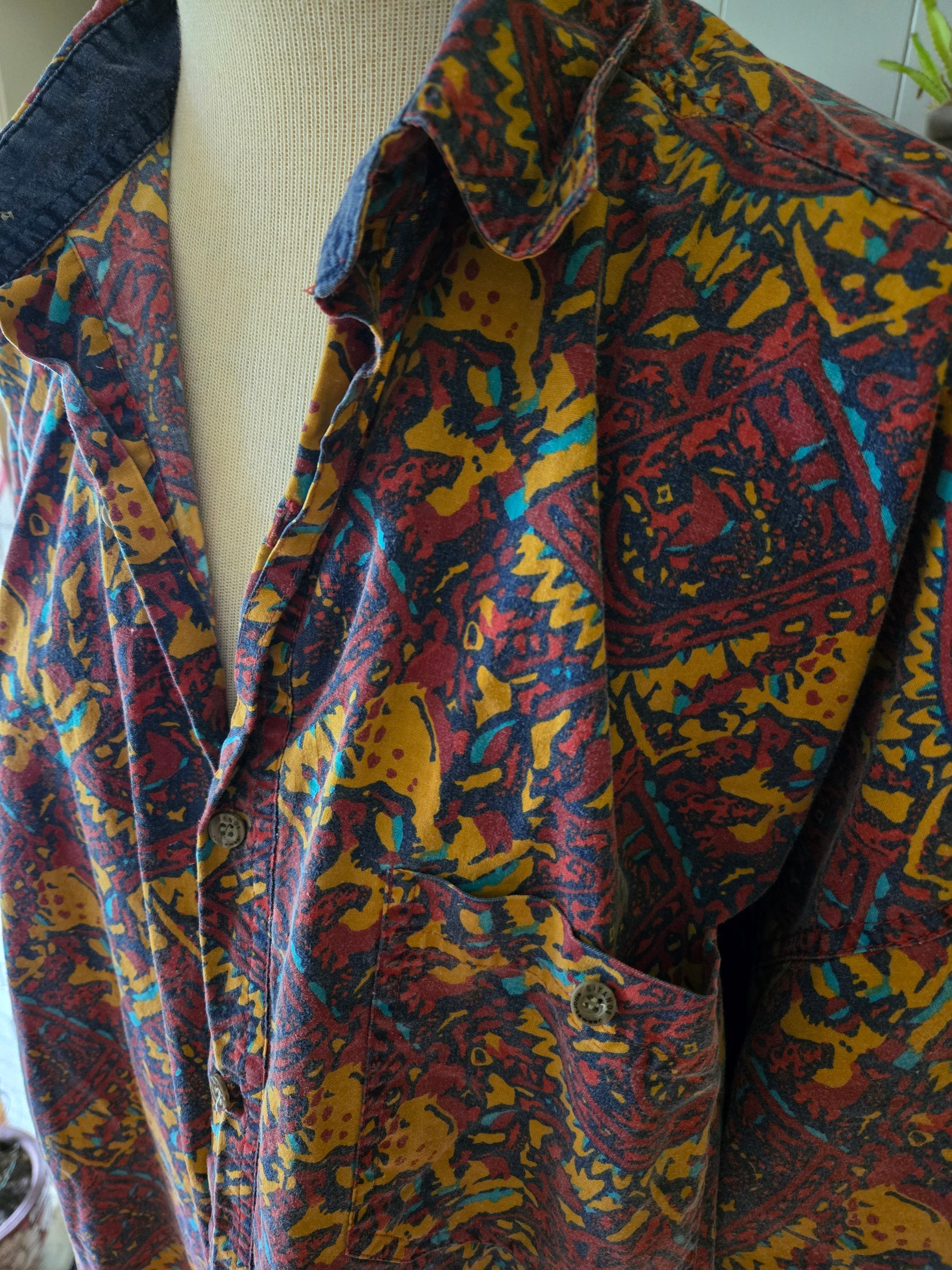 Here is a super cool vintage shirt from the 80s/90s by Gitano. 100% cotton. Funky and colorful abstract print throughout. Six button front with a buttoned pocket on the left breast. Medium weight, soft and comfy. The tag says Size XL, but here are the measurements taken laying flat. (refer to the last pic above to see how I measure shirts)