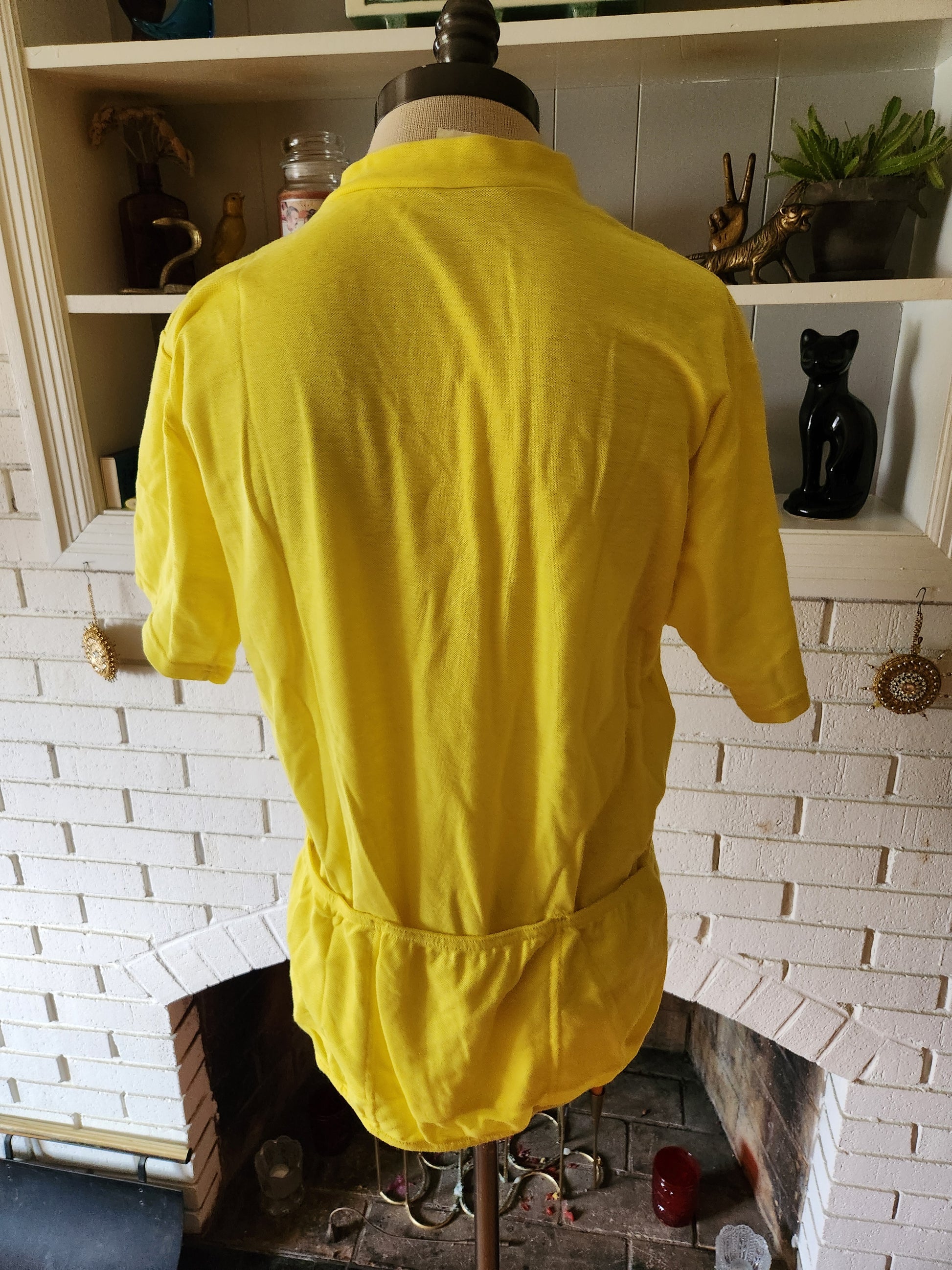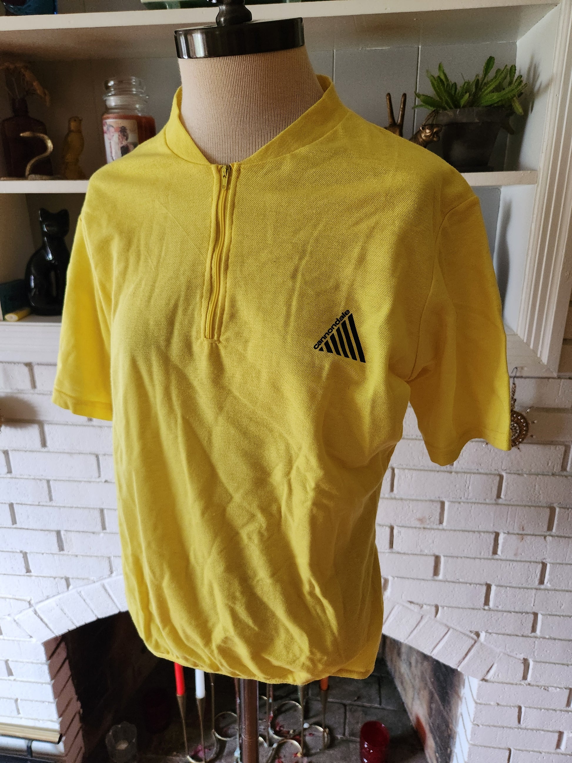 Here is a super cool short sleeve shirt by Cannondale. 50/50 cotton and polyester blend. Vibrant yellow shirt with Cannondale logo on the left breast. Six inch zipper front. Three section pocket on the back. Fairly light weight, soft, and comfy. It's in amazing shape with tons of life left! The tag says XL, but here are the measurements. (refer to the last pic above to see how I measure shirts)