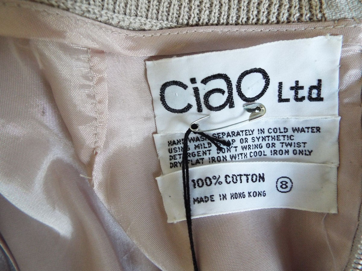 This is a smart and classy looking dress by Ciao Limited. It might be from the 80's, but I'm calling it 1970's. It's 100% cotton. It has a knit top, which features a checkerboard pattern of off white and tan, with tan twill bottom. Also has a nice 3 button feature on the shoulders, and rather sizable shoulder pads in there too. The waist is elastic, so there is some give in that measurement. The size says 8, but here are the exact measurements. (be sure to reference the last photo to see how I measure dresses)