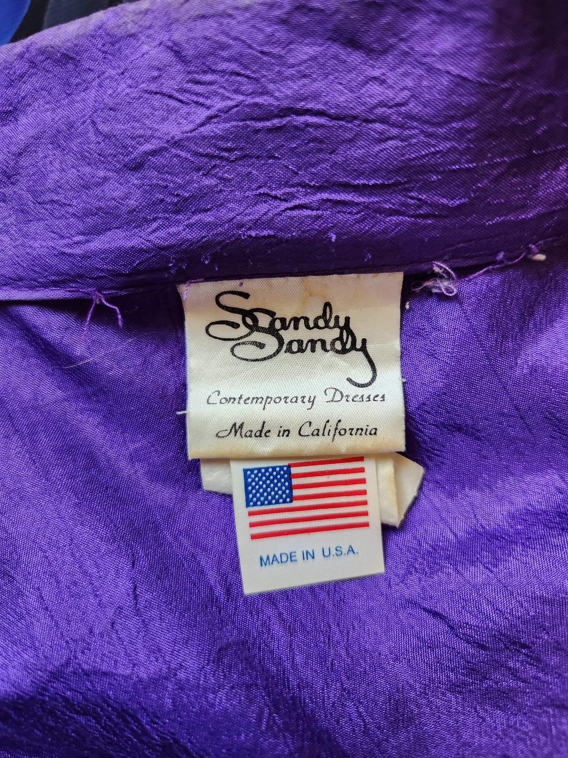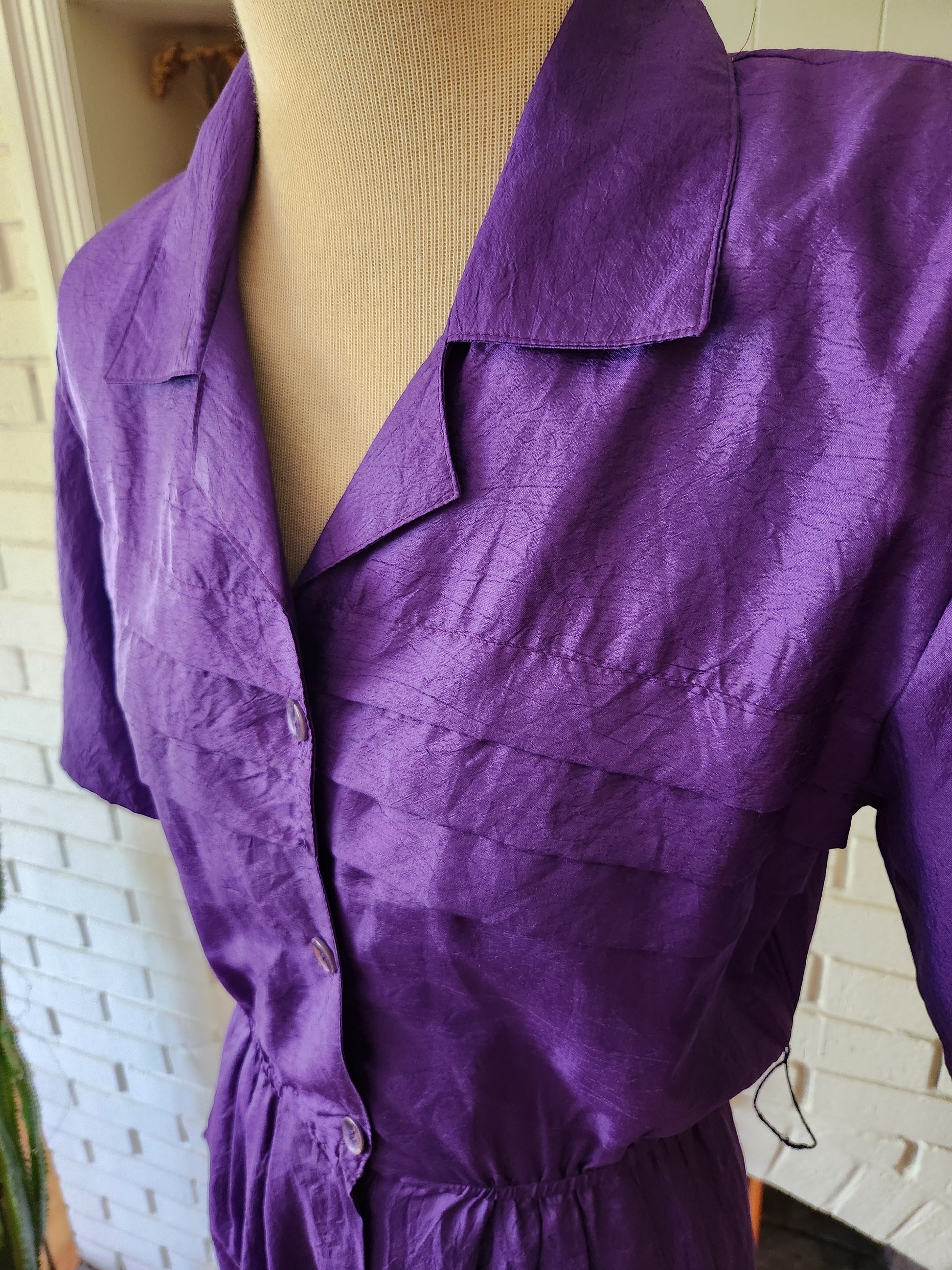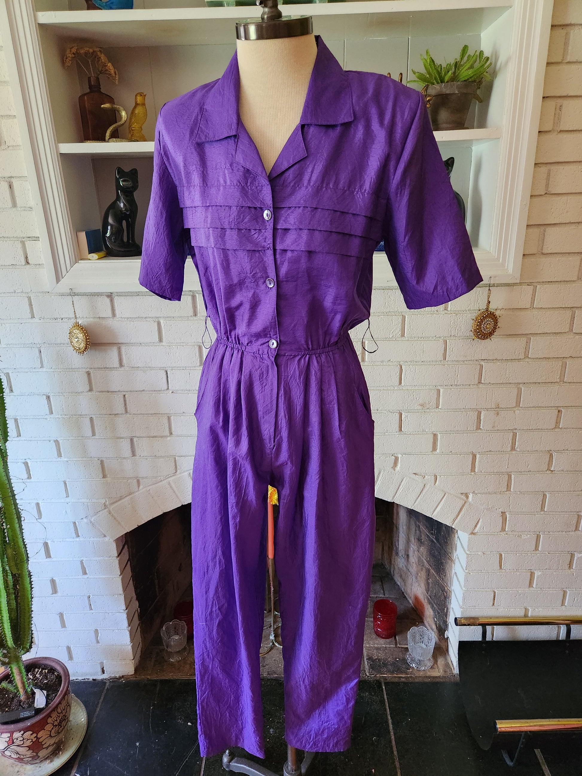This is a rad short sleeve jumpsuit from the 80s by Sandy Sandy. 100% polyester and made in the USA. Purple fabric with great shape to it. Three sewn in stripe details across the chest. Three button front with zipper below them, shoulder pads, and a pocket on each hip. It includes a matching belt (not pictured). Super thin, incredibly light weight, sheer, soft, and comfy. It's in amazing condition with years of life left. The tag says Size 8, but here are the exact measurements taken laying flat. (be sure to reference the last photo to see how I measure dresses)